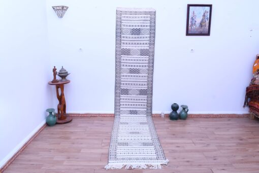 سجادة تيفلت كيليم هذه، بمقاس 74.00 × 370.00 سم، تُبرز تشكيلةً متقنةً من الأنماط الهندسية والزخارف التقليدية، التي تُميّز التصميم المغربي. يُضفي هذا المزيج الرائع من الماس والنقوش الخطية لمسةً من الأصالة والأناقة الثقافية.