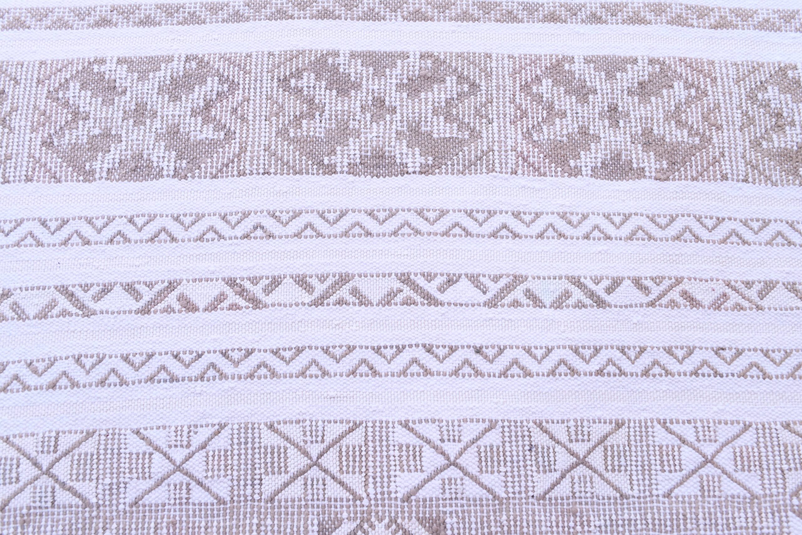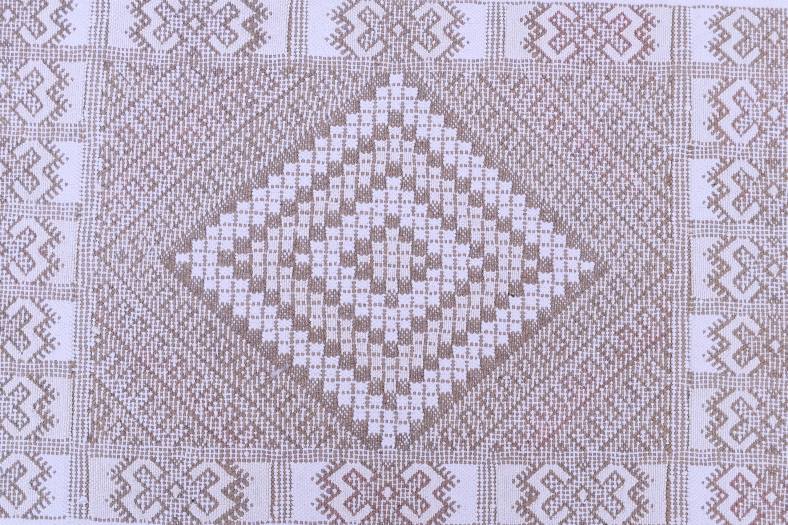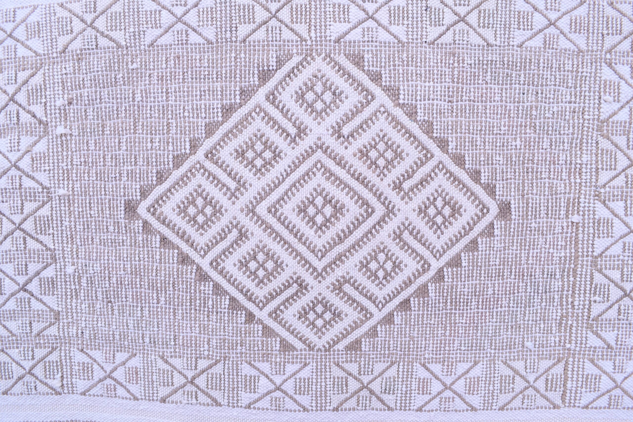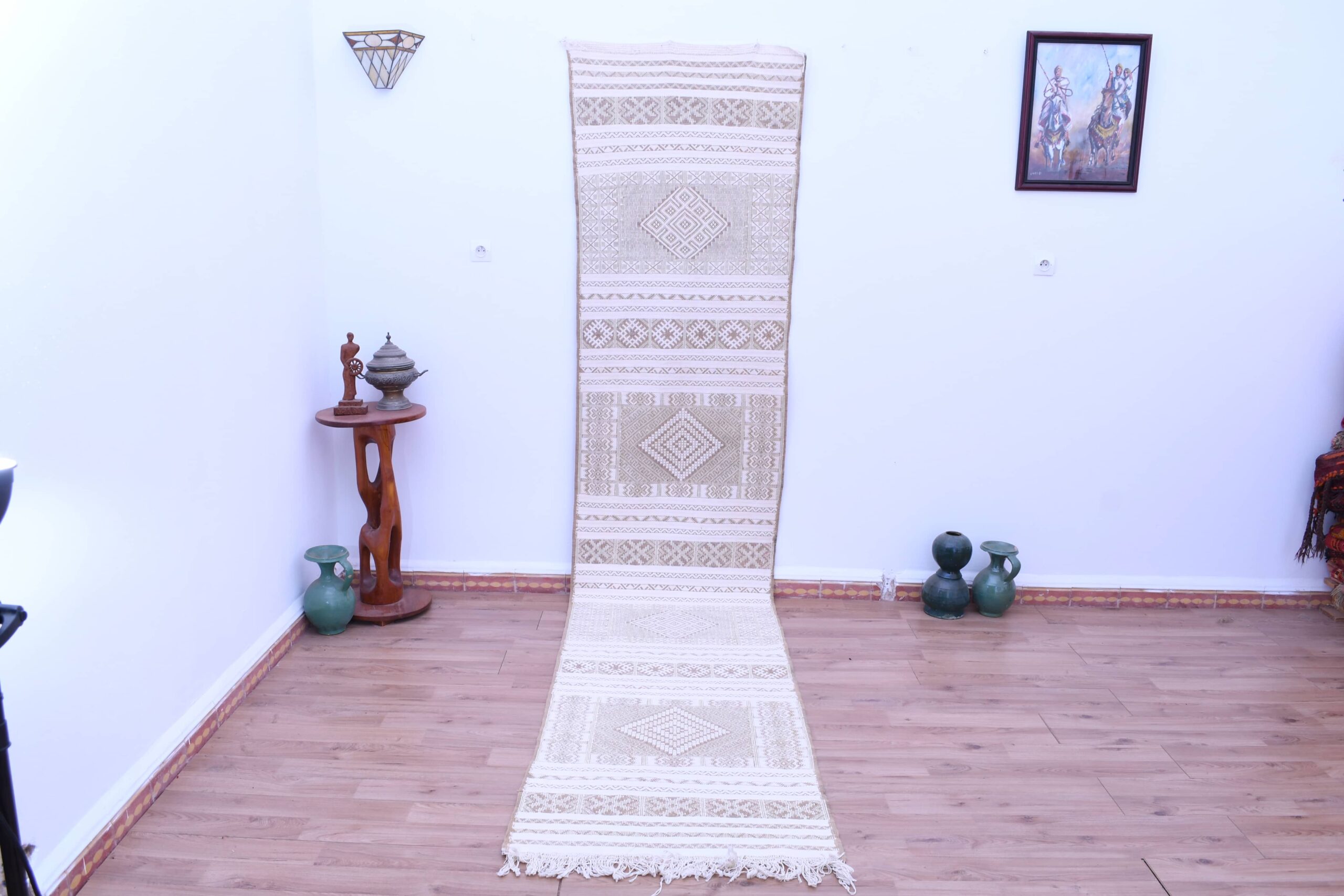 سجادة تيفلت كيليم الرائعة هذه، بمقاس 79.00 × 377.00 سم، تتميز بتصميم هندسي معقد. يتميز النمط بسلسلة من الزخارف المتماثلة، بما في ذلك الماس والصلبان، وهي زخارف تقليدية في النسيج المغربي. نسجت هذه الزخارف بمهارة فائقة لخلق جمالية متناغمة ومتوازنة تجمع بين العصرية والخلود.