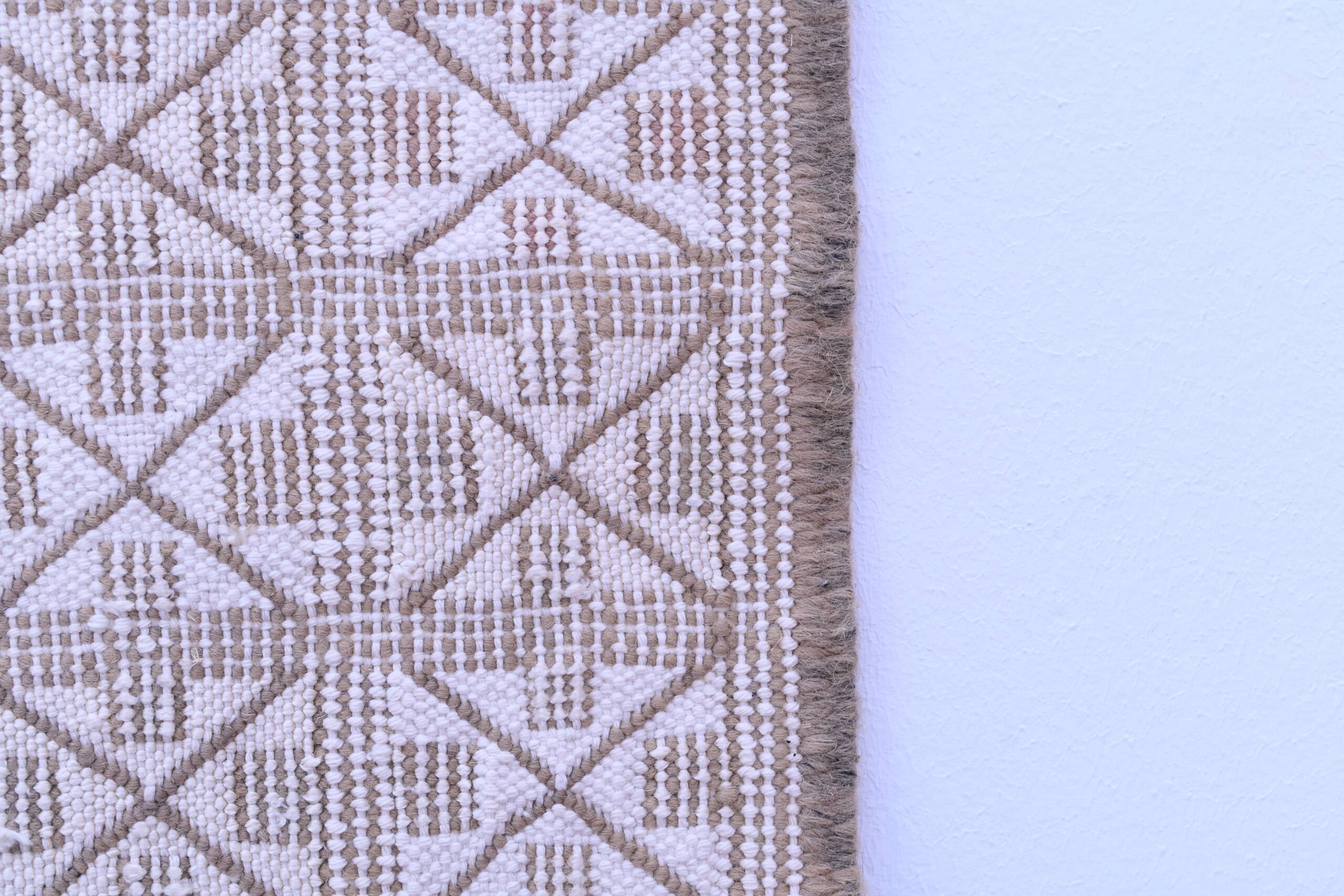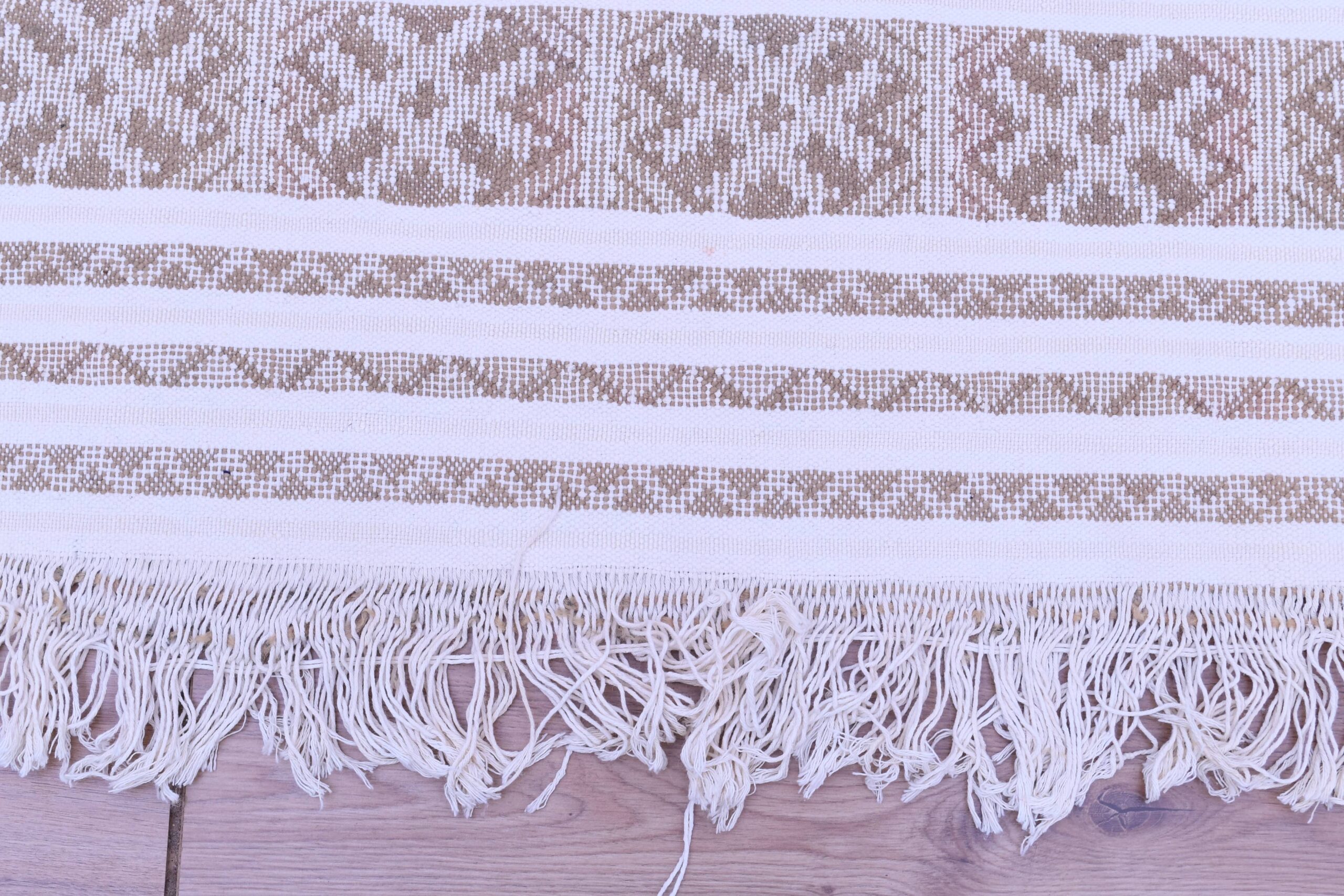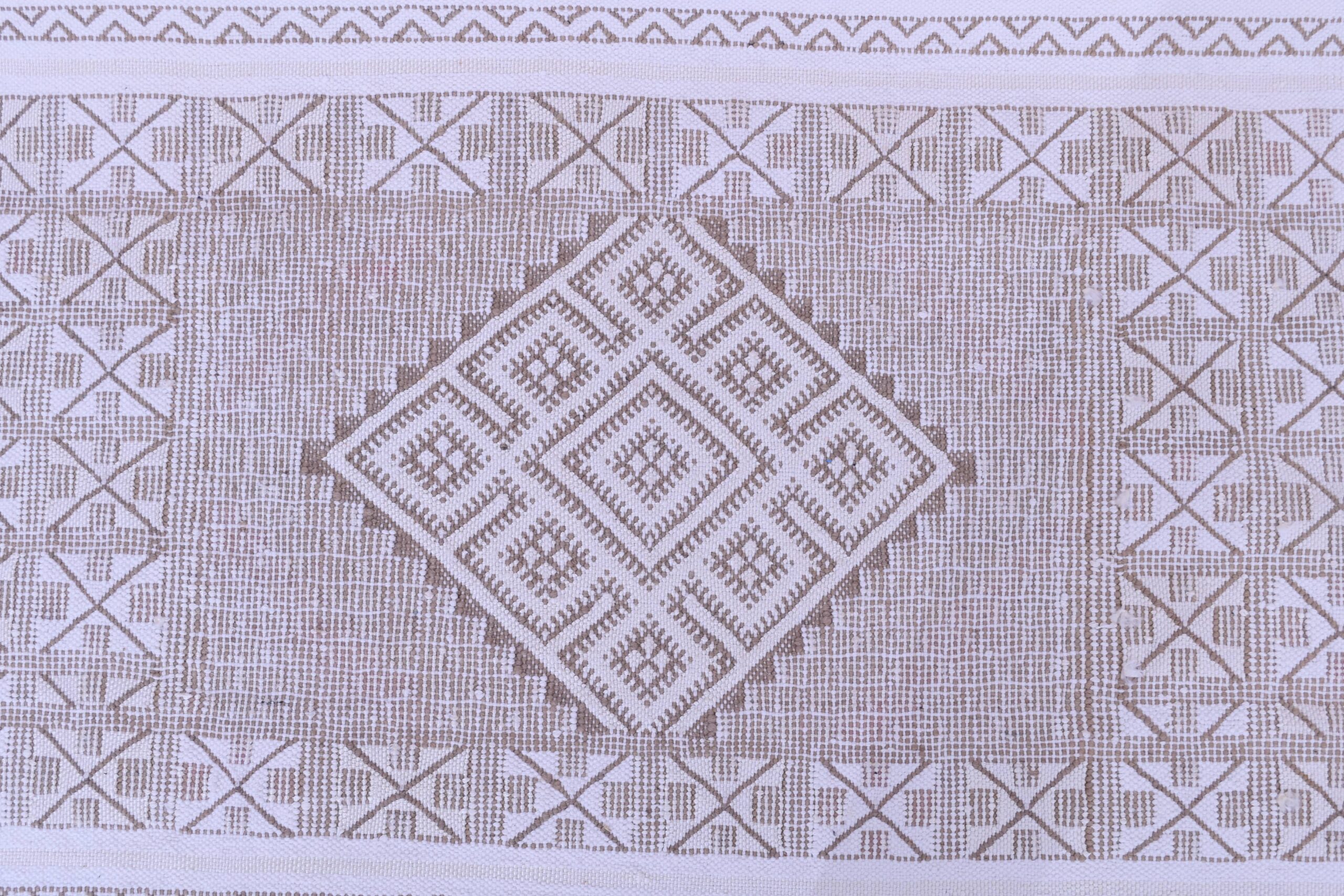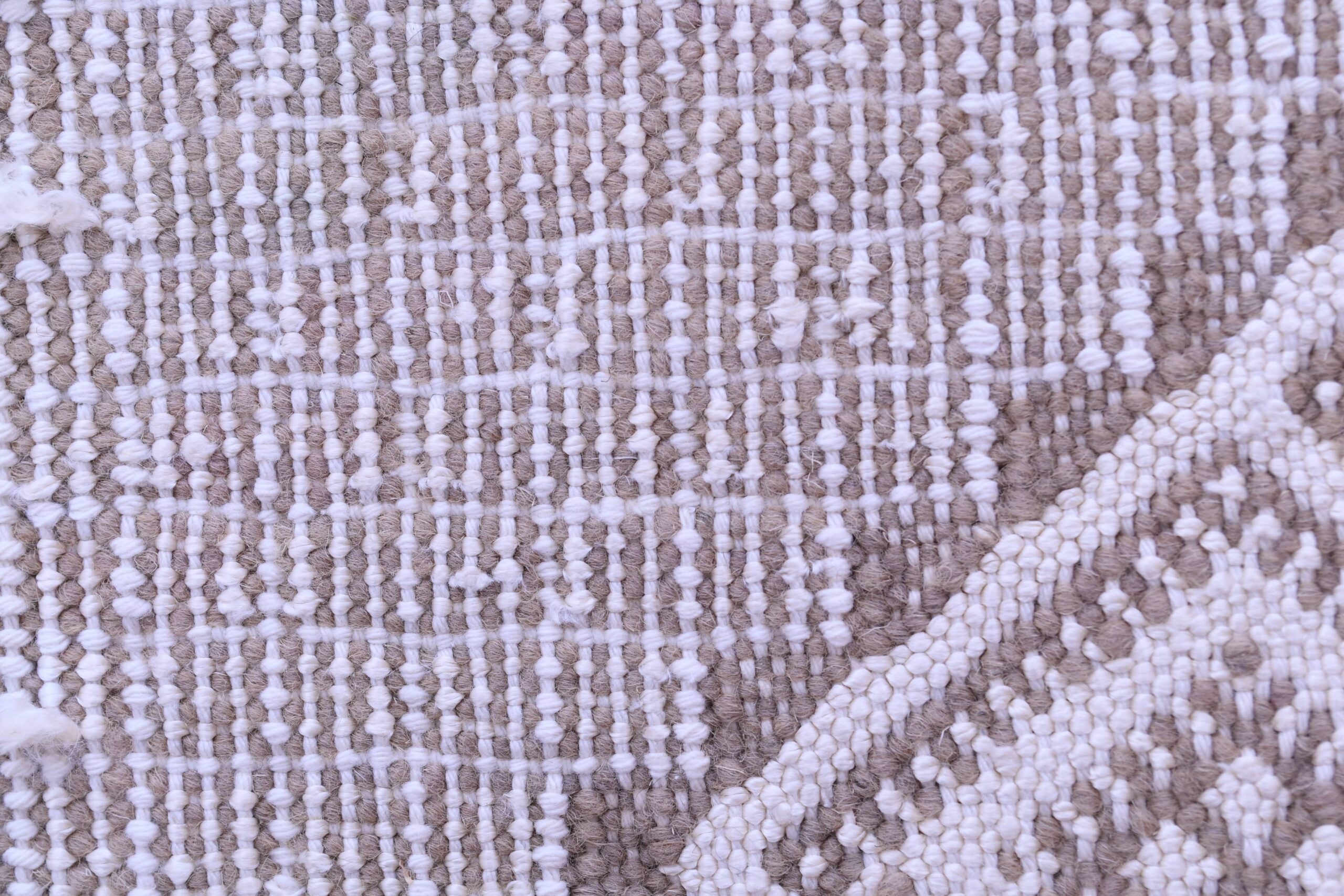 سجادة تيفلت كيليم الرائعة هذه، بمقاس 79.00 × 377.00 سم، تتميز بتصميم هندسي معقد. يتميز النمط بسلسلة من الزخارف المتماثلة، بما في ذلك الماس والصلبان، وهي زخارف تقليدية في النسيج المغربي. نسجت هذه الزخارف بمهارة فائقة لخلق جمالية متناغمة ومتوازنة تجمع بين العصرية والخلود.