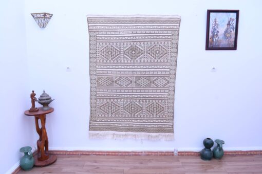 سجادة تيفلت كيليم الرائعة هذه، بأبعاد 124.00 × 172.00 سم، تتميز بتصميمها المتقن الذي يجسد التراث الثقافي الغني للفن المغربي. تتميز السجادة بسلسلة من الزخارف الهندسية، بما في ذلك الأشكال الماسية والأنماط الخطية المعقدة، مما يخلق جمالية متناغمة ومتوازنة. تُعد هذه الزخارف رمزًا تقليديًا في الثقافة المغربية، وغالبًا ما ترمز إلى الحماية والرخاء.