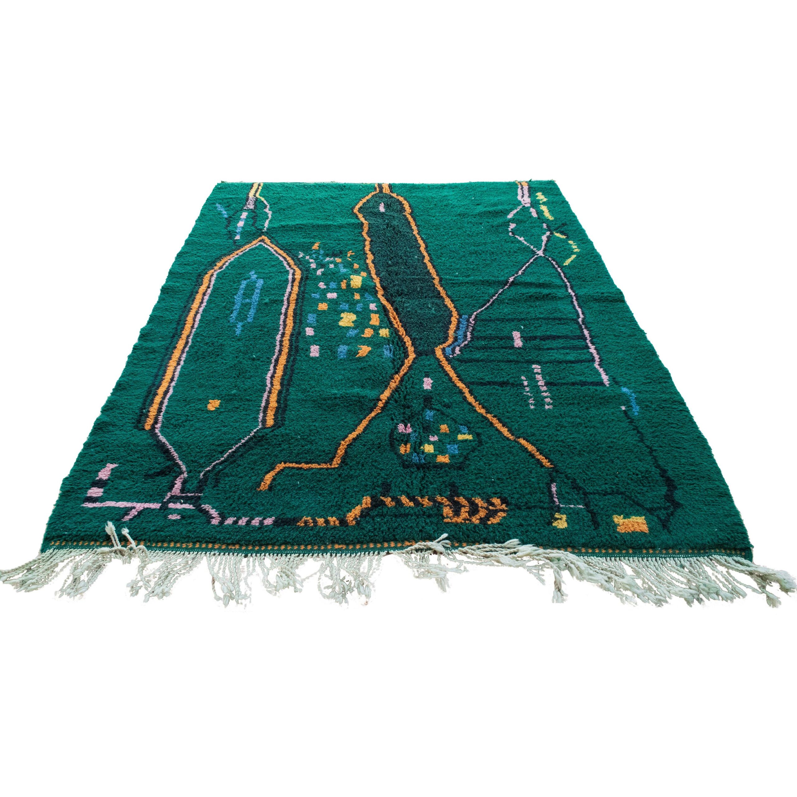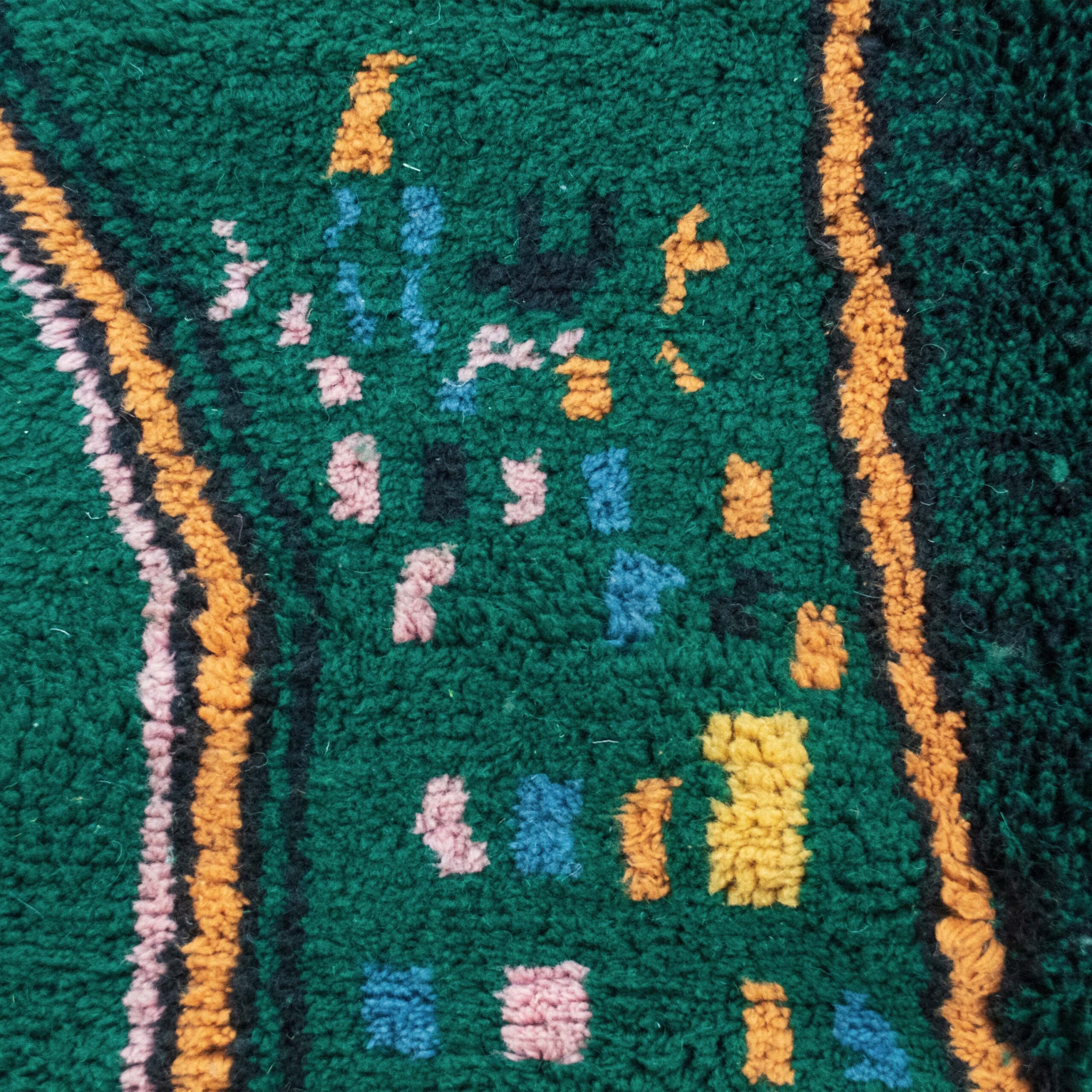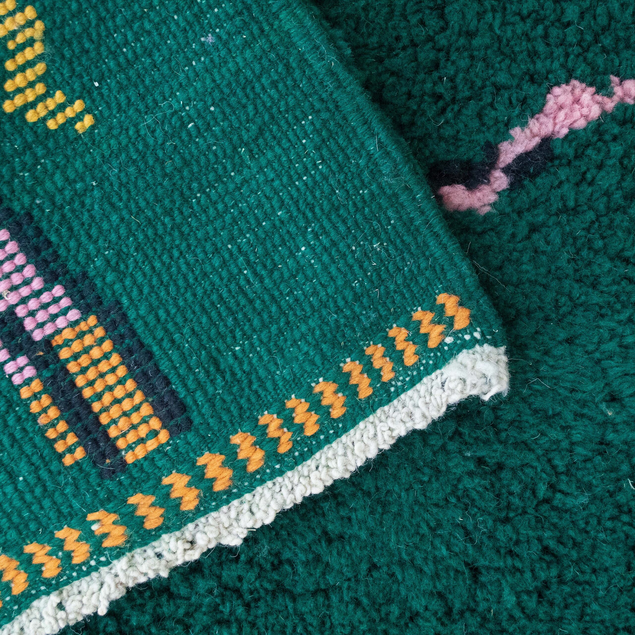 This authentic handmade Moroccan rug is a bold, modern statement piece for an American home. Woven from 100% wool, this Moroccan rug brings rich emerald green color with playful geometric/abstract lines—perfect as a living room area rug, bedroom rug, or cozy reading nook anchor. Made by 3rd generation Berber artisans and fair trade certified, it’s the kind of wool rug that instantly makes a space feel curated, warm, and collected.