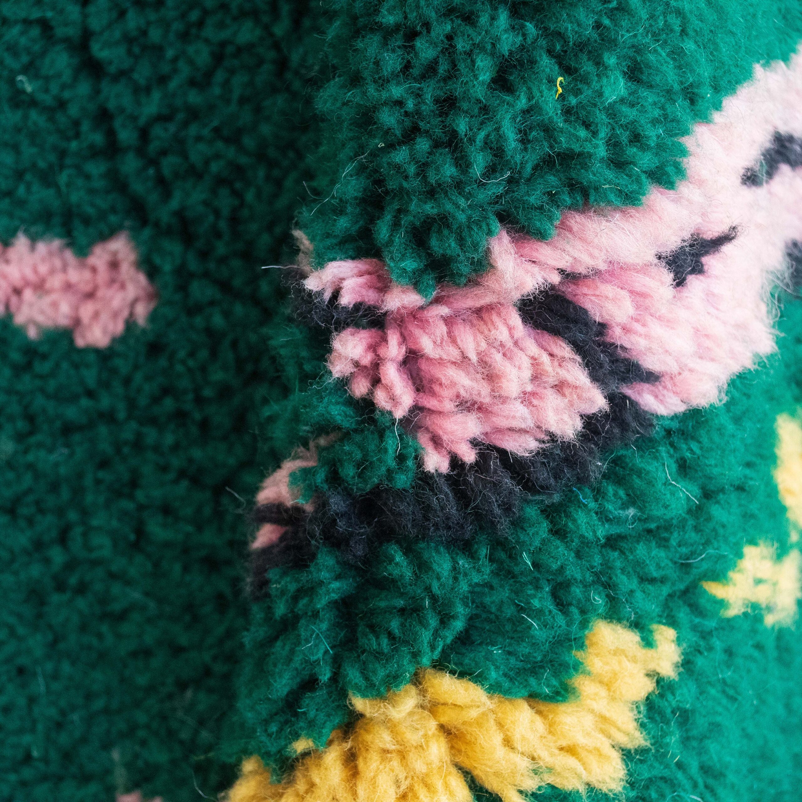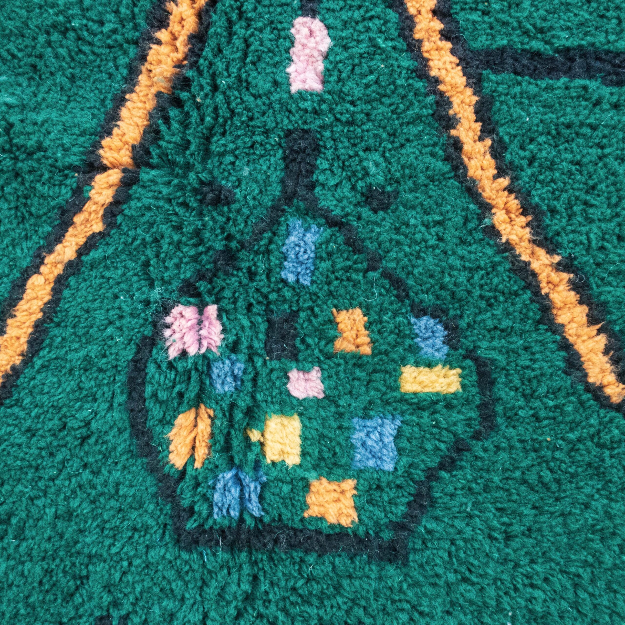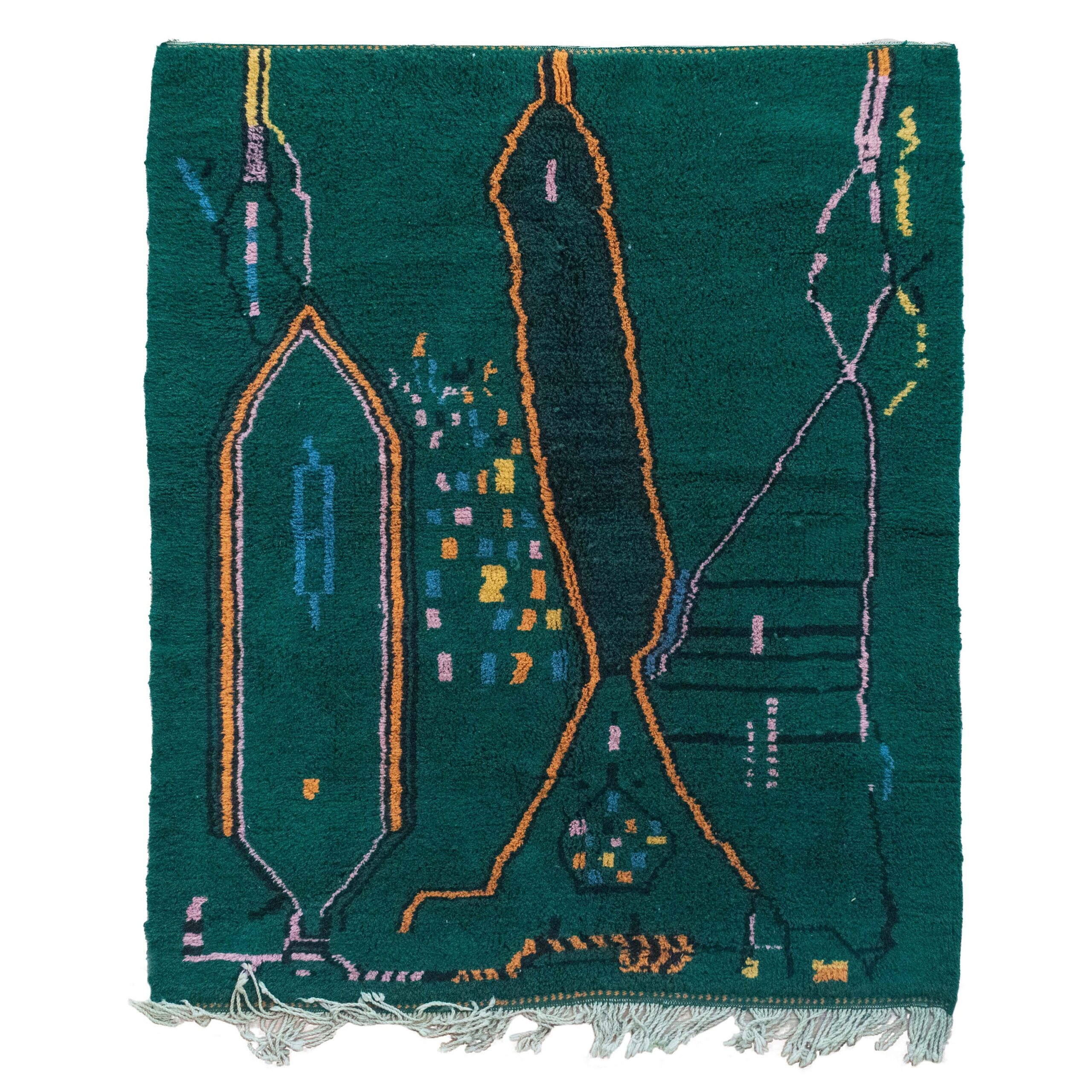 This authentic handmade Moroccan rug is a bold, modern statement piece for an American home. Woven from 100% wool, this Moroccan rug brings rich emerald green color with playful geometric/abstract lines—perfect as a living room area rug, bedroom rug, or cozy reading nook anchor. Made by 3rd generation Berber artisans and fair trade certified, it’s the kind of wool rug that instantly makes a space feel curated, warm, and collected.