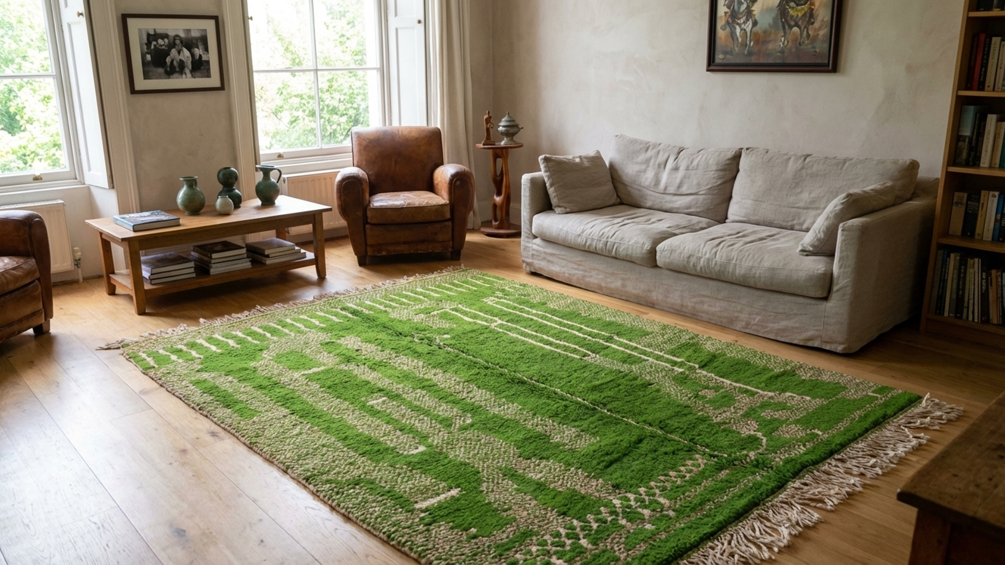 🛋 غرفة المعيشة: ضعها تحت الأريكة أو كسجادة مميزة في منتصف الغرفة