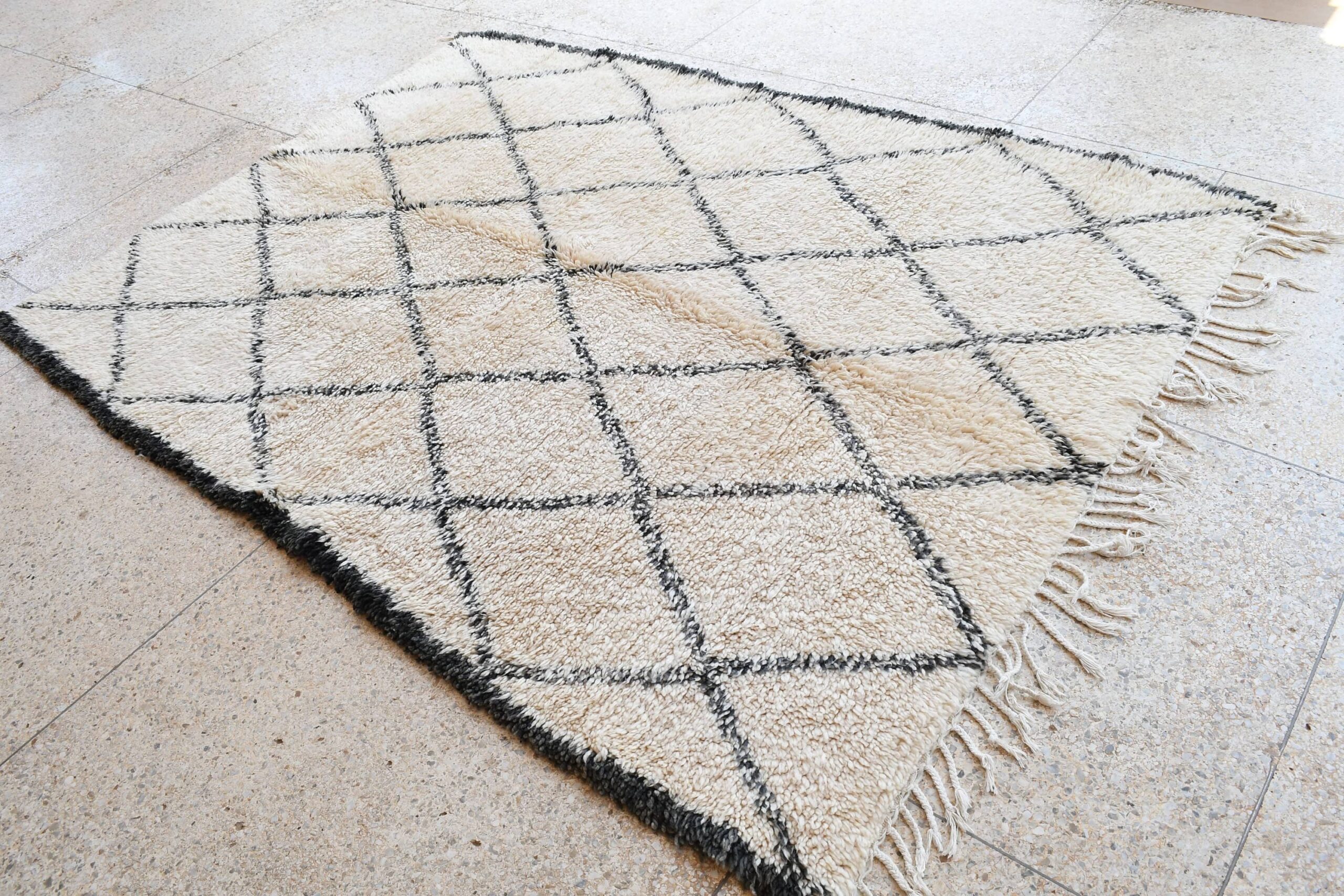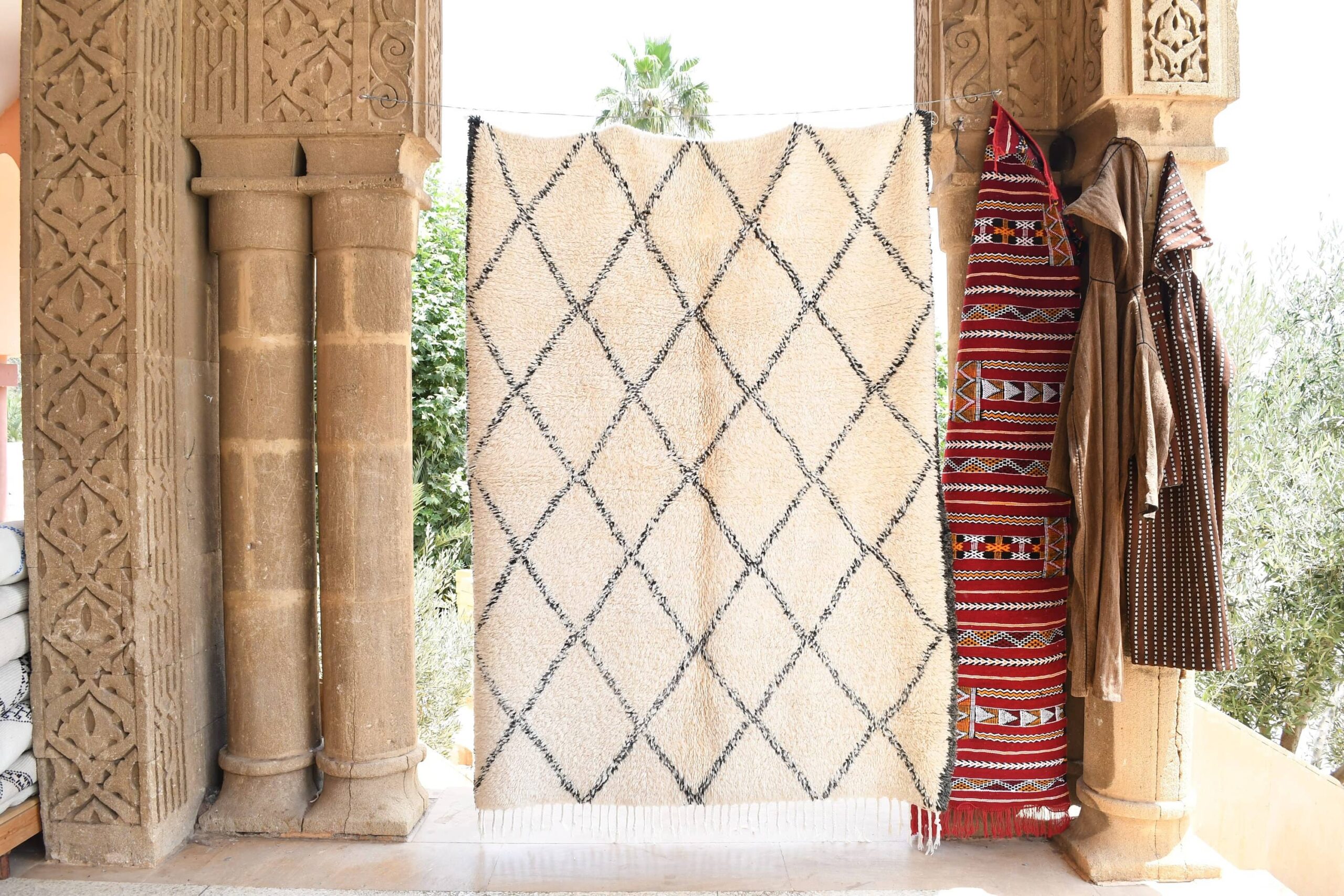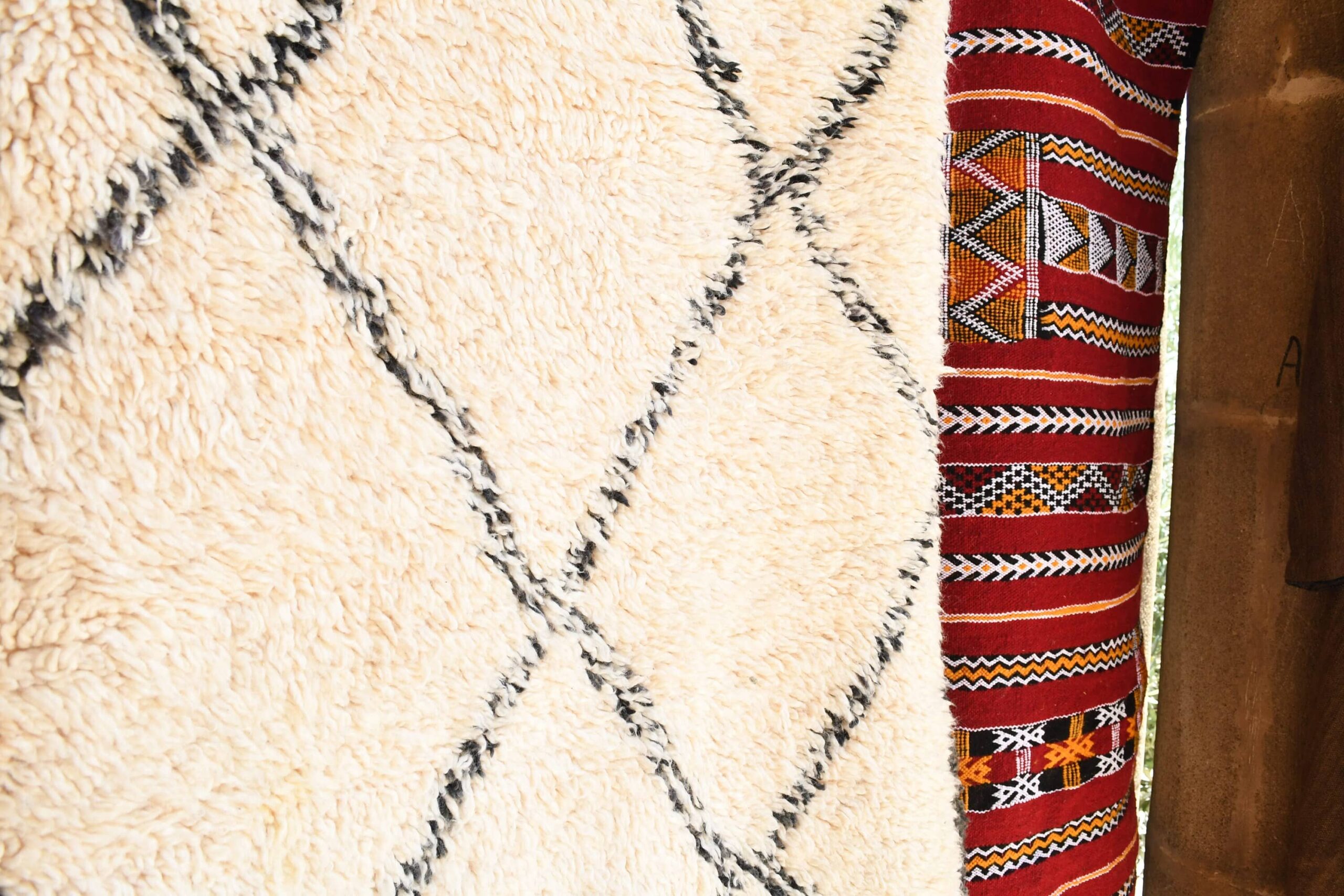 يتميز هذا السجاد بمظهر أنيق وراقي: صوف عاجي ناعم بخطوط سوداء بسيطة على شكل شبكة ماسية (نمط "السجاد المغربي الأبيض والأسود" الشهير الذي يبحث عنه الكثير من المشترين الأمريكيين). يمنح ملمسه الفاخر راحة فائقة للقدمين، ويضفي عمقًا على الغرف ذات الألوان المحايدة. استخدميه كسجادة في غرفة المعيشة مع أريكة من الكتان وألوان خشبية، أو كسجادة في غرفة النوم لتخفيف حدة الأرضيات الخشبية. يتناغم هذا السجاد الصوفي بشكل رائع مع أنماط الديكور المختلفة، مثل الطراز الريفي الحديث، وطراز منتصف القرن الحديث، والطراز البوهيمي الساحلي، والطراز البسيط.
