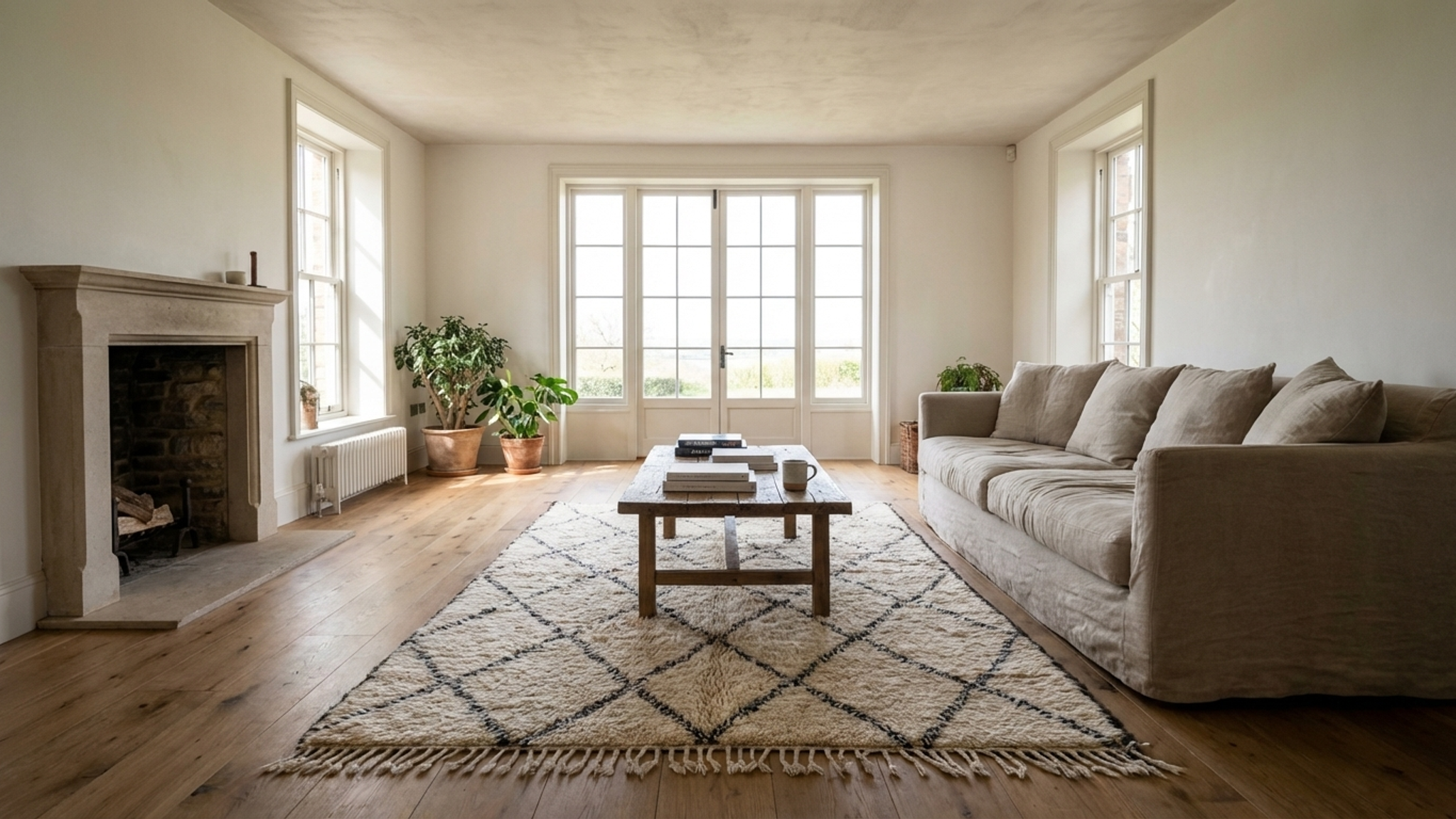 🛋 غرفة المعيشة: ضعها تحت الأريكة أو كسجادة مميزة في منتصف الغرفة