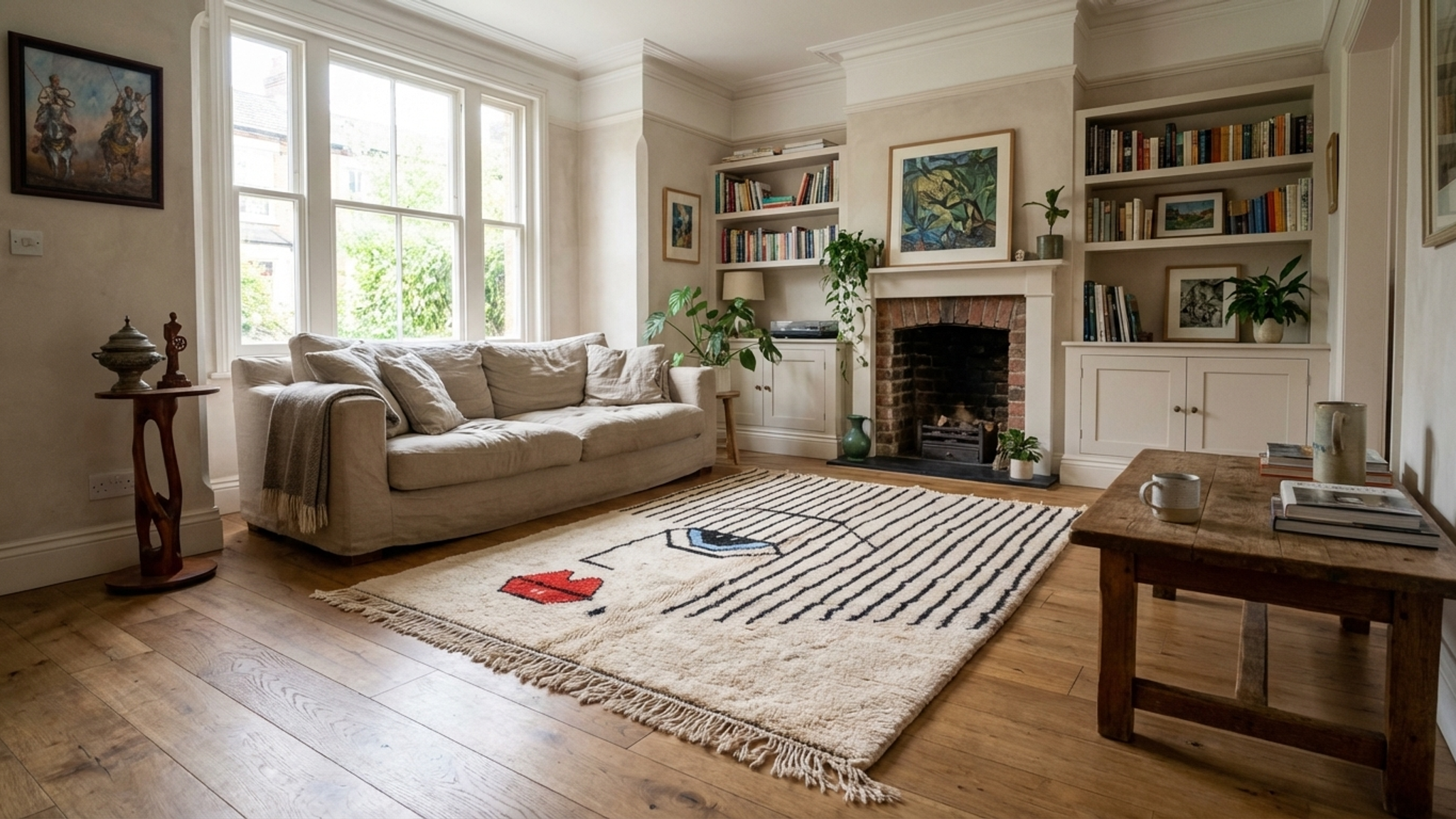 🛋 غرفة المعيشة: ضعها تحت الأريكة أو كسجادة مميزة في منتصف الغرفة