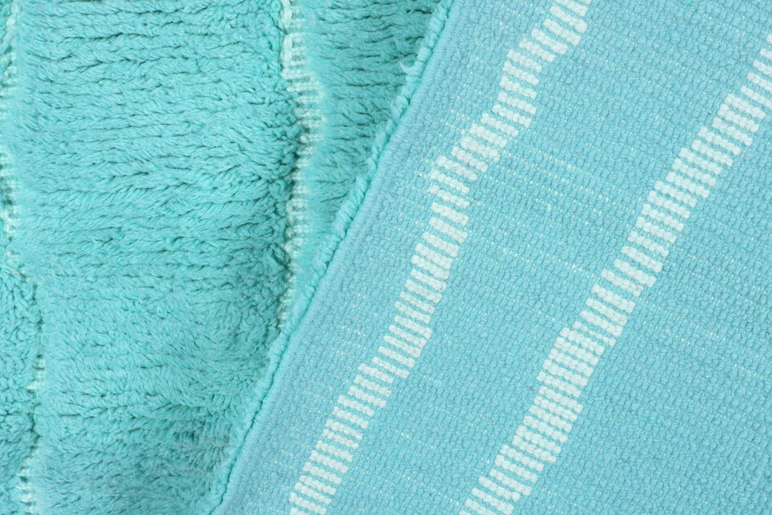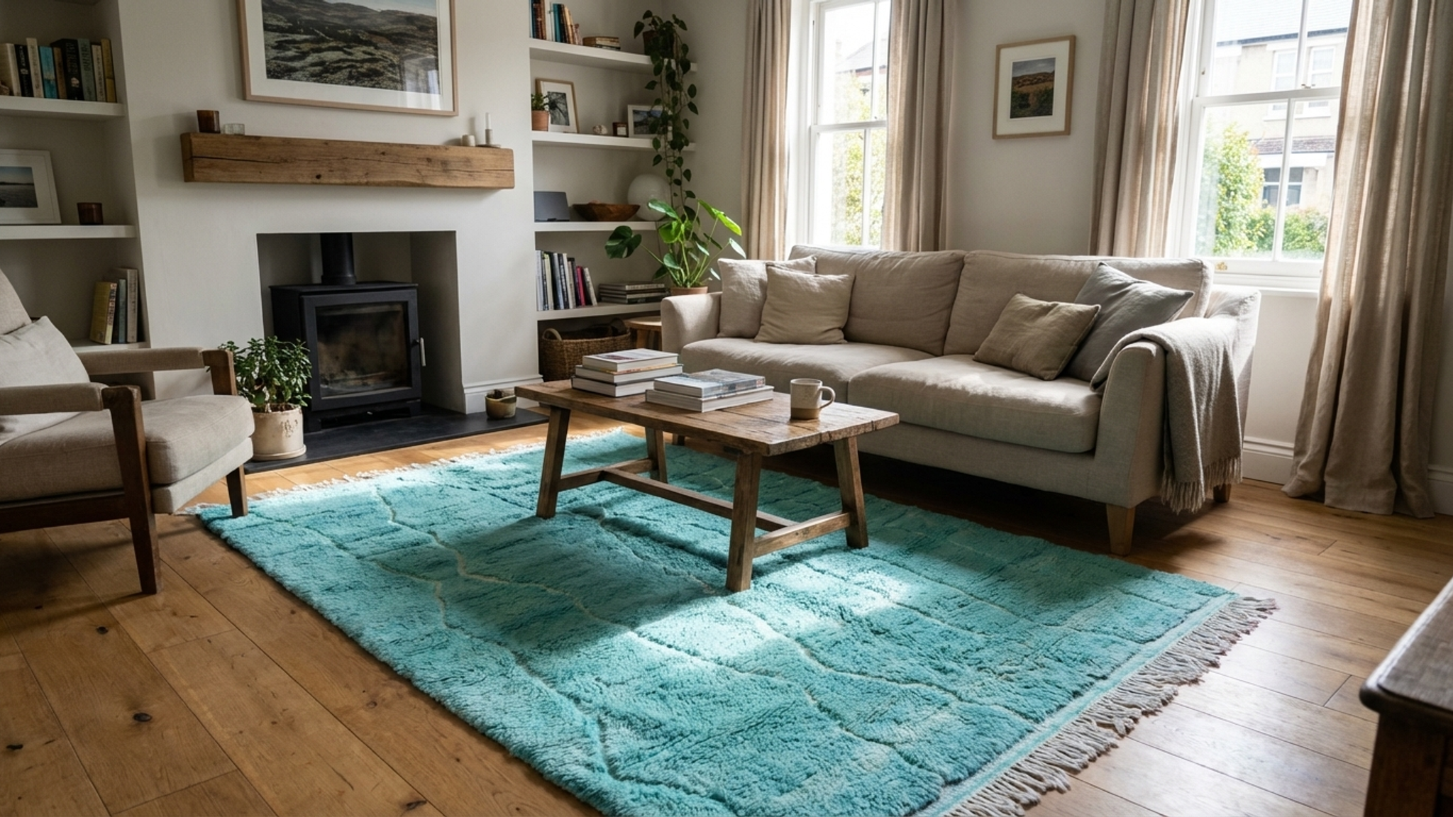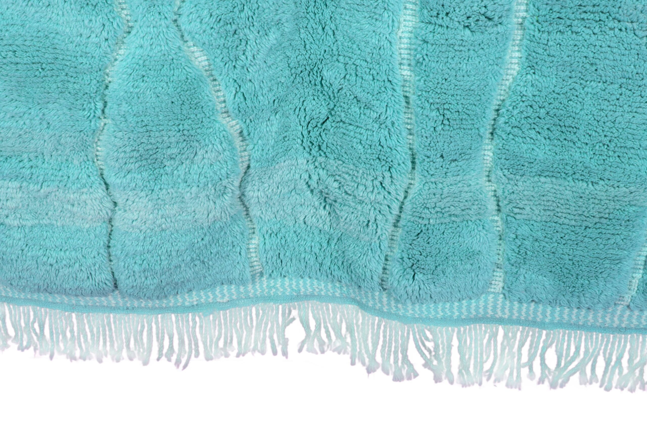 The color reads as turquoise/aqua blue with subtle lighter raised lines—perfect if you’re searching for a colorful but still clean, modern Moroccan rug. The plush wool pile gives that cozy, sink-in feel you want from a living room rug, and the simple geometric texture works beautifully in boho, minimalist, modern, Scandinavian, and mid-century modern homes. Use it as a large area rug under a sofa and coffee table, or as a bedroom area rug for a warm, soft landing every morning.