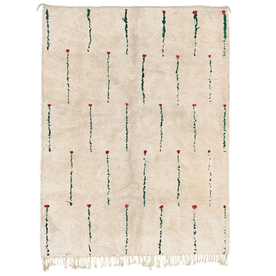 This Berber rug features a creamy ivory field with evenly spaced vertical line motifs in deep forest green, punctuated by small berry-red accents that read like delicate blossoms. The composition is clean and airy, making it an easy “yes” for minimalist, Scandinavian, Japandi, and modern farmhouse interiors. The handwoven texture and medium plush wool pile create a cozy, inviting feel while keeping the pattern quiet enough for layered styling. Use it as a statement area rug without overpowering your furniture.