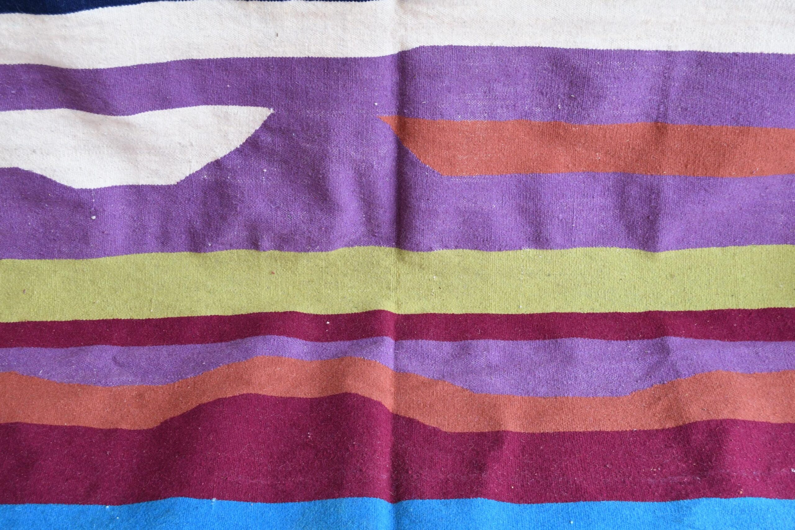 The palette reads as rich purple and deep blue with turquoise, sand/cream neutrals, and a soft olive accent—finished with clean stripes and a modern geometric centerpiece. If you love boho decor but prefer a more minimalist, curated vibe, this wool area rug brings warmth and personality while still feeling modern and Scandinavian-friendly. It’s ideal for mid-century modern, modern farmhouse, coastal boho, and contemporary interiors—especially in a living room where you want a focal point that’s still easy to style.