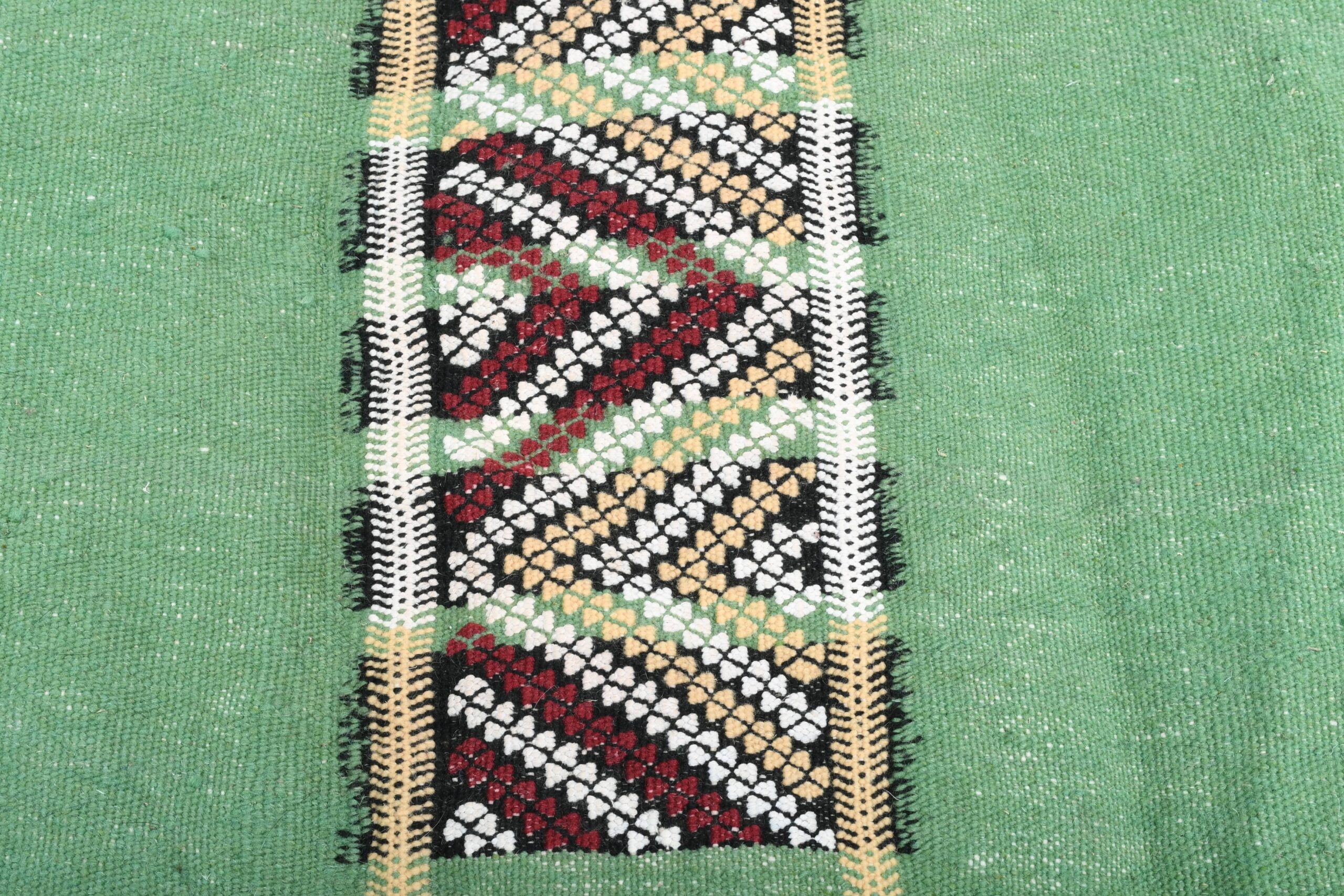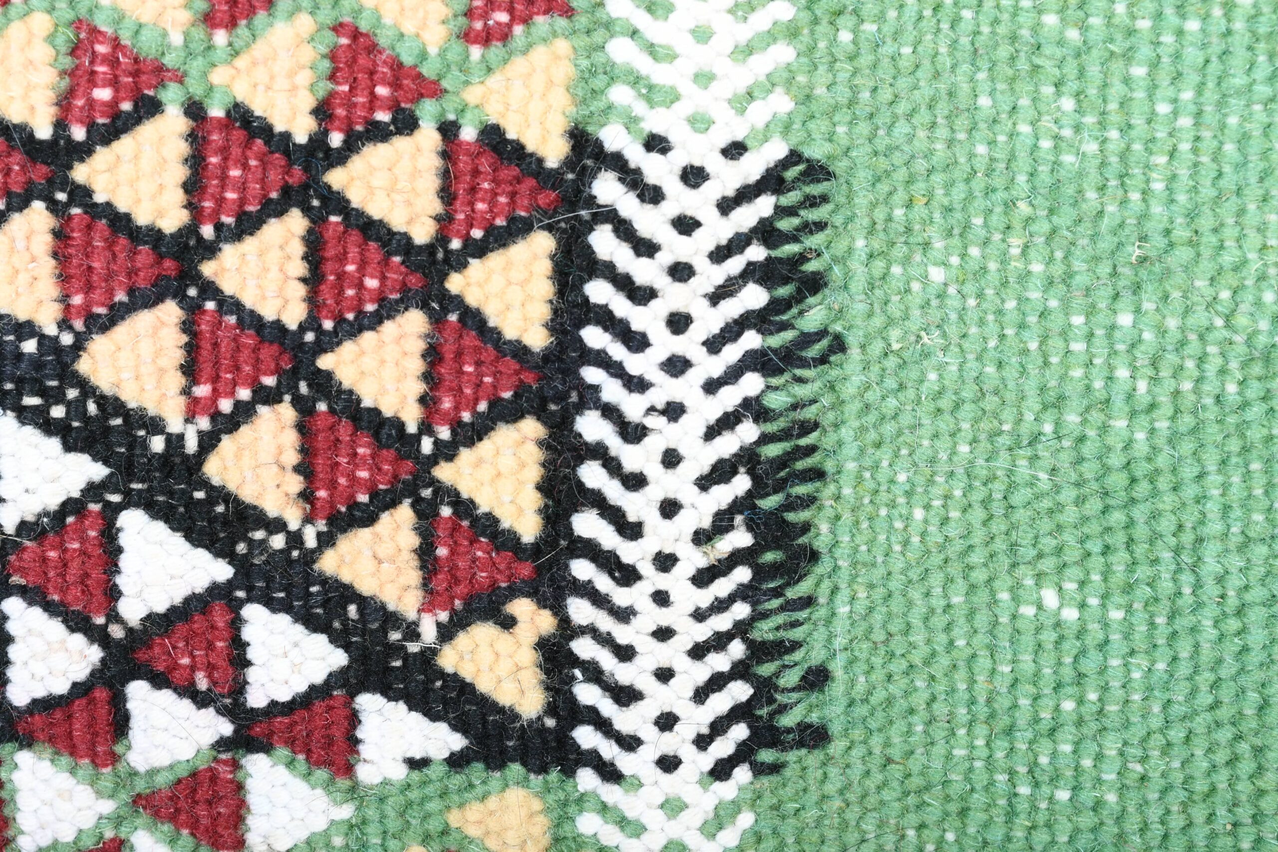 The color palette reads as earthy green with multicolor accents (burgundy, black, ivory, tan, and soft yellow) that feel grounded and designer-friendly. The pattern is modern-tribal: clean blocks with a woven geometric frame that pairs easily with boho decor, minimalist interiors, and even Scandinavian-inspired spaces where you want one strong piece to anchor the room. As a handwoven wool rug, it has that cozy, substantial feel underfoot—ideal for high-traffic family living rooms or calming bedrooms.