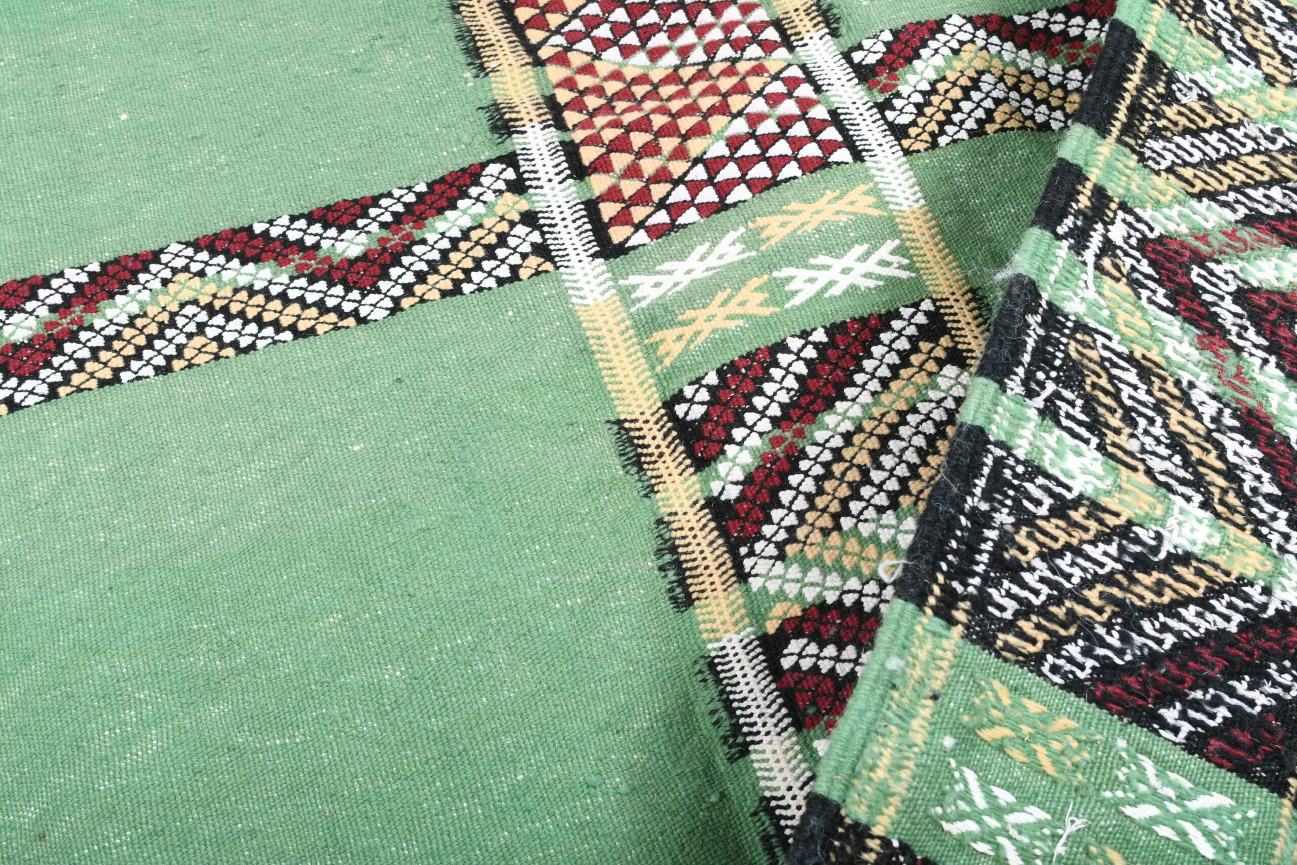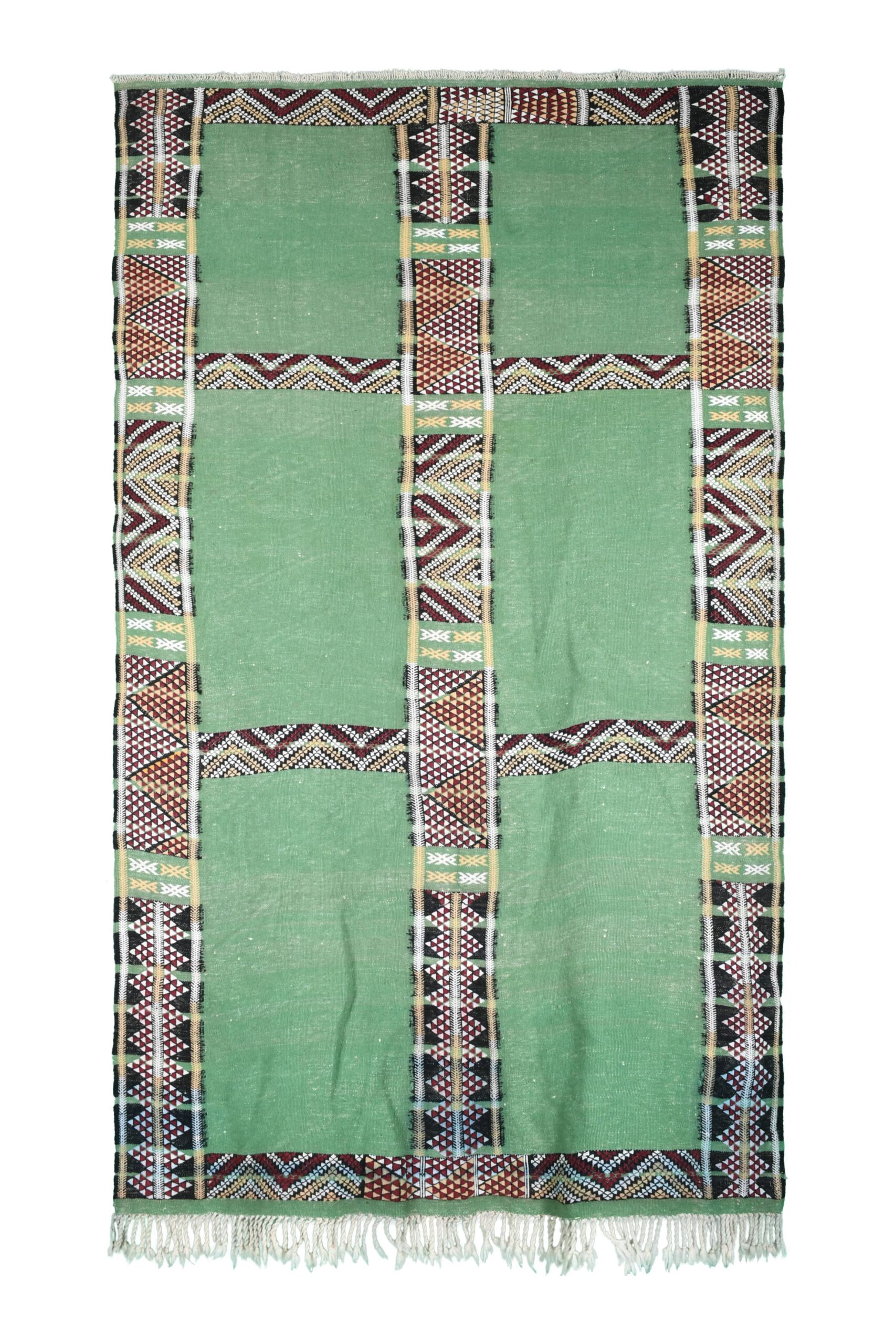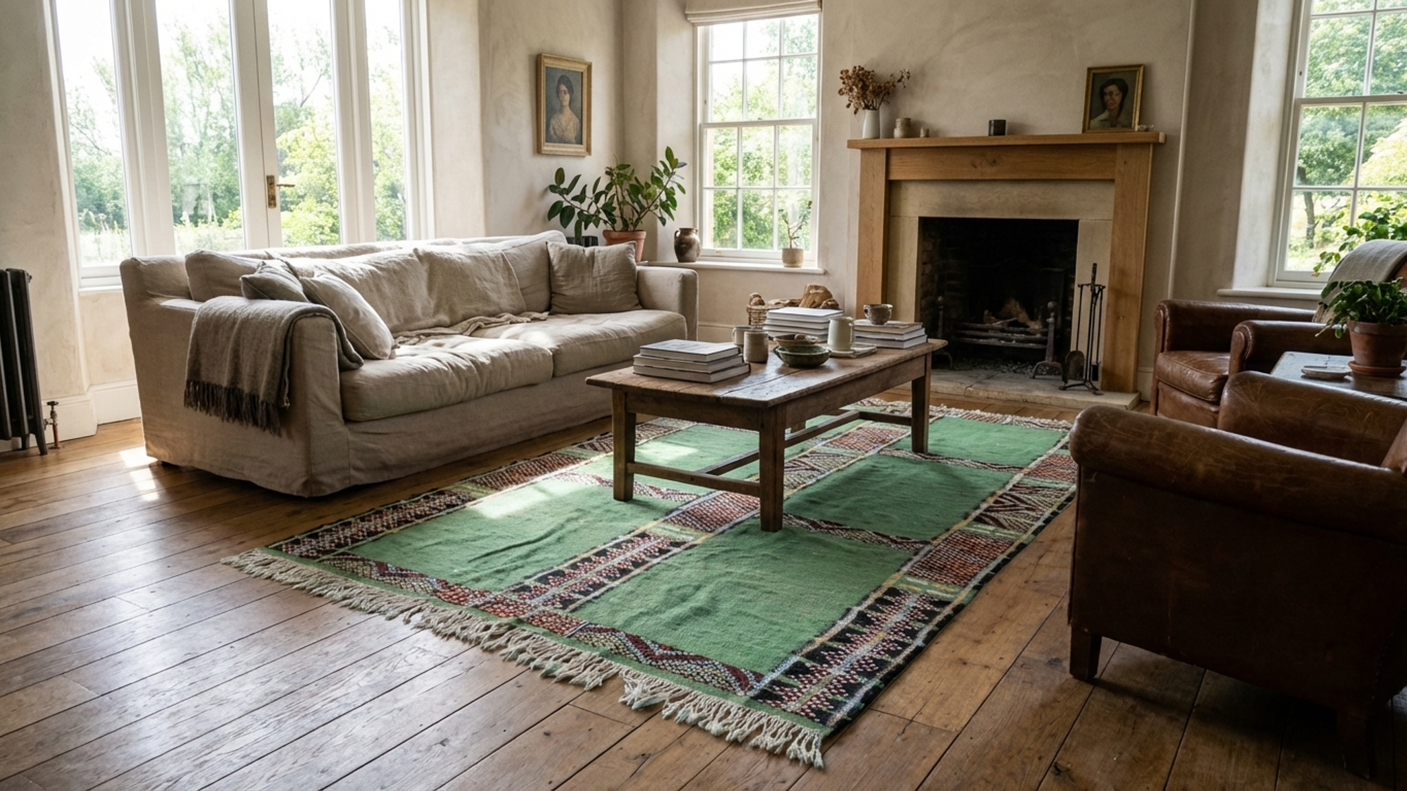 This authentic handmade Moroccan rug is a bold way to bring color and heritage into a modern American home. Woven from natural wool, this Moroccan rug features a rich sage/olive green field framed by detailed geometric borders—perfect when you want a statement area rug without feeling busy. Sized at 6×10 ft, it works beautifully as a living room rug under a sofa + coffee table, or as a bedroom area rug to warm up wide-plank floors.