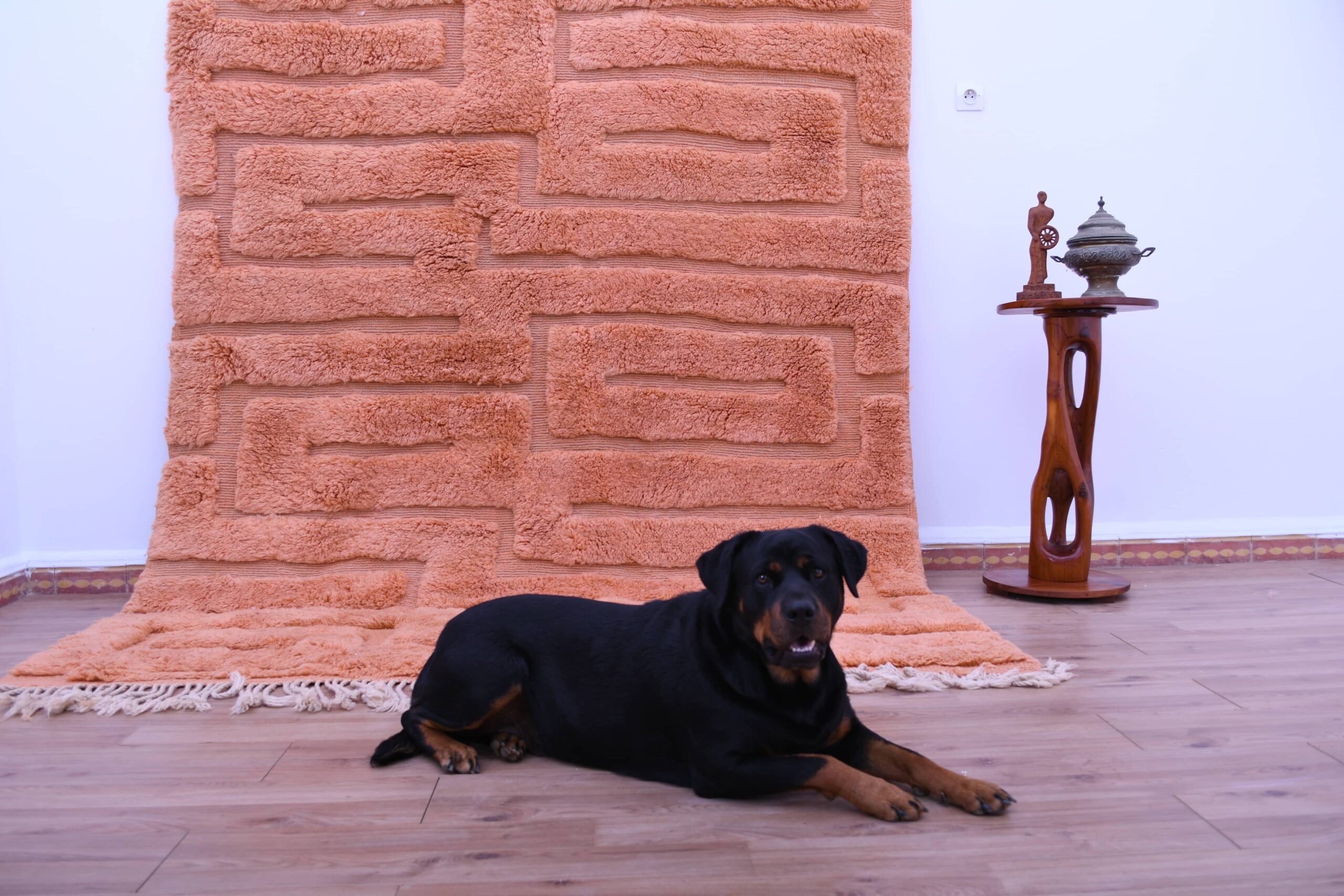 Color-wise, this rug reads as terracotta / dusty clay with subtle tonal variation that pairs beautifully with ivory walls, natural wood, linen sofas, and black accents. The raised, maze-like geometric pattern adds a modern, minimalist texture that still feels cozy and organic—perfect for boho, Scandinavian-friendly, mid-century modern, or modern farmhouse interiors. The plush wool pile feels soft underfoot, making it a comfortable living room rug, a warm bedroom area rug, or a statement piece in a studio or office.