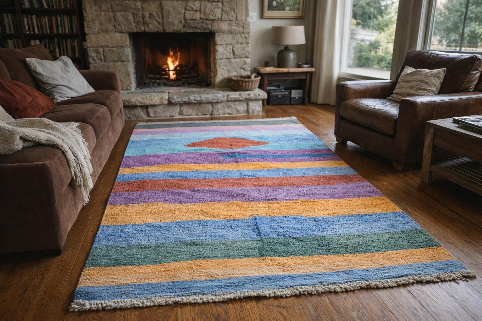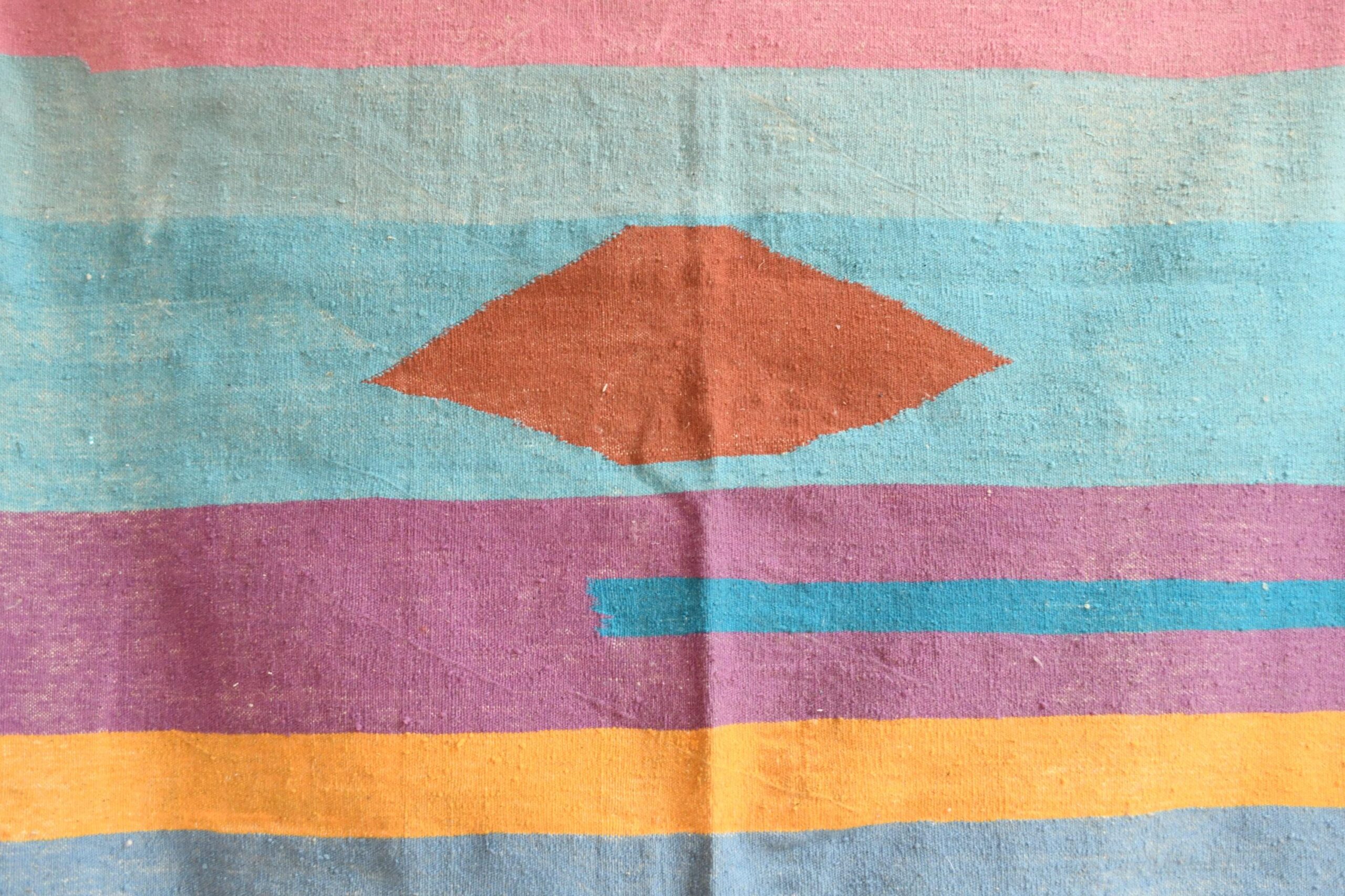 This authentic handmade Moroccan rug is a bold, modern statement piece for an American home. With colorful horizontal stripes (blue, teal, green, purple, blush pink, mustard, and terracotta) and a clean geometric center motif, this Moroccan rug instantly warms up a living room, bedroom, or office. Woven from natural wool by 3rd generation Berber artisans and fair trade certified, it’s the kind of real-deal area rug buyers look for when they want quality, comfort, and authenticity.