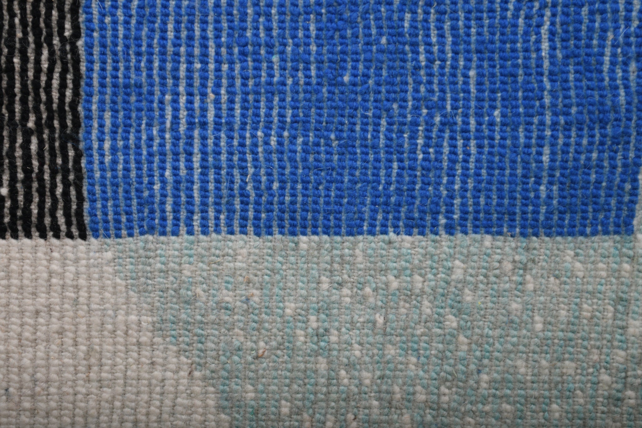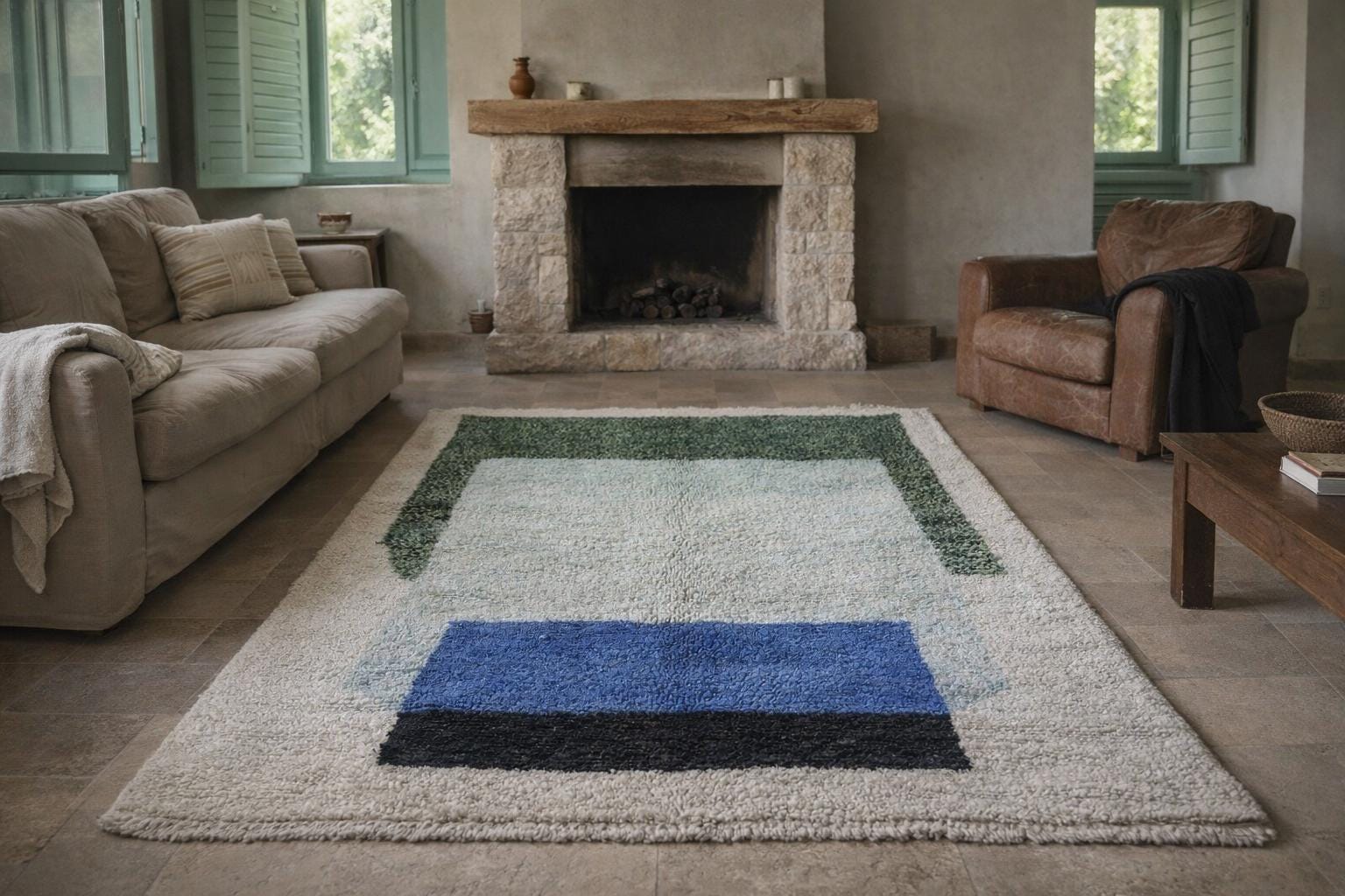 The palette is buyer-friendly and easy to style: warm ivory/cream with cool, calming blues and a muted green border that reads like sage/olive in most interiors. The bold cobalt rectangle anchors the design while the black accent adds contrast for a modern edge. As a handwoven wool rug, it feels thick and comfortable underfoot—perfect for high-traffic spaces where you want warmth, sound-dampening, and a cozy texture. This design fits modern farmhouse, Scandinavian, mid-century modern, and coastal boho homes.