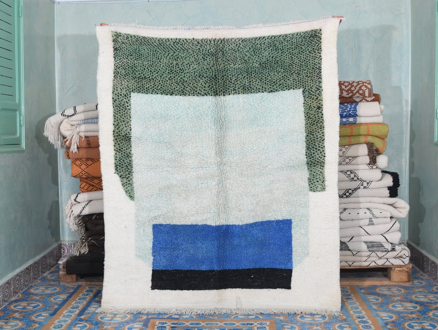 This authentic handmade Moroccan rug is a soft, plush wool area rug designed to make a room feel finished and inviting. The clean ivory base with modern color blocks in sage green, light aqua, cobalt blue, and black gives you that elevated boho/modern look without overwhelming your space. This Moroccan rug works beautifully as a living room rug under a sofa or as a cozy bedroom area rug, and it’s custom-made to fit your exact layout.