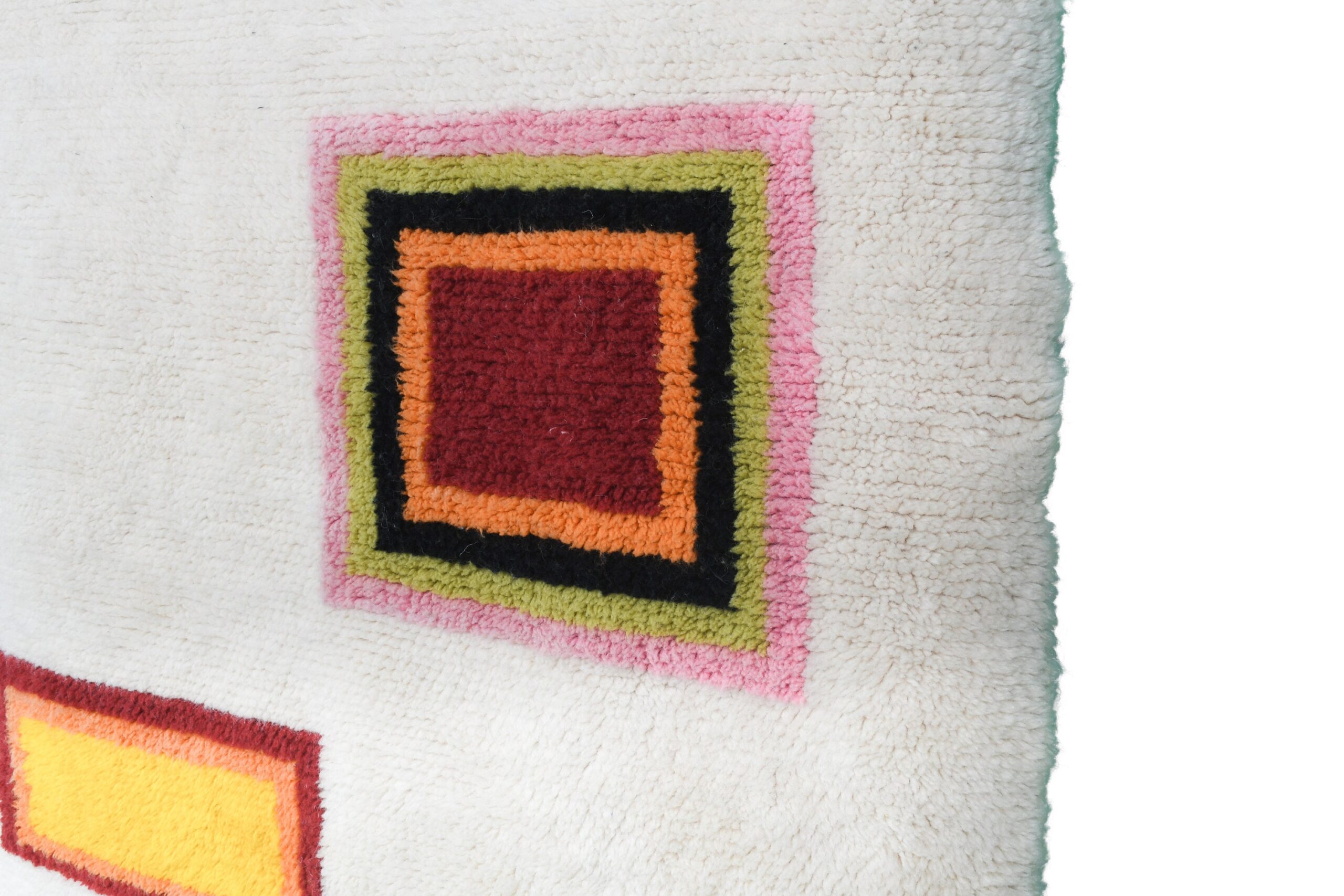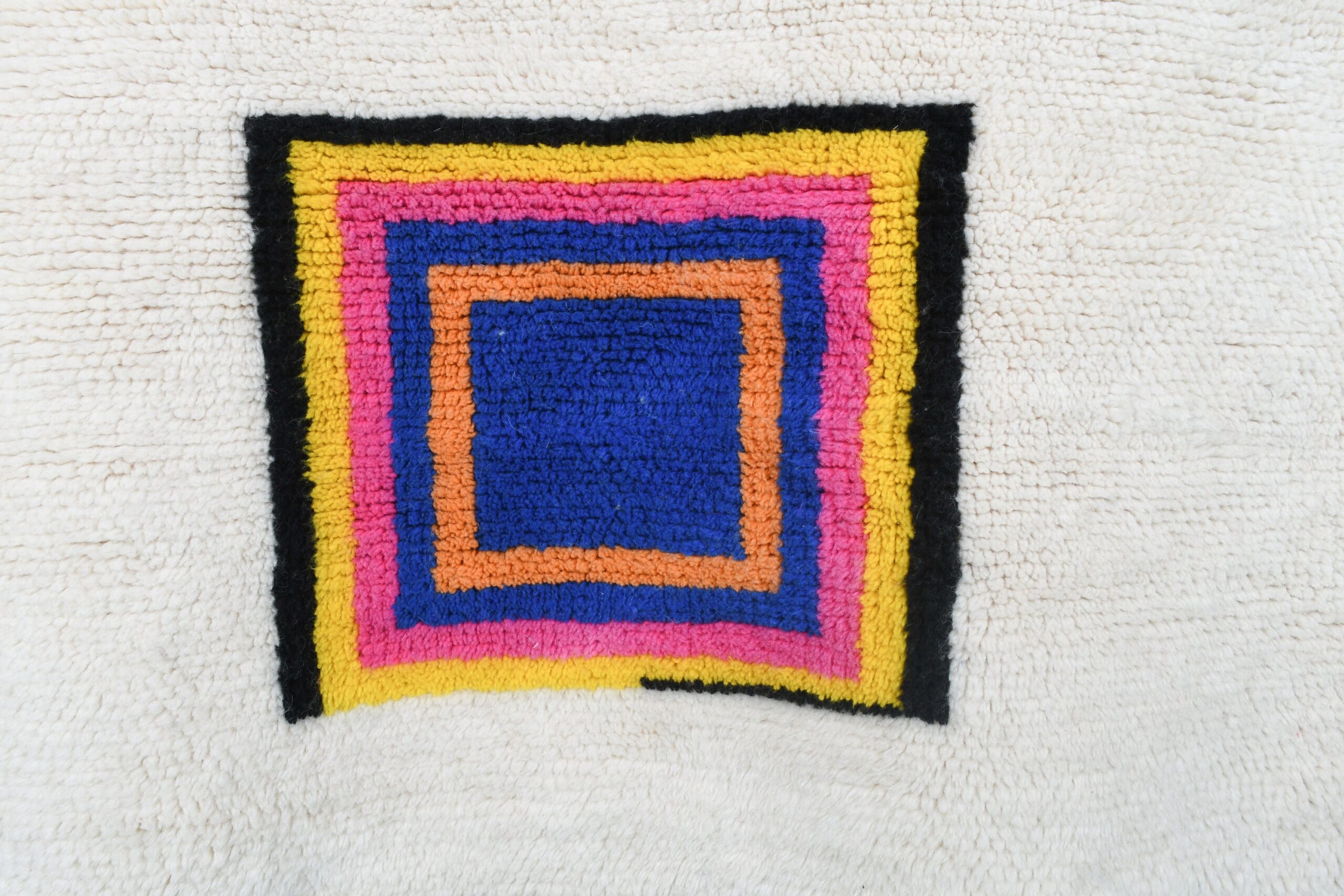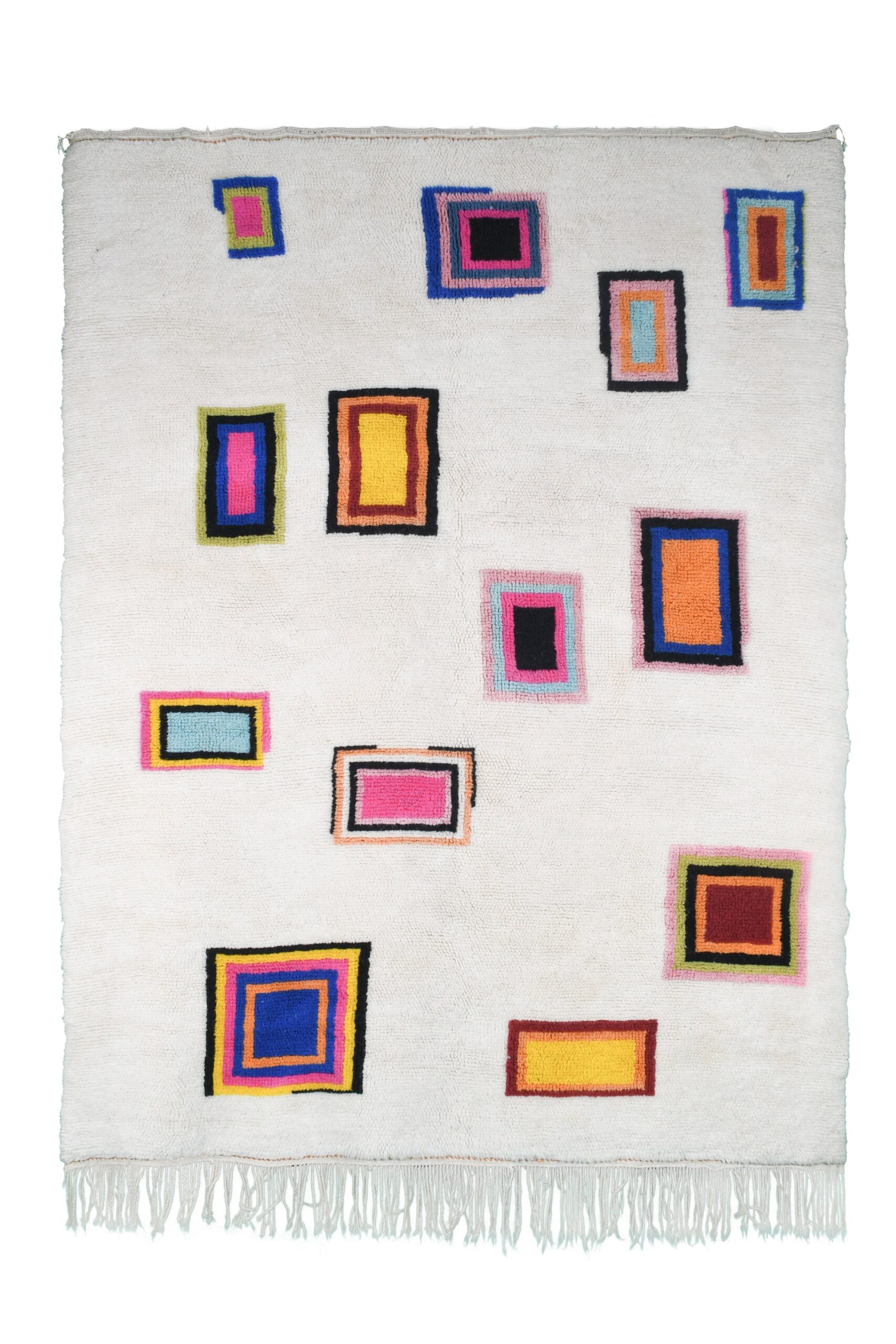 This authentic handmade Moroccan rug is a soft, plush wool rug designed to brighten a modern home with clean, colorful geometric accents. The ivory/cream base keeps this Moroccan rug feeling neutral and easy to style, while the bold framed rectangles add the perfect pop of color for a boho living room or cozy bedroom. Handwoven by 3rd generation Berber artisans and fair trade certified, it’s a true statement area rug that still feels timeless.
