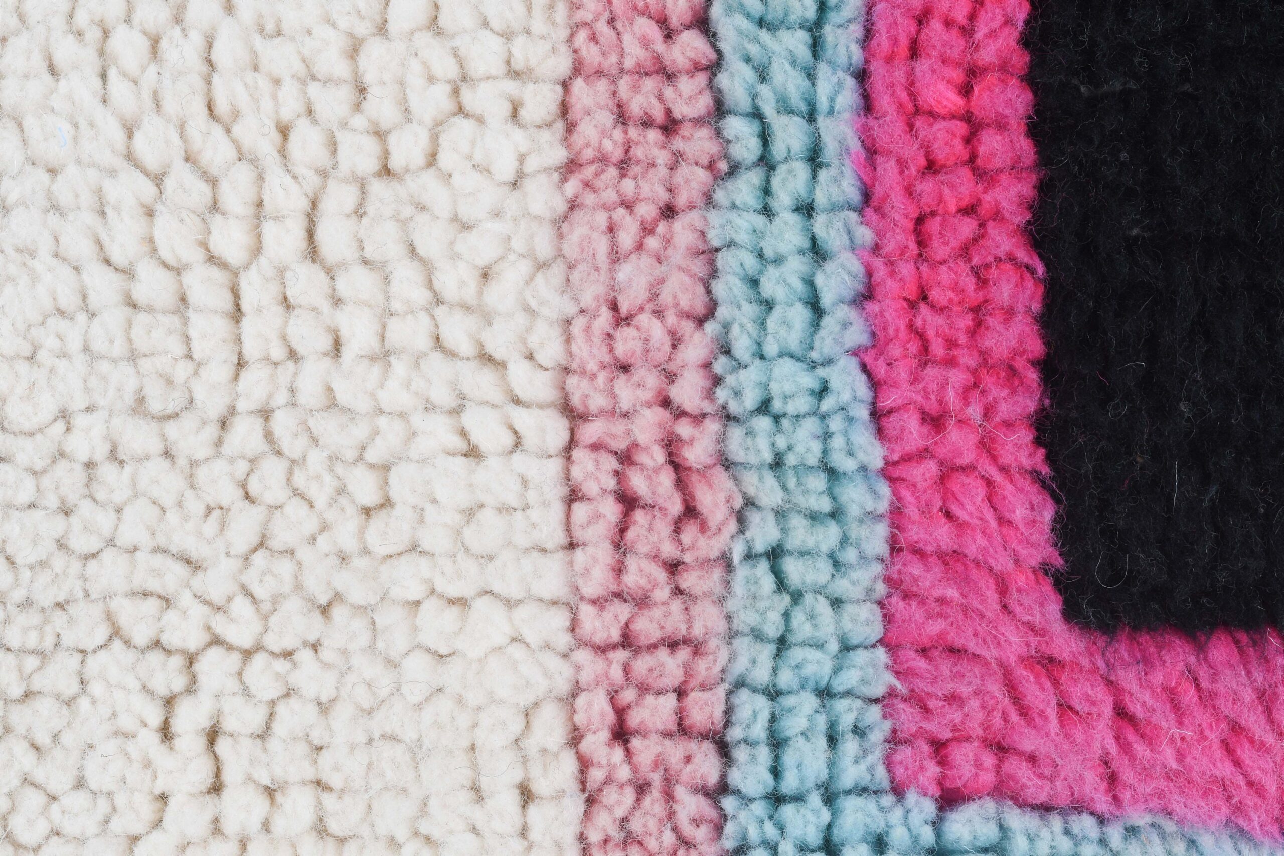 Creamy ivory meets vibrant pops of pink, cobalt blue, turquoise, mustard, orange, and black outlines—this is the kind of neutral rug that still feels fun. The look is modern boho with a minimalist layout, making it Scandinavian-friendly and perfect for modern farmhouse, mid-century modern, or coastal boho interiors. Use it as a living room rug under a sofa, or as a bedroom area rug for a soft, warm landing every morning. This handwoven wool rug has a cozy, cushioned feel underfoot.