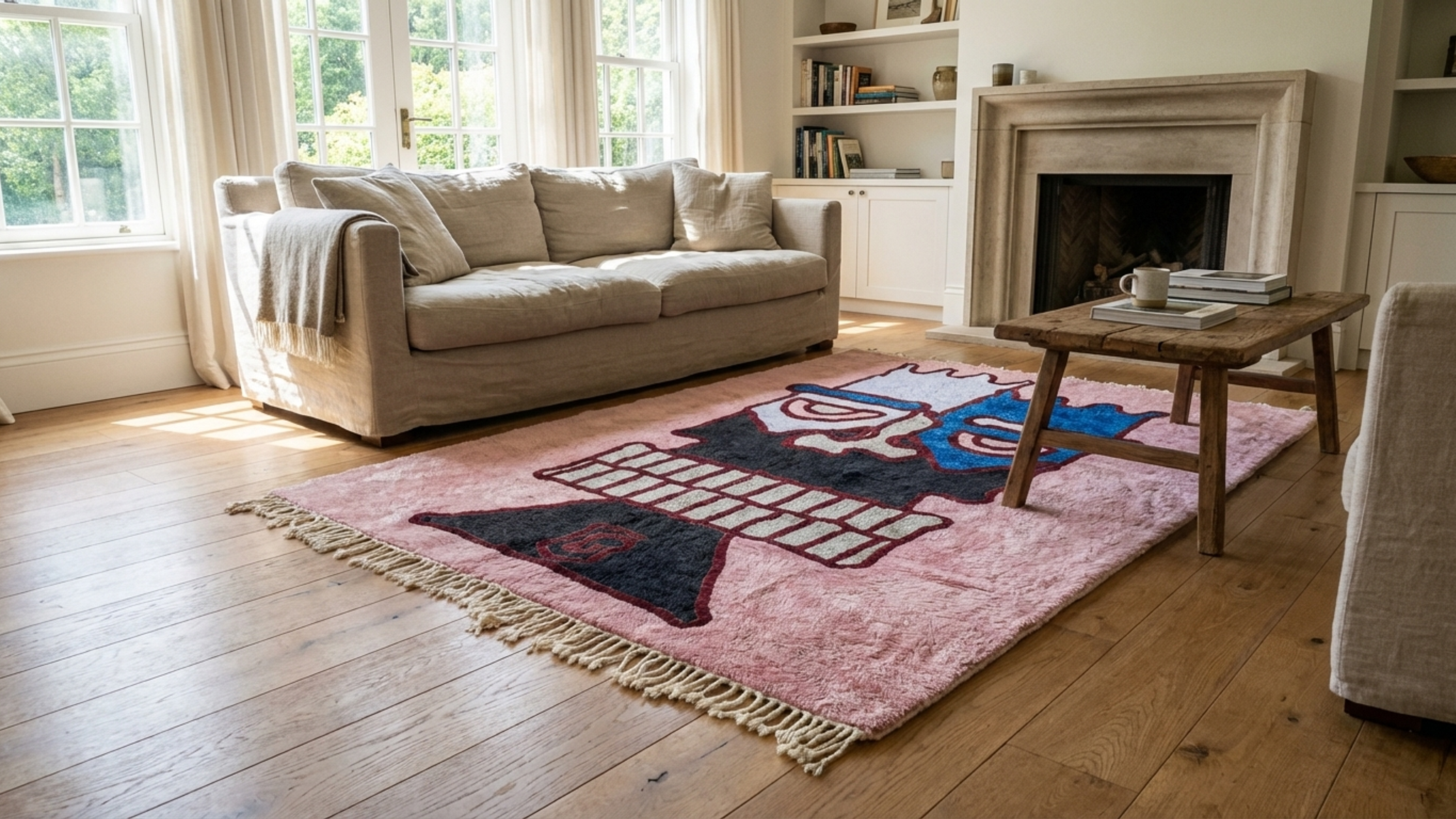 The color story is a buyer favorite: soft pink / blush with deep navy, cobalt blue, and ivory accents for contrast. The graphic face-inspired motif reads “modern art” while still feeling cozy and textured underfoot. This wool rug works especially well in boho interiors, eclectic spaces, mid-century modern rooms, and minimalist homes that need one standout piece. Use it as a large area rug under a sofa, as a bedroom rug for warmth, or in an office to add personality without clutter.