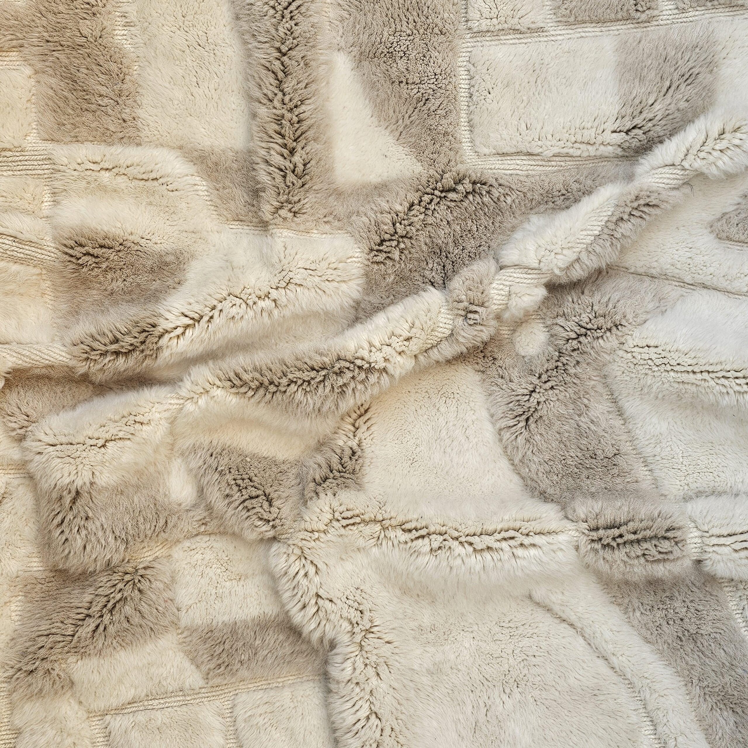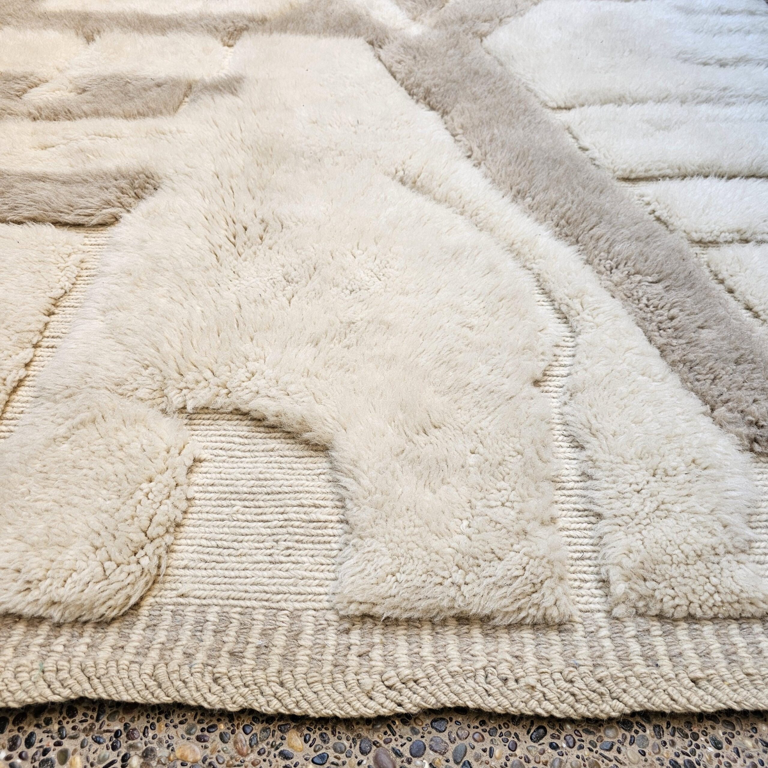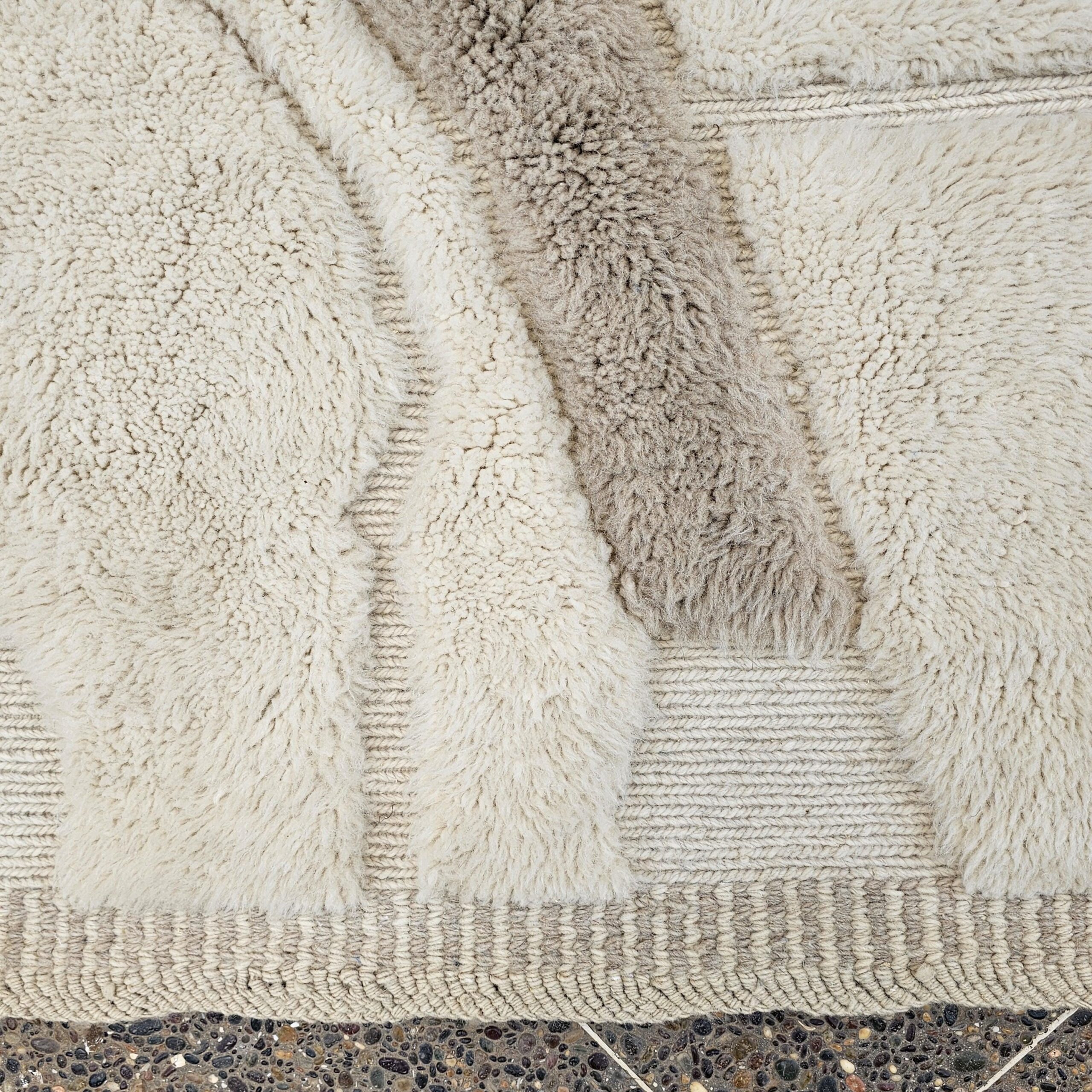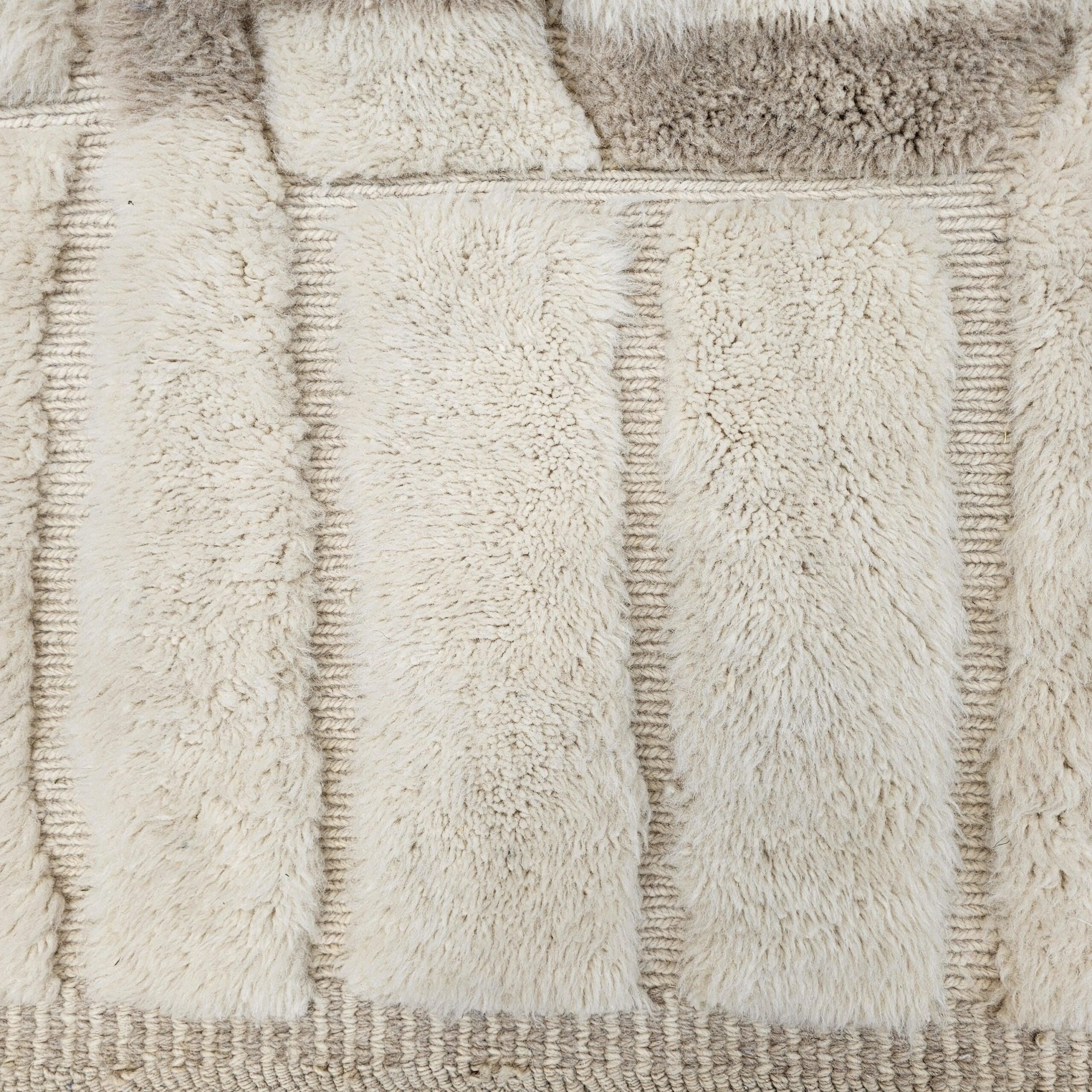Designed with an organic, abstract block-and-panel layout, this Berber rug mixes plush wool pile with flatwoven lanes to create a subtle geometric relief. The palette reads as creamy ivory with warm sand and light taupe accents, giving the rug an easy, elevated look in bright or moody rooms. The thick, soft wool and textured carving make it a cozy area rug for daily living—perfect for boho, minimalist, Scandinavian, or modern farmhouse interiors.