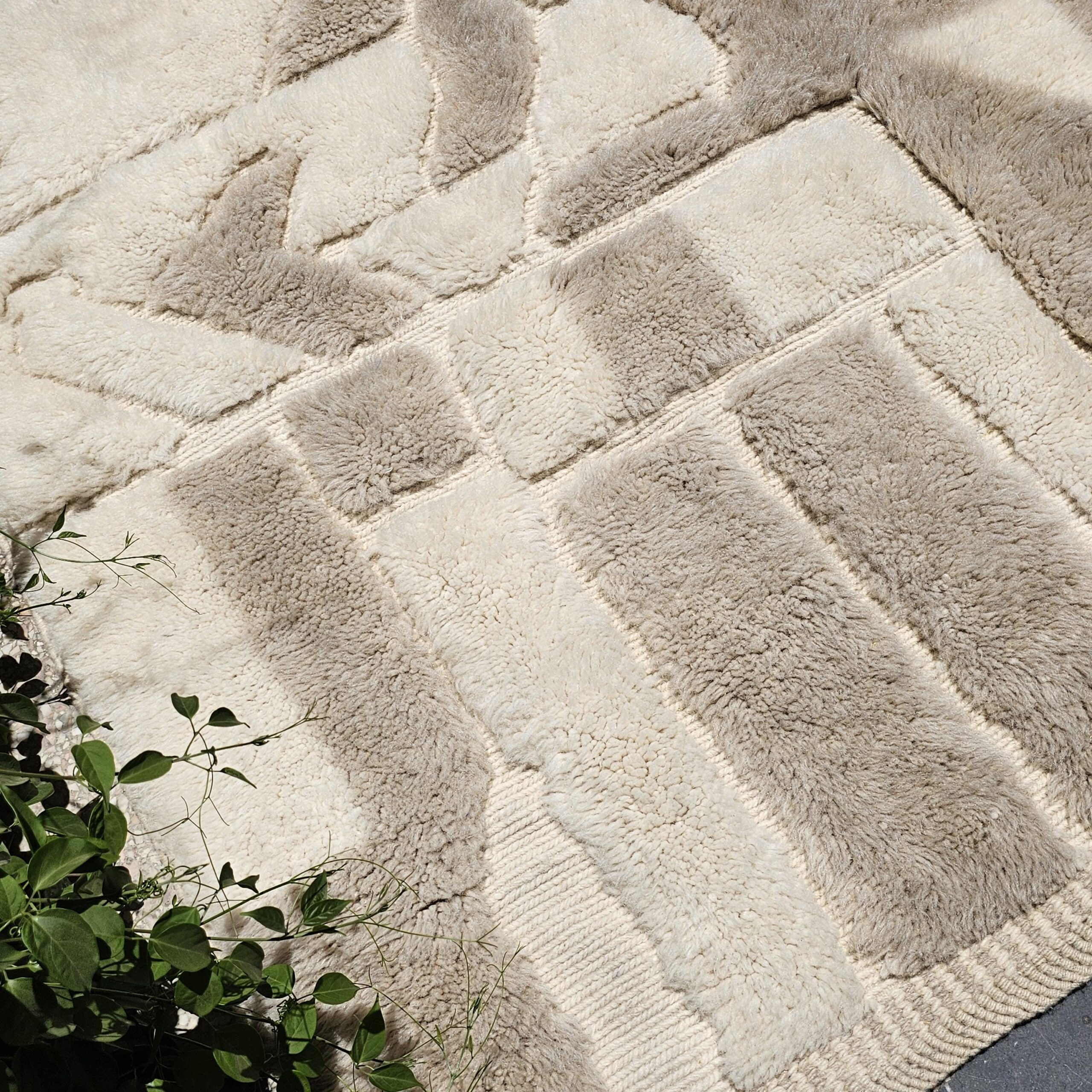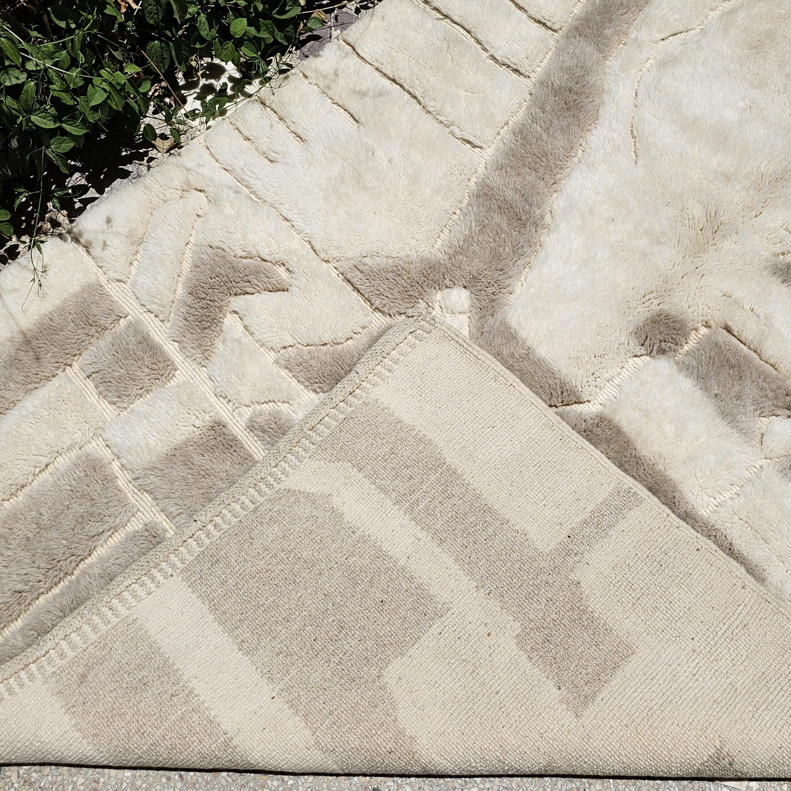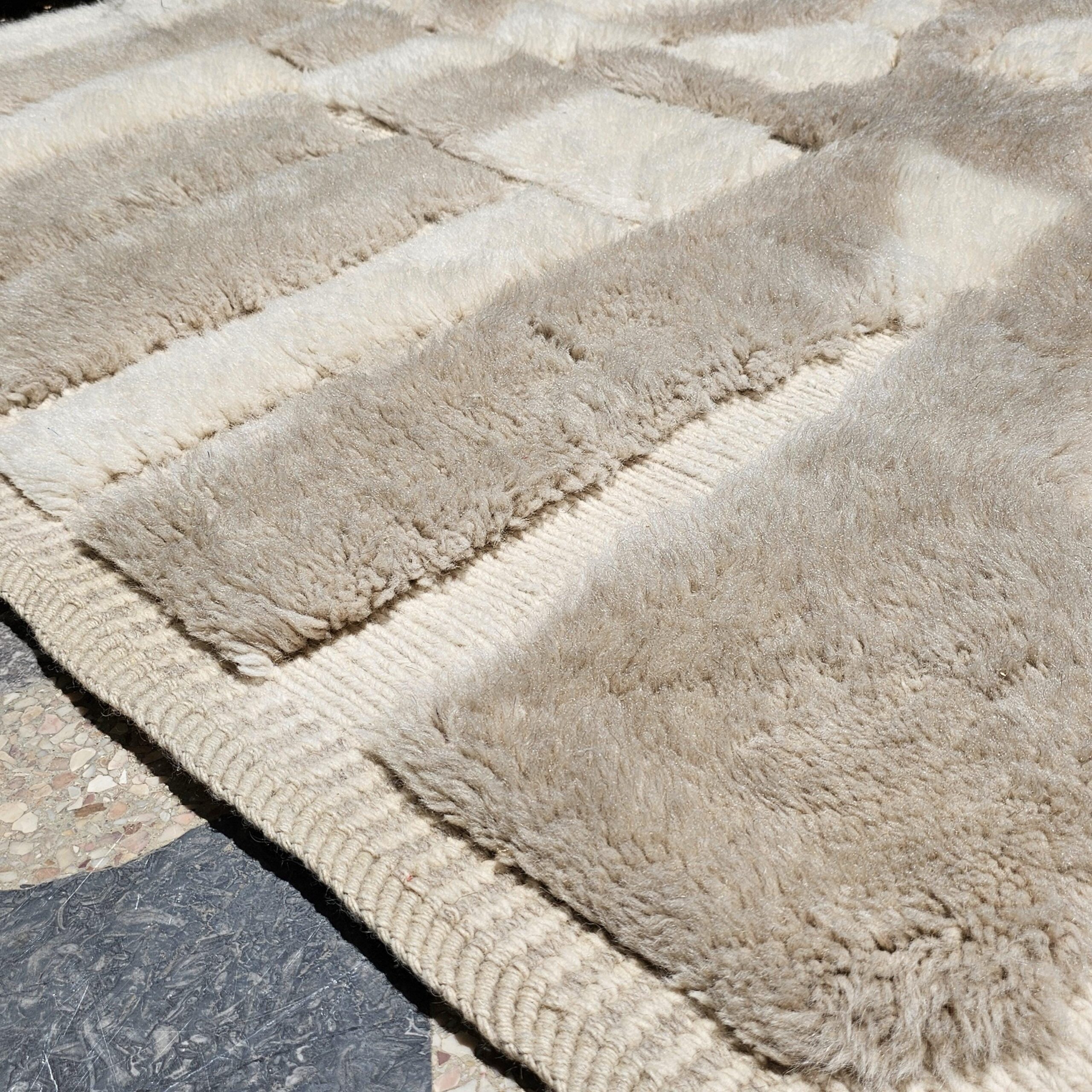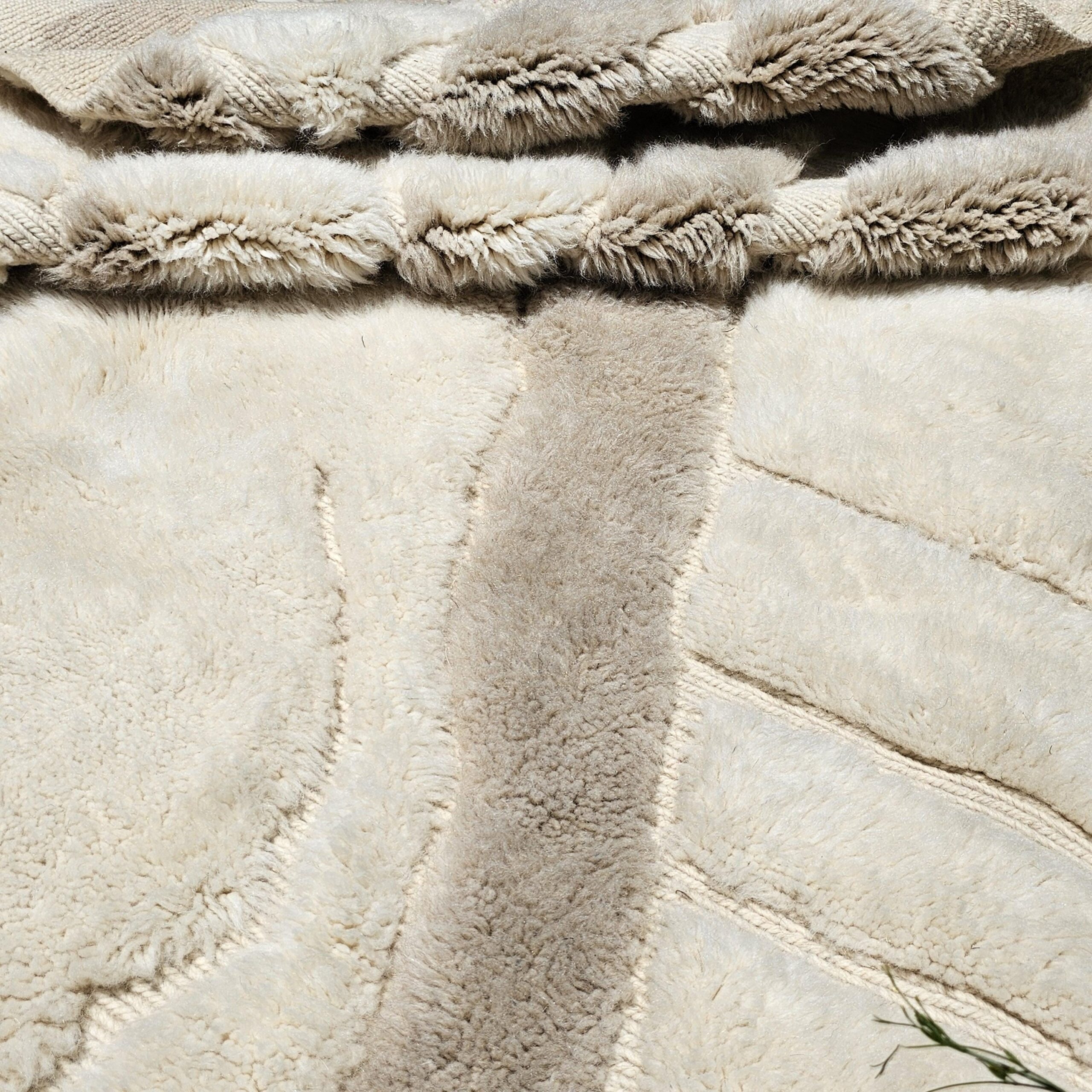 Designed with an organic, abstract block-and-panel layout, this Berber rug mixes plush wool pile with flatwoven lanes to create a subtle geometric relief. The palette reads as creamy ivory with warm sand and light taupe accents, giving the rug an easy, elevated look in bright or moody rooms. The thick, soft wool and textured carving make it a cozy area rug for daily living—perfect for boho, minimalist, Scandinavian, or modern farmhouse interiors.