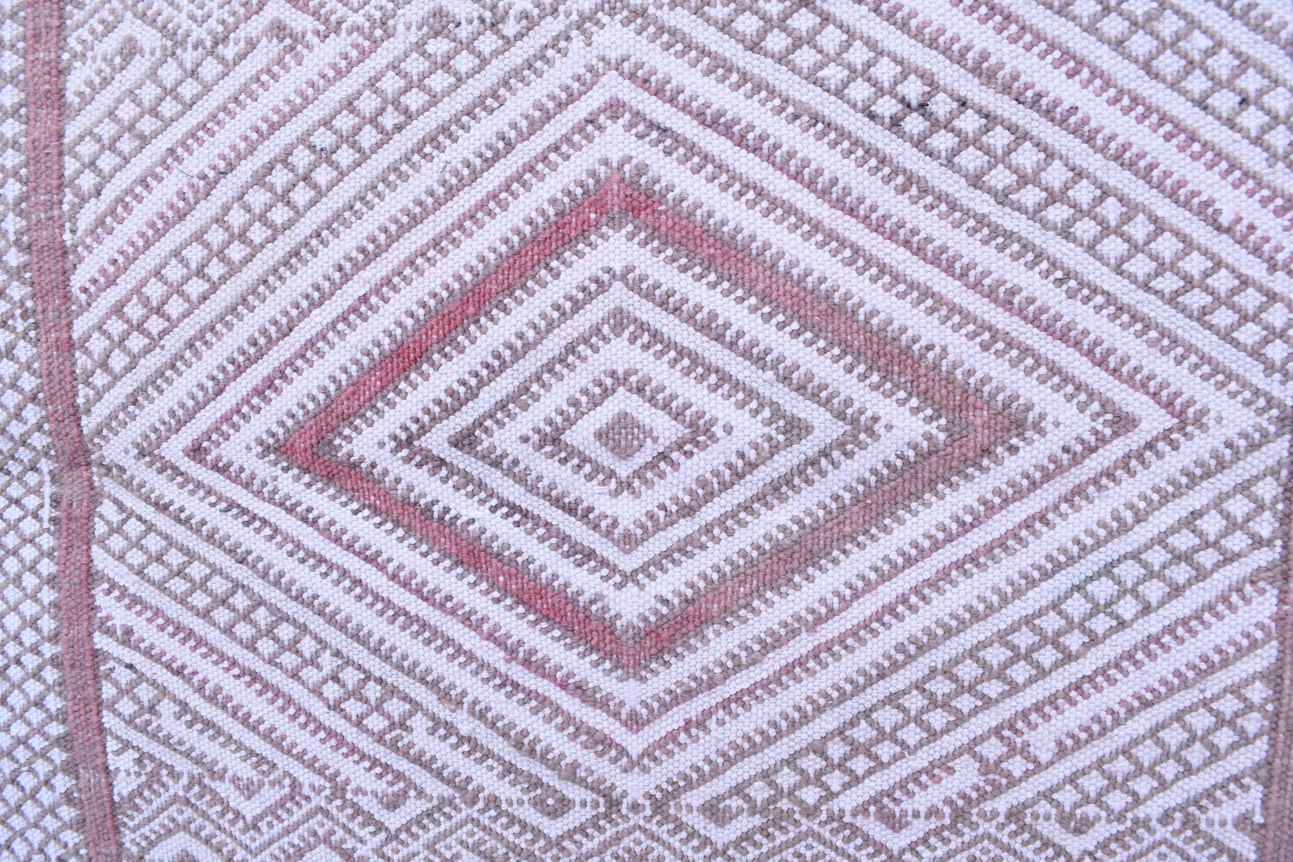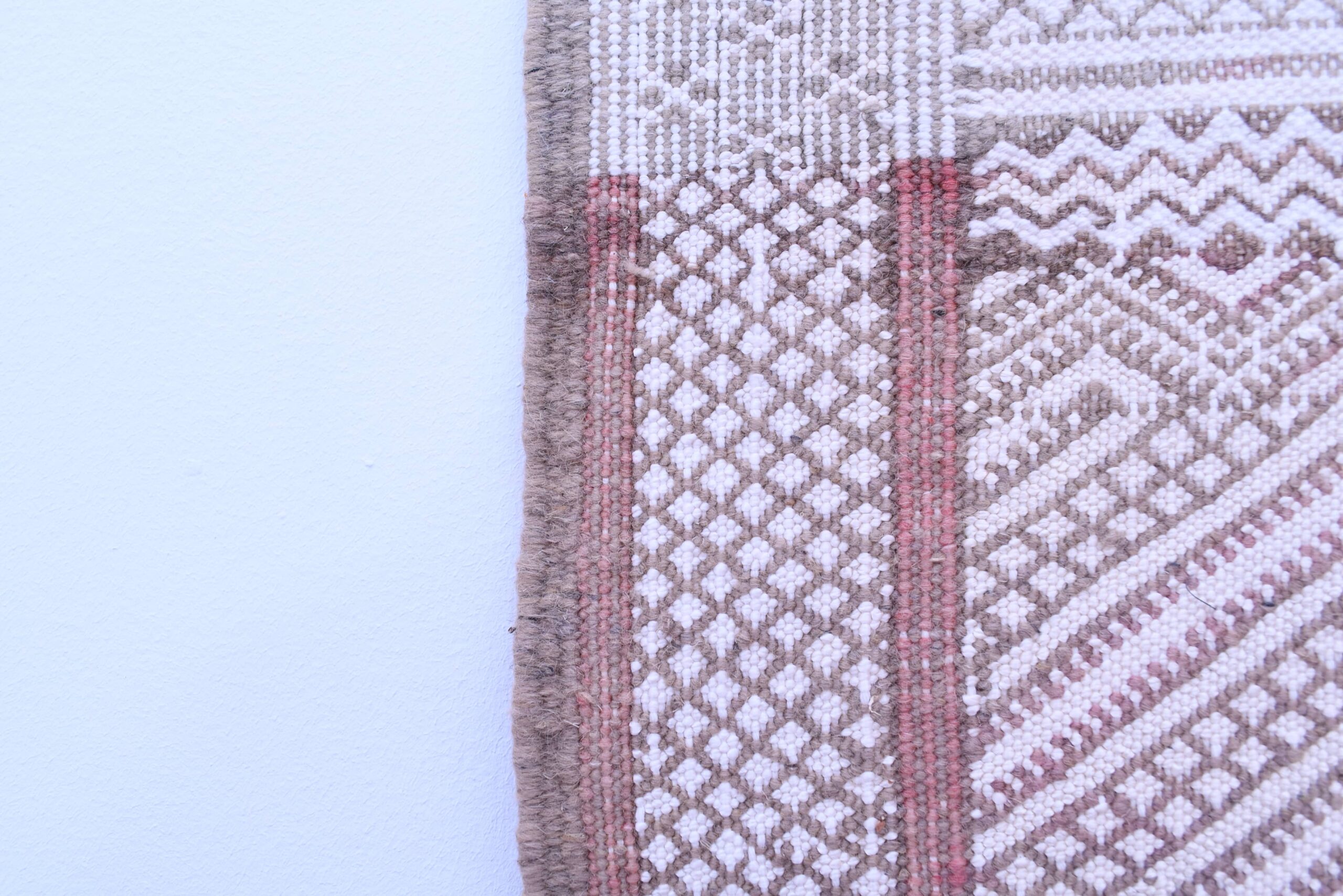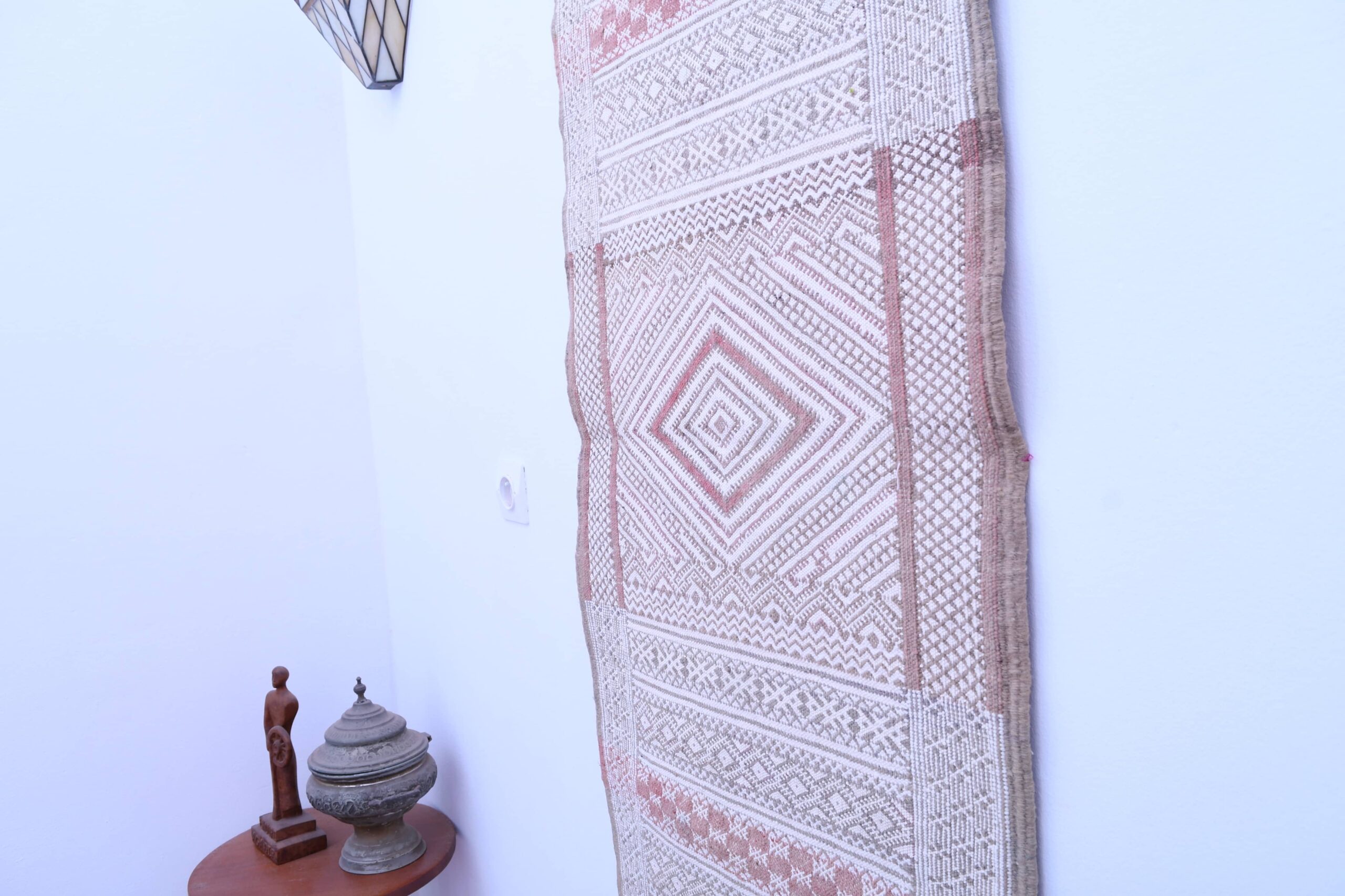 Dieser Tiflet Kelim-Teppich eignet sich ideal für Wohnzimmer, Flure oder als Blickfang im Schlafzimmer und passt sich nahtlos an verschiedene Einrichtungsstile an. Seine neutralen Töne und sein unverwechselbares Design machen ihn zu einer vielseitigen Wahl, die sowohl mit modernen als auch mit traditionellen Möbeln harmoniert.