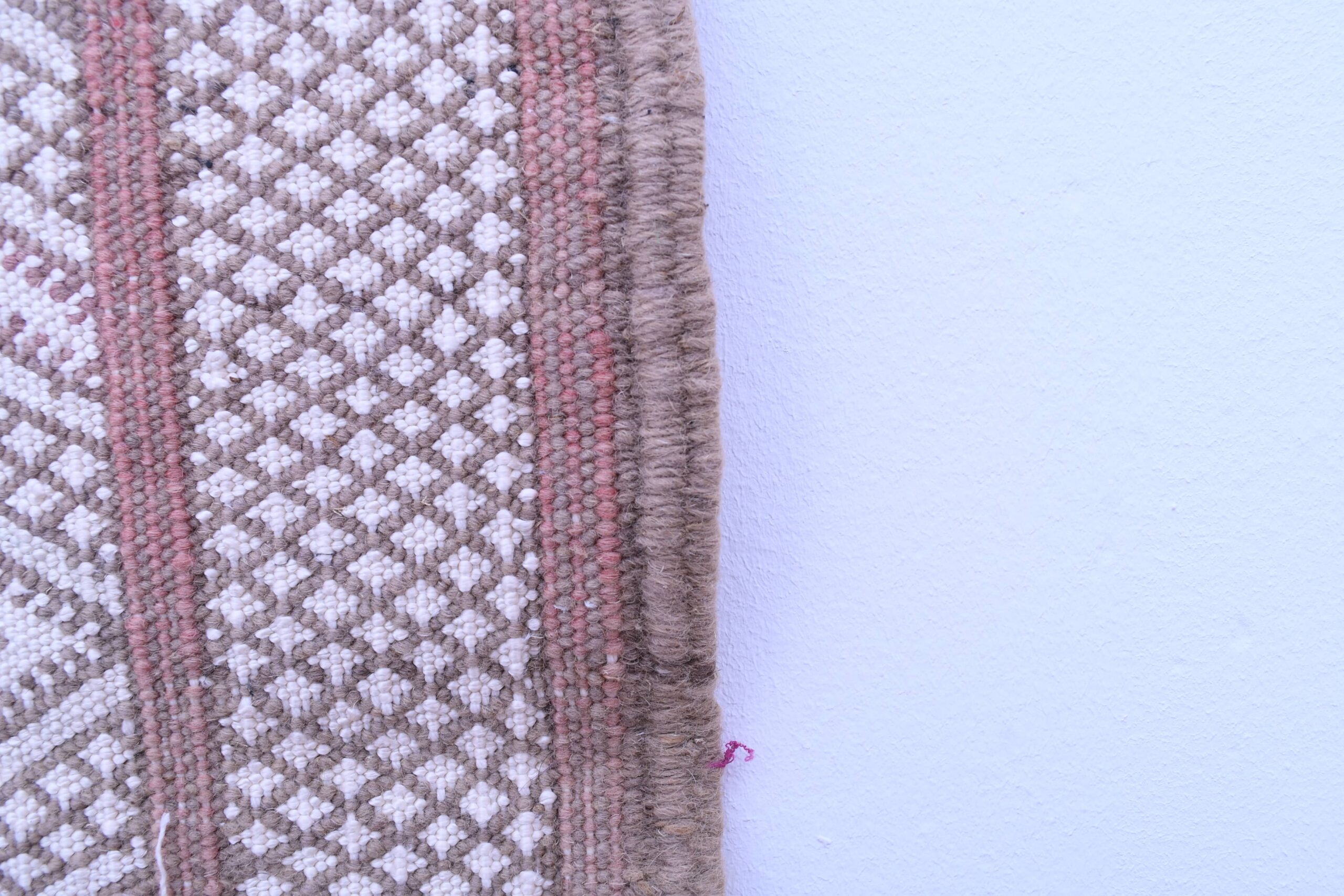 Dieser Tiflet-Kelim-Teppich mit den Maßen 59,00 × 131,00 cm zeigt ein faszinierendes geometrisches Muster im Mittelpunkt seines Designs. Die komplizierten Motive mit Rautenformen und linearen Elementen spiegeln traditionelle marokkanische Kunstfertigkeit wider und verleihen jedem Raum zeitlose Eleganz.