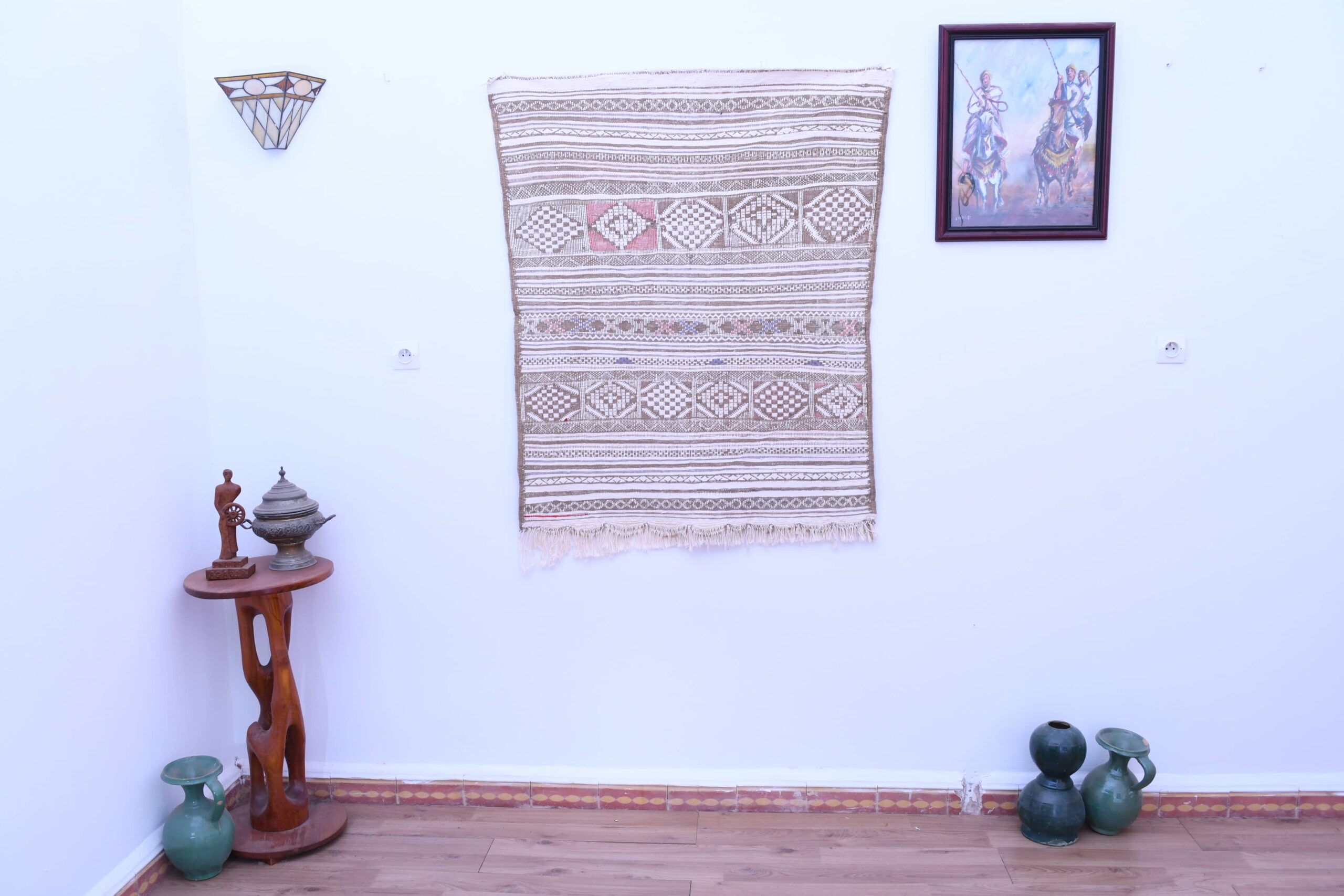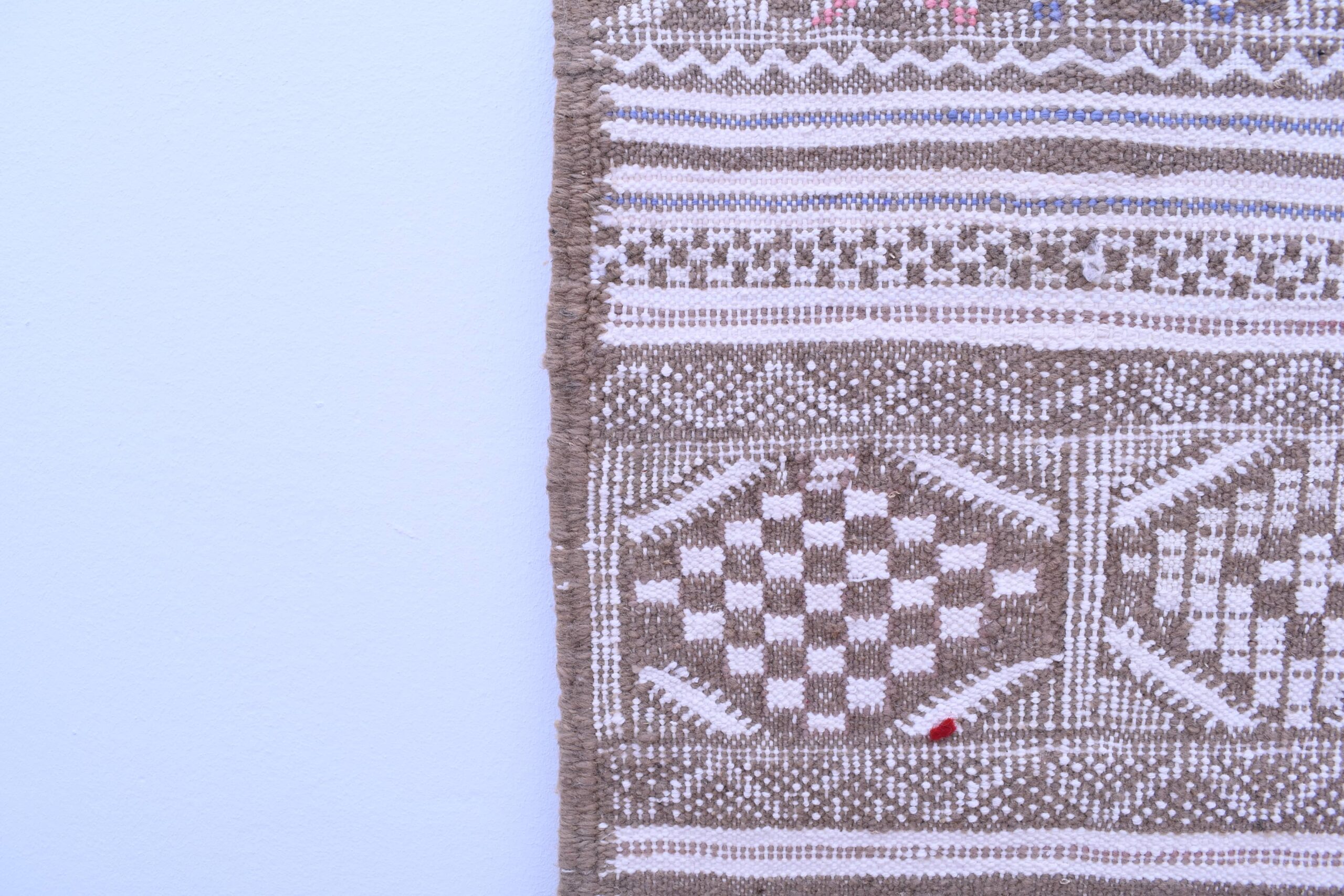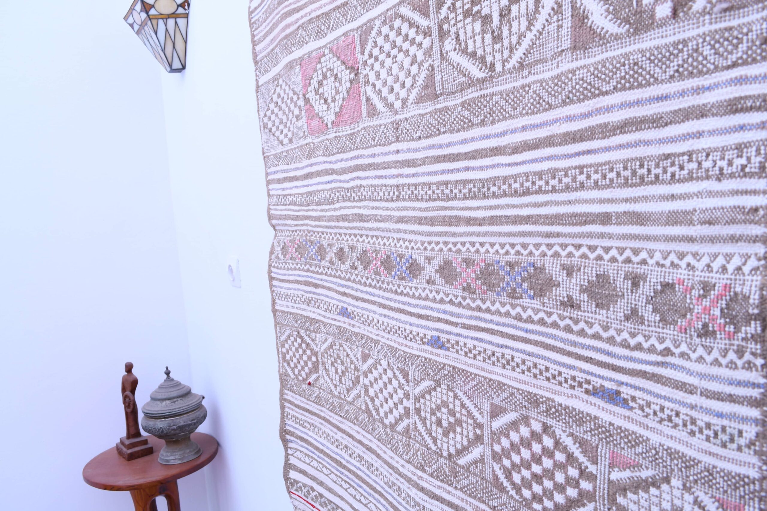 Dieser Tiflet Kelim Teppich ist eine ideale Ergänzung für eine Vielzahl von Räumen. Sein vielseitiges Design macht ihn geeignet für Wohnzimmer, Schlafzimmer oder sogar als Blickfang im Eingangsbereich. Die neutralen Töne und die komplexen Muster des Teppichs ergänzen sowohl moderne als auch traditionelle Einrichtungsstile und machen ihn zu einer flexiblen Wahl für jedes Zuhause.