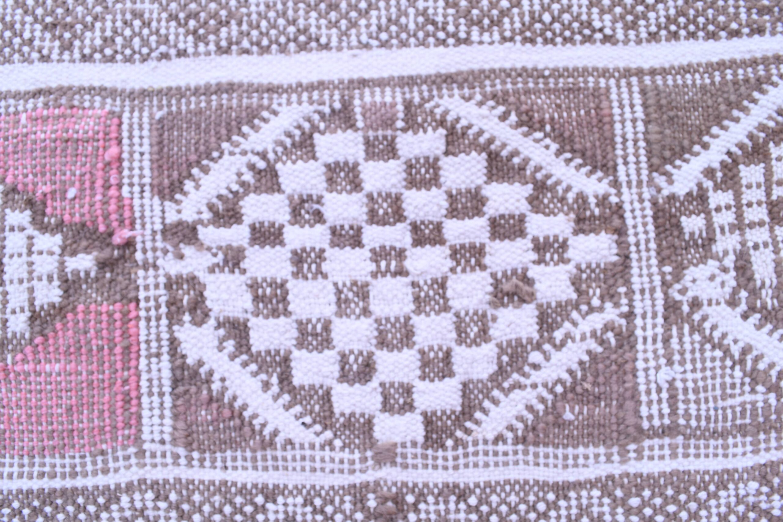 Dieser wunderschöne Tiflet-Kelim-Teppich mit den Maßen 100,00 × 125,00 cm zeigt ein komplexes Design, das typisch für marokkanische Kunst ist. Der Teppich zeichnet sich durch eine harmonische Mischung aus geometrischen Mustern und traditionellen Motiven aus, die alle sorgfältig gewebt wurden, um einen Wandteppich von kultureller Bedeutung zu schaffen. Besonders auffällig sind die Rauten- und Schachbrettmuster, die dem Stück Tiefe und Komplexität verleihen.