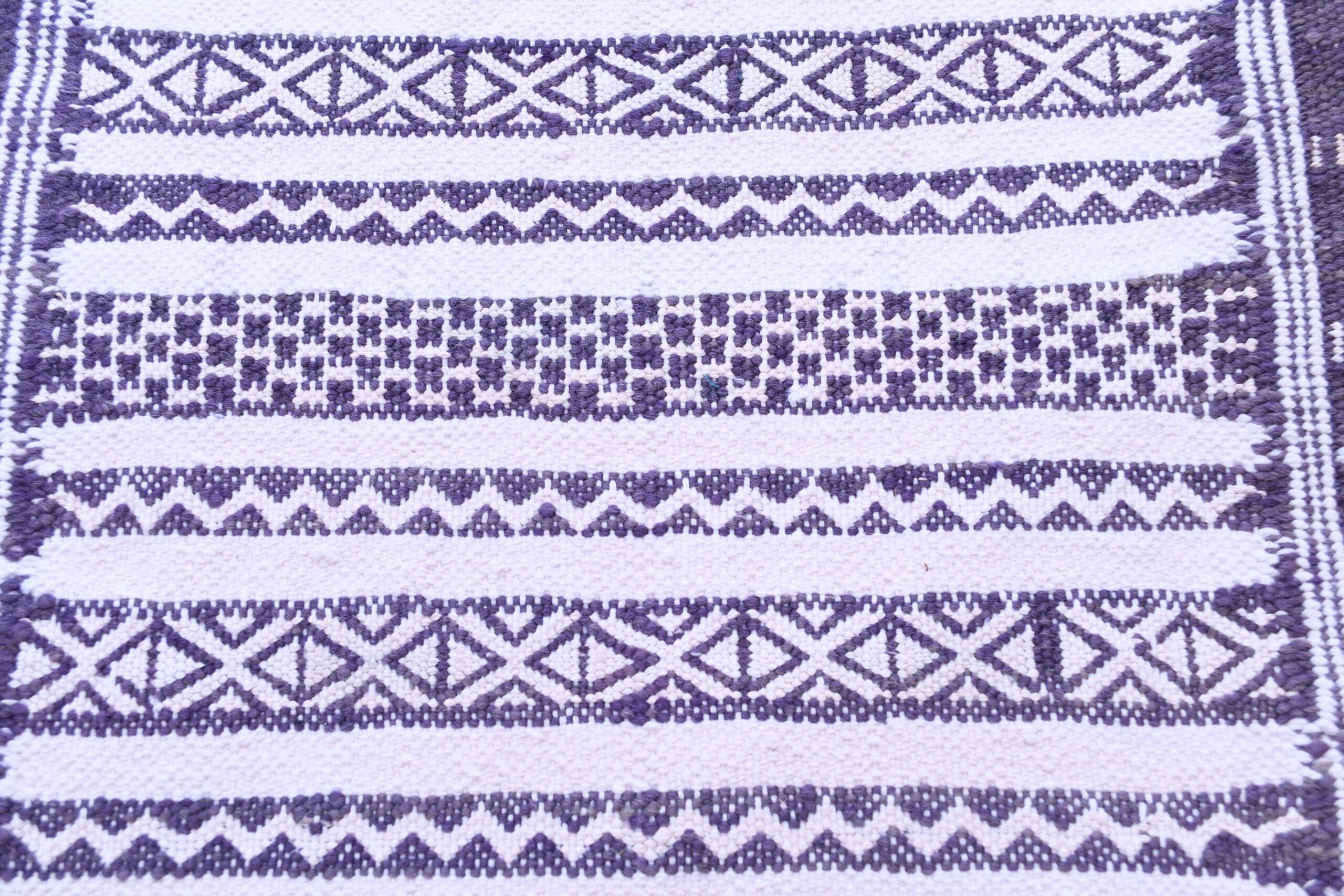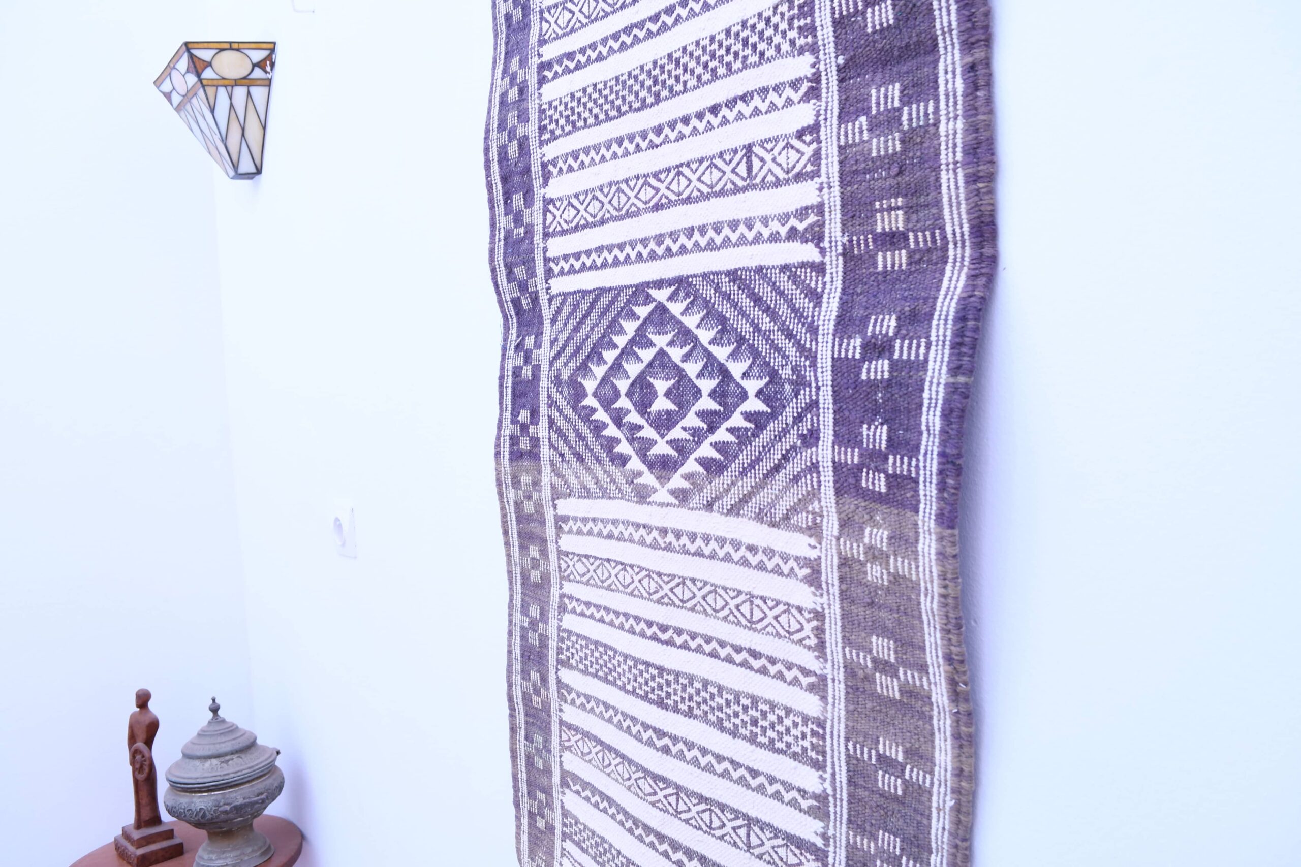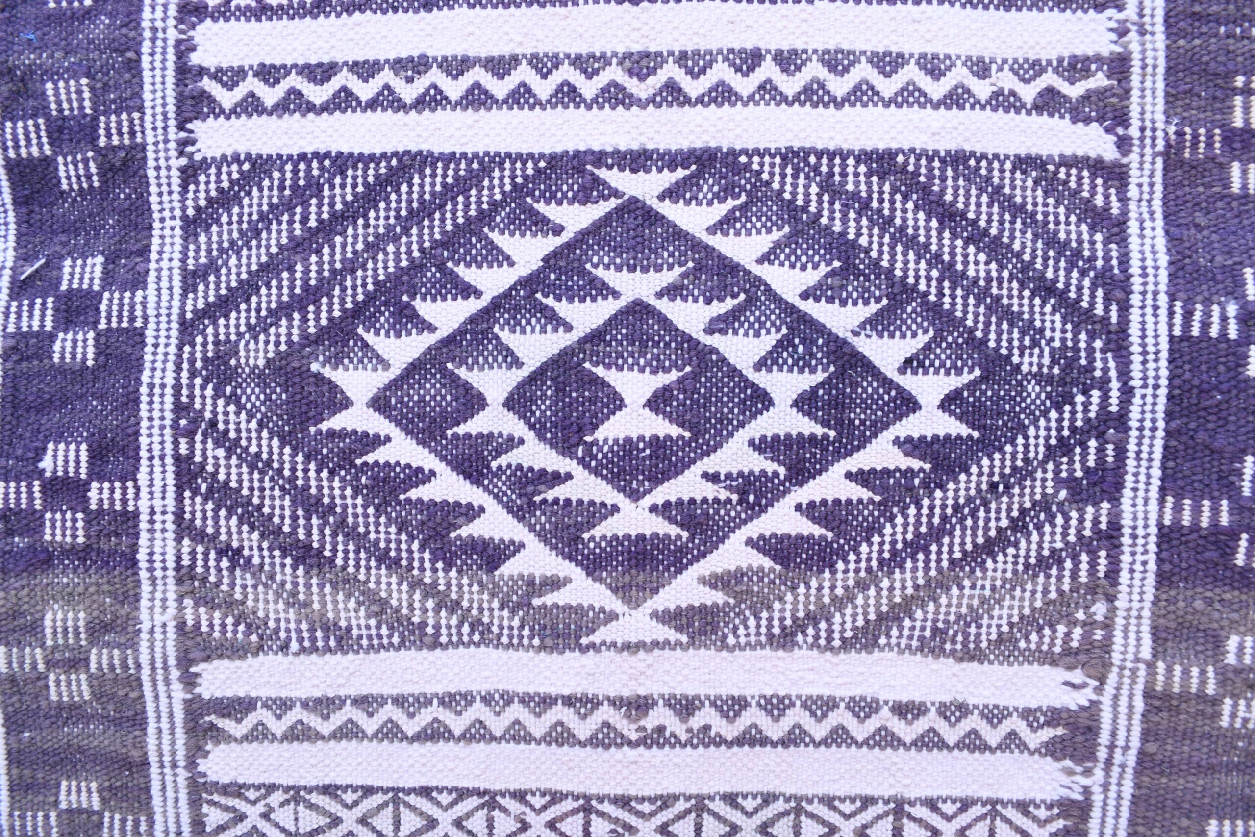 Dieser exquisite Tiflet-Kelim-Teppich mit den Maßen 57,00 × 113,00 cm besticht durch ein faszinierendes geometrisches Muster. Das zentrale Rautenmotiv ist von komplexen linearen Mustern umgeben, die traditionelle marokkanische Kunst verkörpern. Jedes Element des Musters ist sorgfältig ausgearbeitet und spiegelt das kulturelle Erbe und das künstlerische Flair der marokkanischen Teppichherstellung wider.