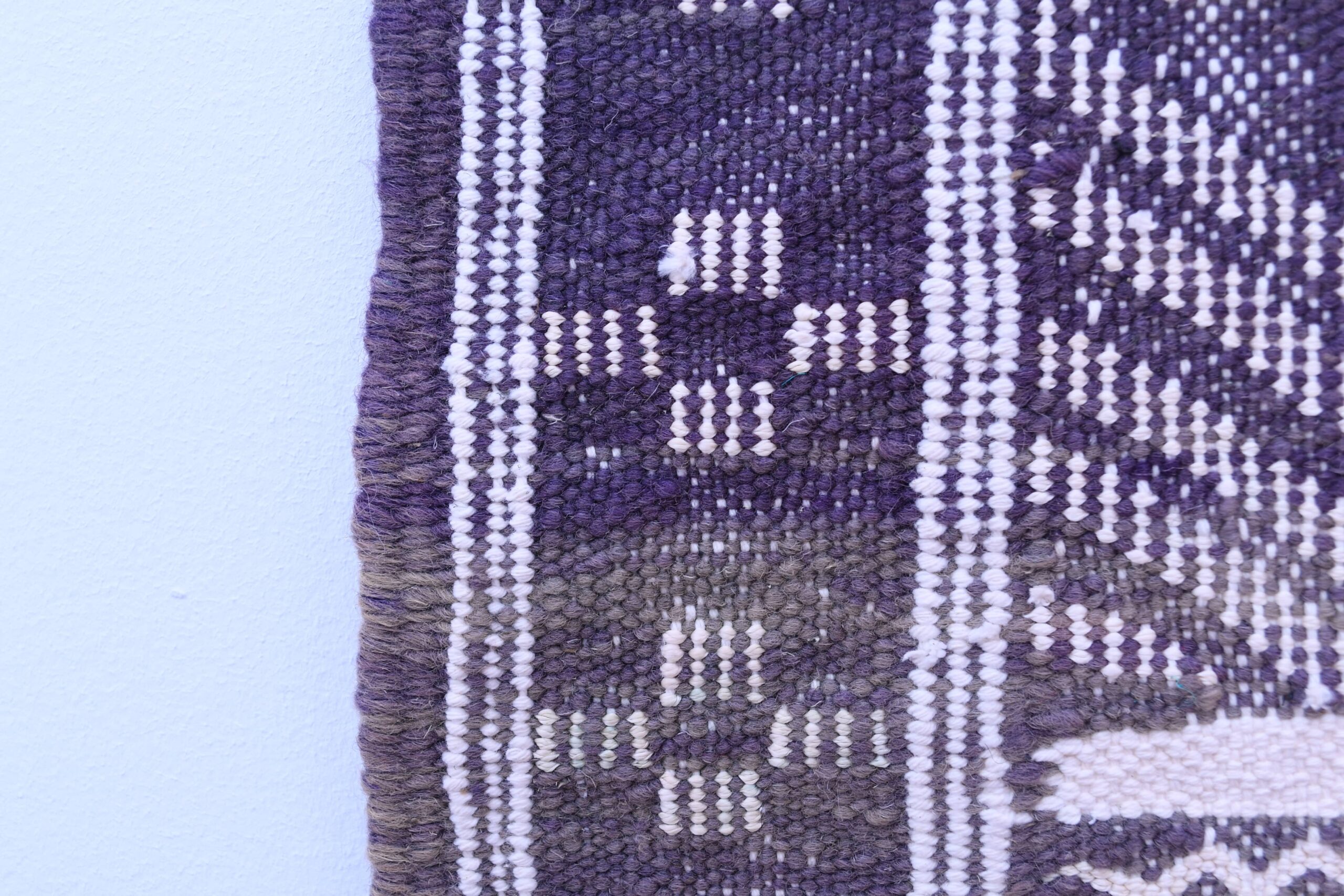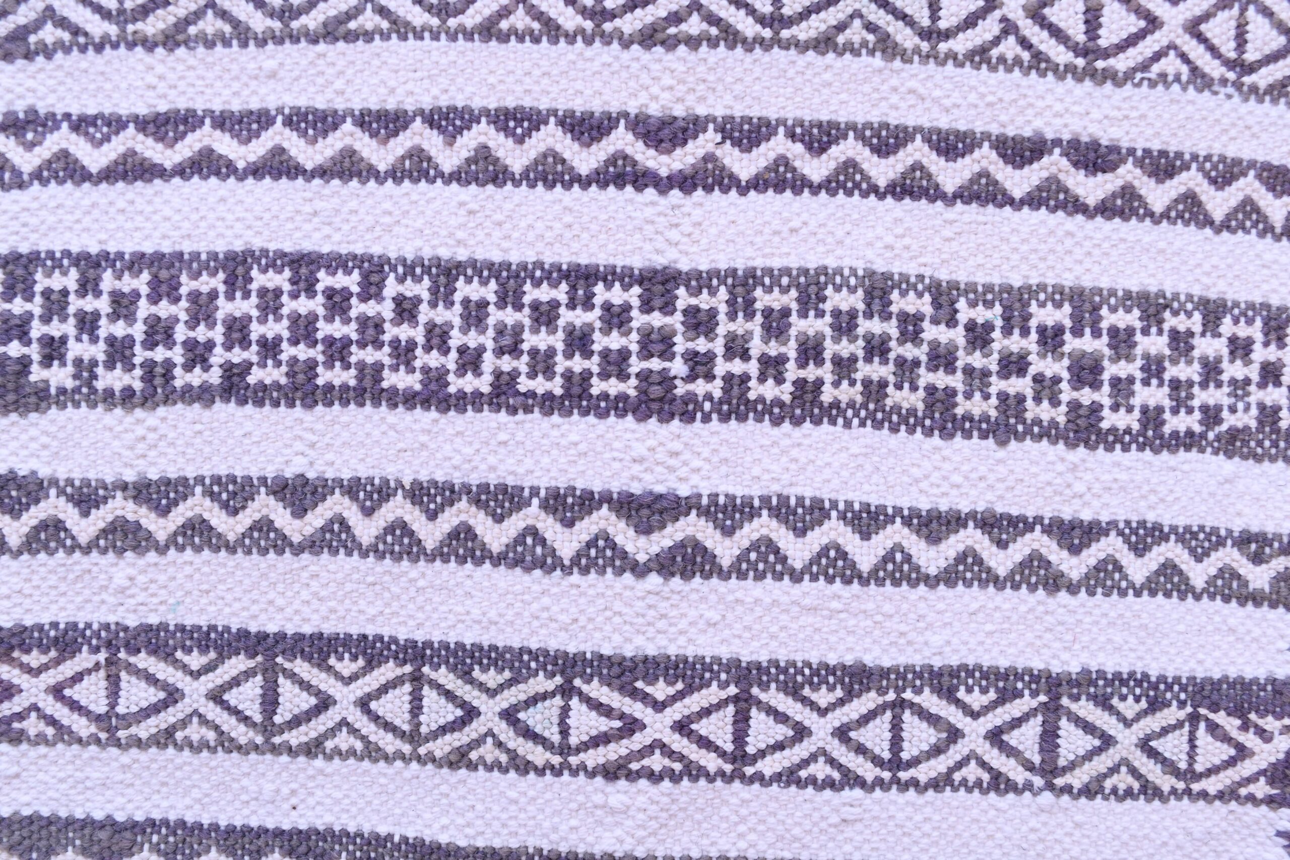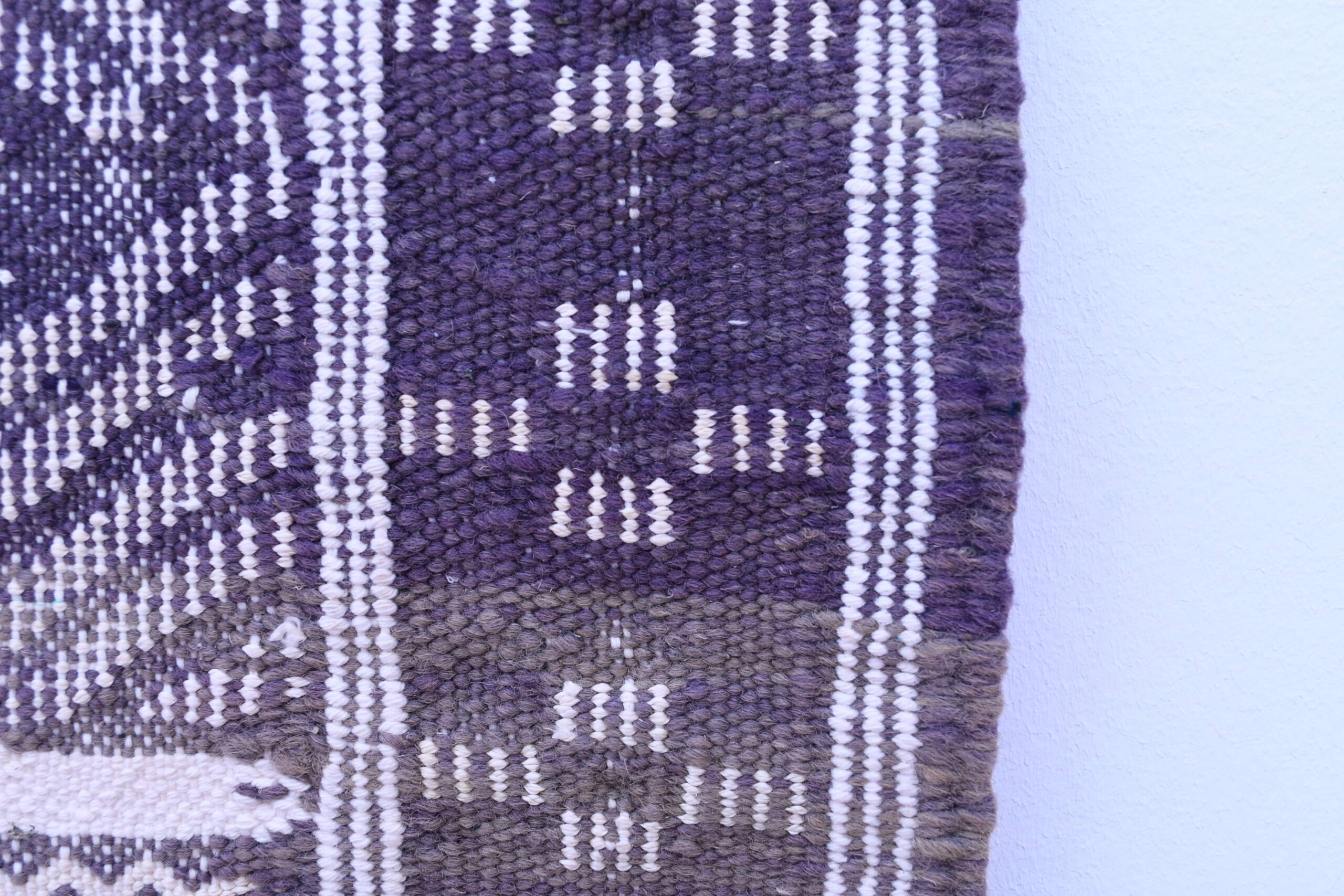Dieser exquisite Tiflet-Kelim-Teppich mit den Maßen 57,00 × 113,00 cm besticht durch ein faszinierendes geometrisches Muster. Das zentrale Rautenmotiv ist von komplexen linearen Mustern umgeben, die traditionelle marokkanische Kunst verkörpern. Jedes Element des Musters ist sorgfältig ausgearbeitet und spiegelt das kulturelle Erbe und das künstlerische Flair der marokkanischen Teppichherstellung wider.