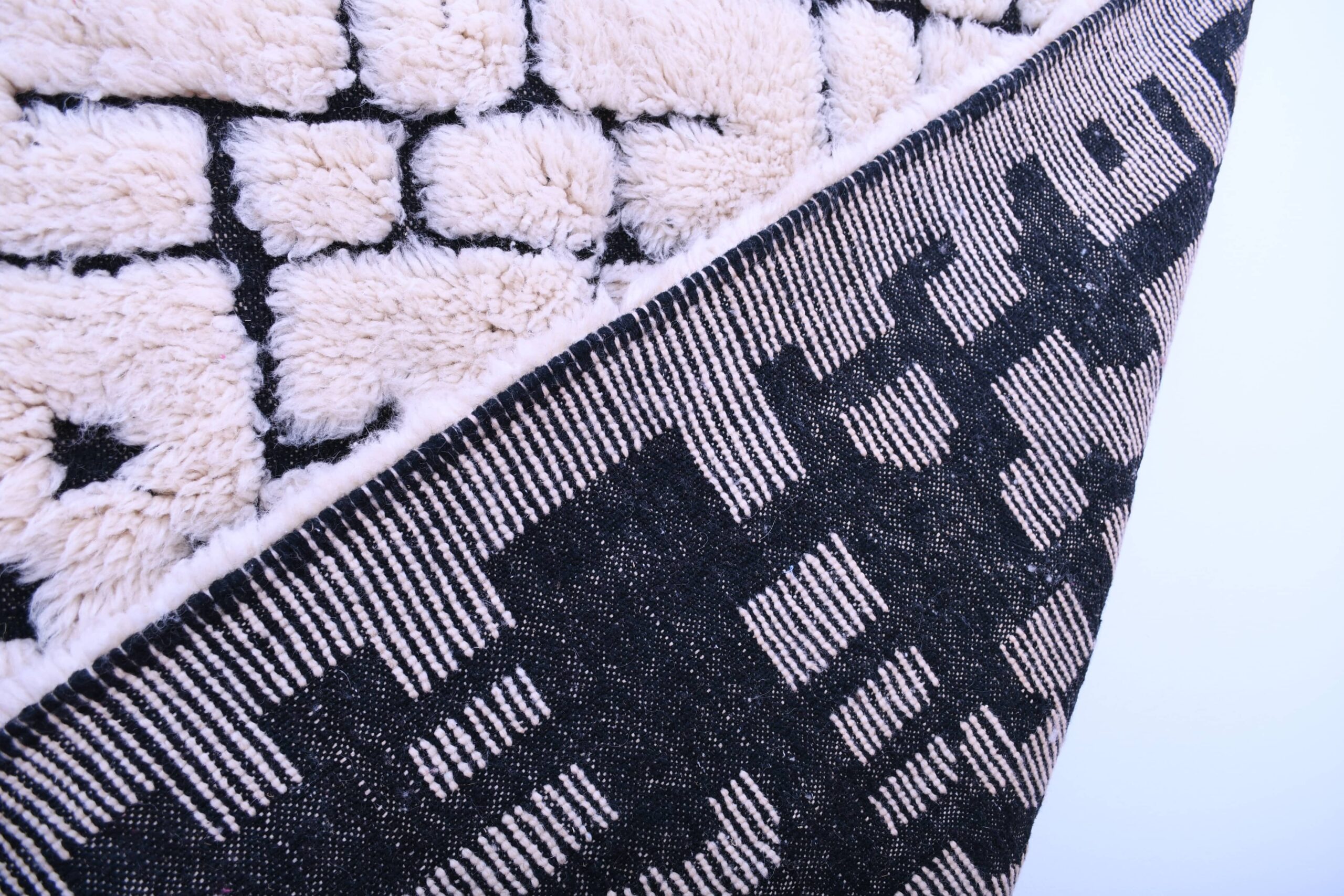 This authentic handmade Moroccan rug is a plush wool area rug designed to warm up modern American homes. In a versatile ivory and black palette, this Moroccan rug adds bold contrast without feeling busy—perfect for a living room rug under a sofa and coffee table or as a cozy bedroom area rug. Handwoven by 3rd generation Berber artisans and fair trade certified, it’s the kind of statement piece that still reads clean, minimalist, and timeless.