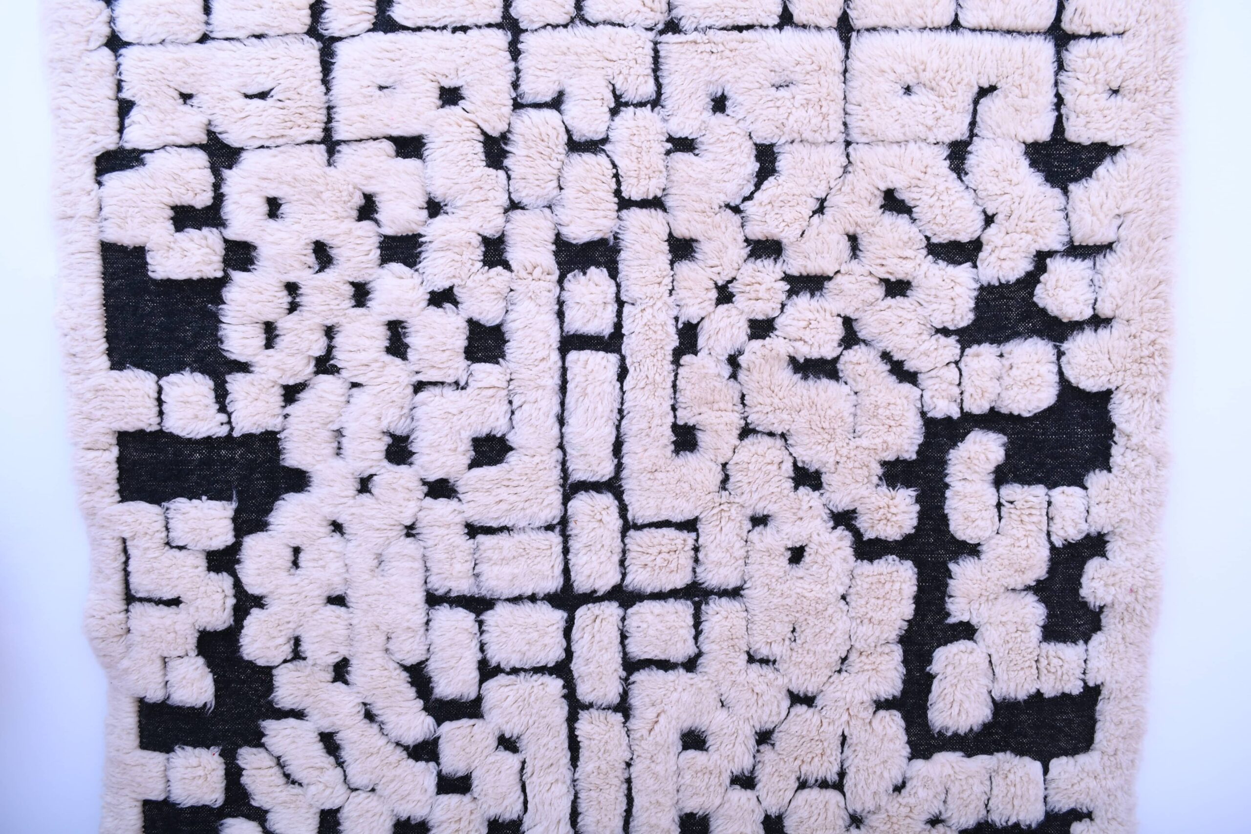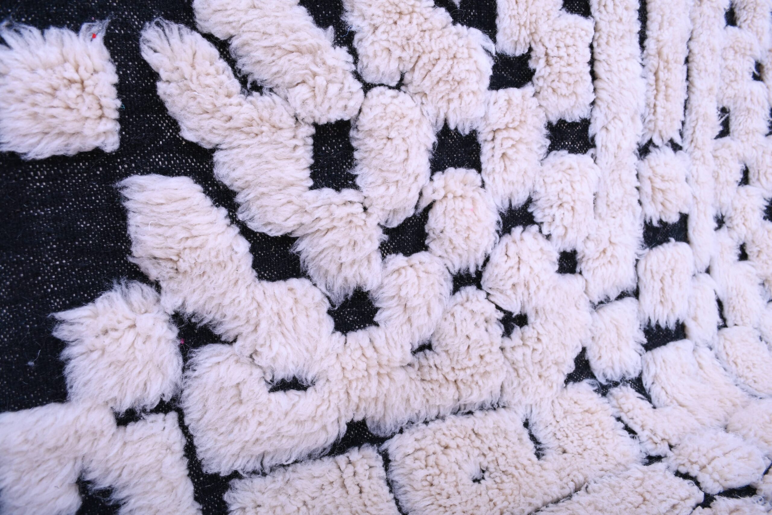 The look: creamy ivory wool with deep black geometric blocks and linework that feels modern, graphic, and Scandinavian-friendly. The pile is soft and plush—great for barefoot mornings and lounging. This wool rug works beautifully with boho, minimalist, modern farmhouse, and mid-century modern interiors, and it’s an easy match with neutral sofas, warm wood floors, and black accents. Use it as a living room area rug to anchor seating, or as a bedroom rug to create a calm, cozy landing zone.