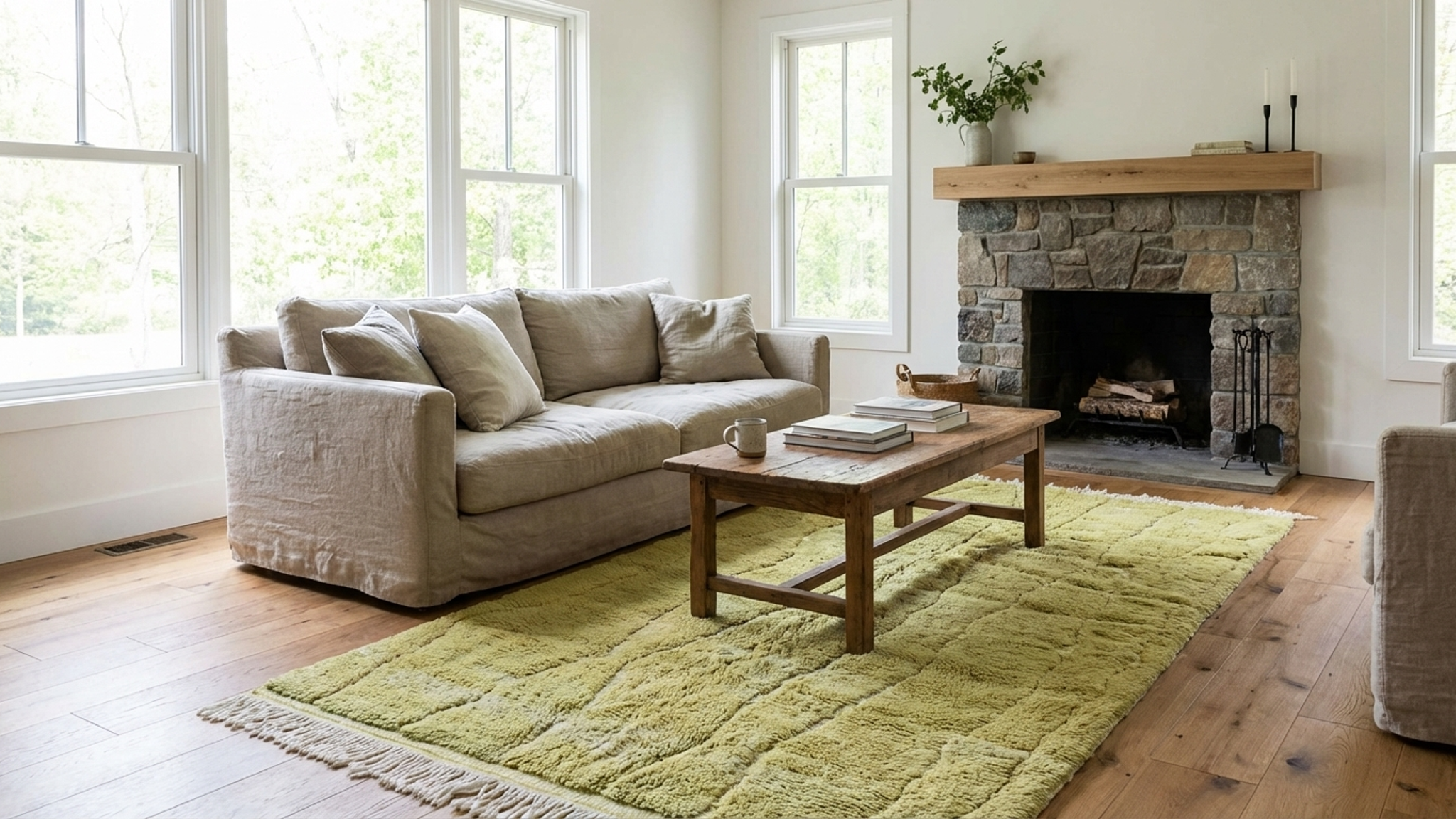 This authentic handmade Moroccan rug is a cozy, plush wool area rug designed to warm up modern American homes. The soft olive green (sage-leaning) tone reads as a calm neutral and pairs beautifully with light wood, linen sofas, and stone textures. Use this Moroccan rug as a living room rug to anchor your seating area,