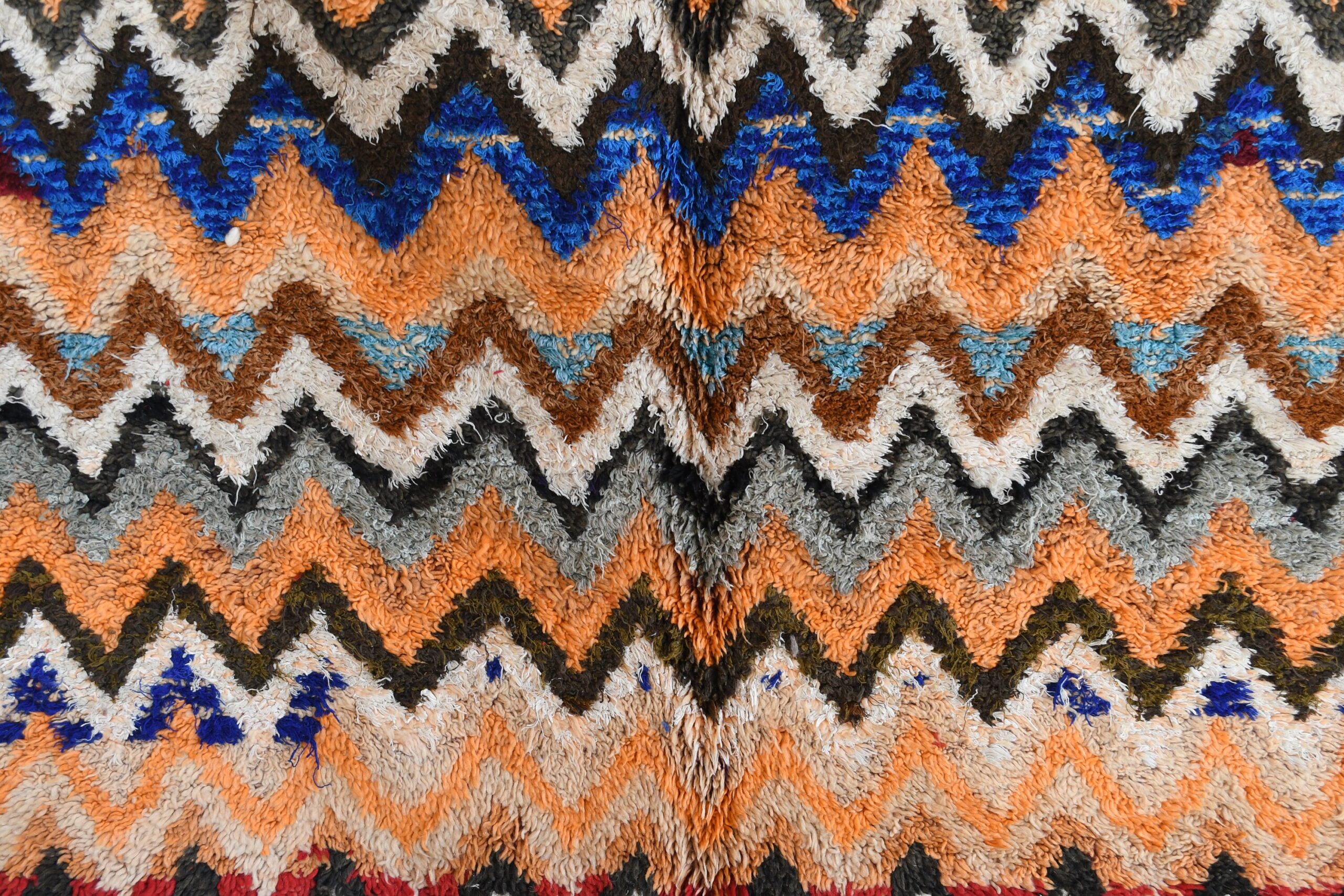 Designed to energize a space without overwhelming it, this Berber rug features rhythmic chevron/zigzag bands that read beautifully from across a room. You’ll see crisp ivory and black contrast anchored by warm rust and orange, with pops of cobalt blue, turquoise, coral, red, and olive green. The wool pile feels soft and springy underfoot with a cozy, artisan texture—ideal for a living room rug, studio, or open-plan space where a large area rug defines the seating zone.