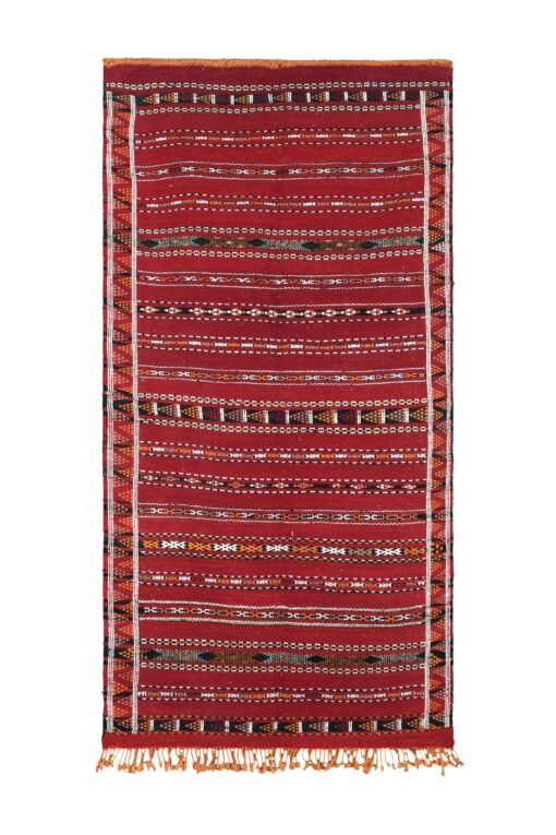 This Zemmour rug, measuring 114.00 × 228.00 cm, is a stunning example of traditional Moroccan craftsmanship. The intricate geometric patterns and motifs are a hallmark of the Zemmour style, showcasing a harmonious blend of cultural artistry and skilled weaving. The rug features a series of symmetrical designs, each telling a story of the rich heritage from which it originates.
