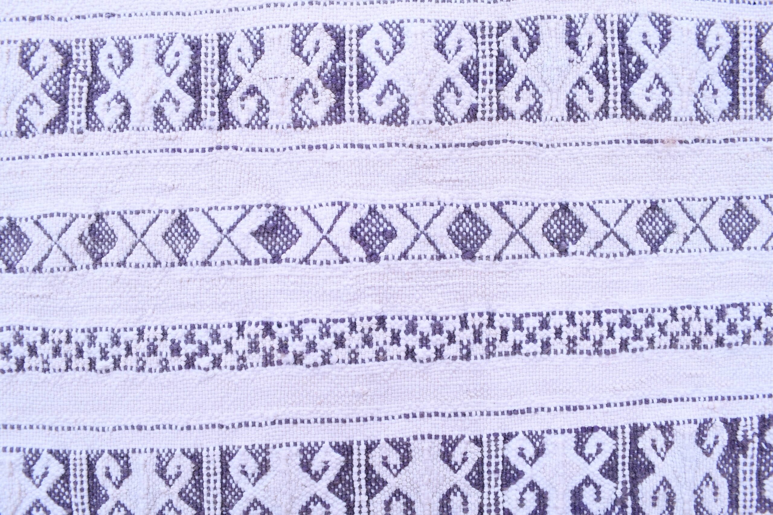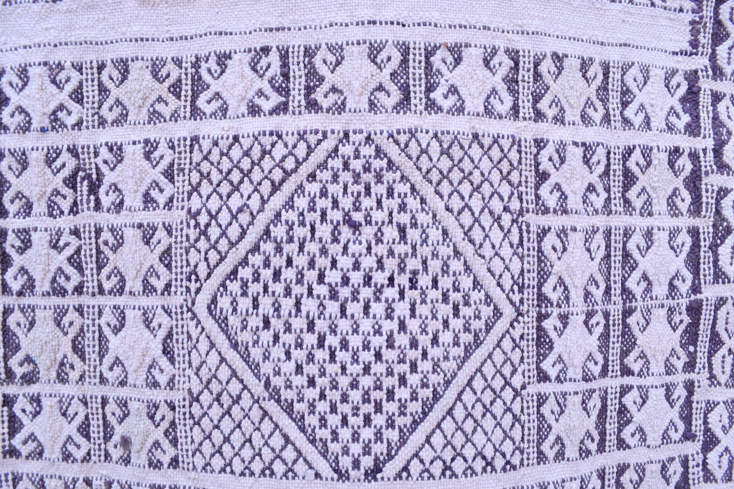 Esta impresionante alfombra Tiflet Kilim, de 104 × 157 cm, presenta intrincados patrones geométricos y motivos tradicionales característicos del arte marroquí. El diseño presenta una disposición simétrica de rombos y estrellas que crea una sensación de armonía y equilibrio.