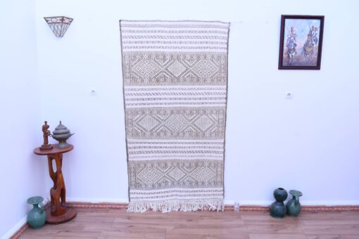 Hecha a mano con lana de alta calidad, esta alfombra Tiflet Kilim es un ejemplo de artesanía excepcional. Su tejido denso y su material resistente garantizan una larga vida útil, mientras que su suave textura proporciona comodidad al caminar. Cada pieza es un testimonio de la habilidad y la dedicación de los artesanos marroquíes, ofreciendo un complemento único y auténtico para su hogar.