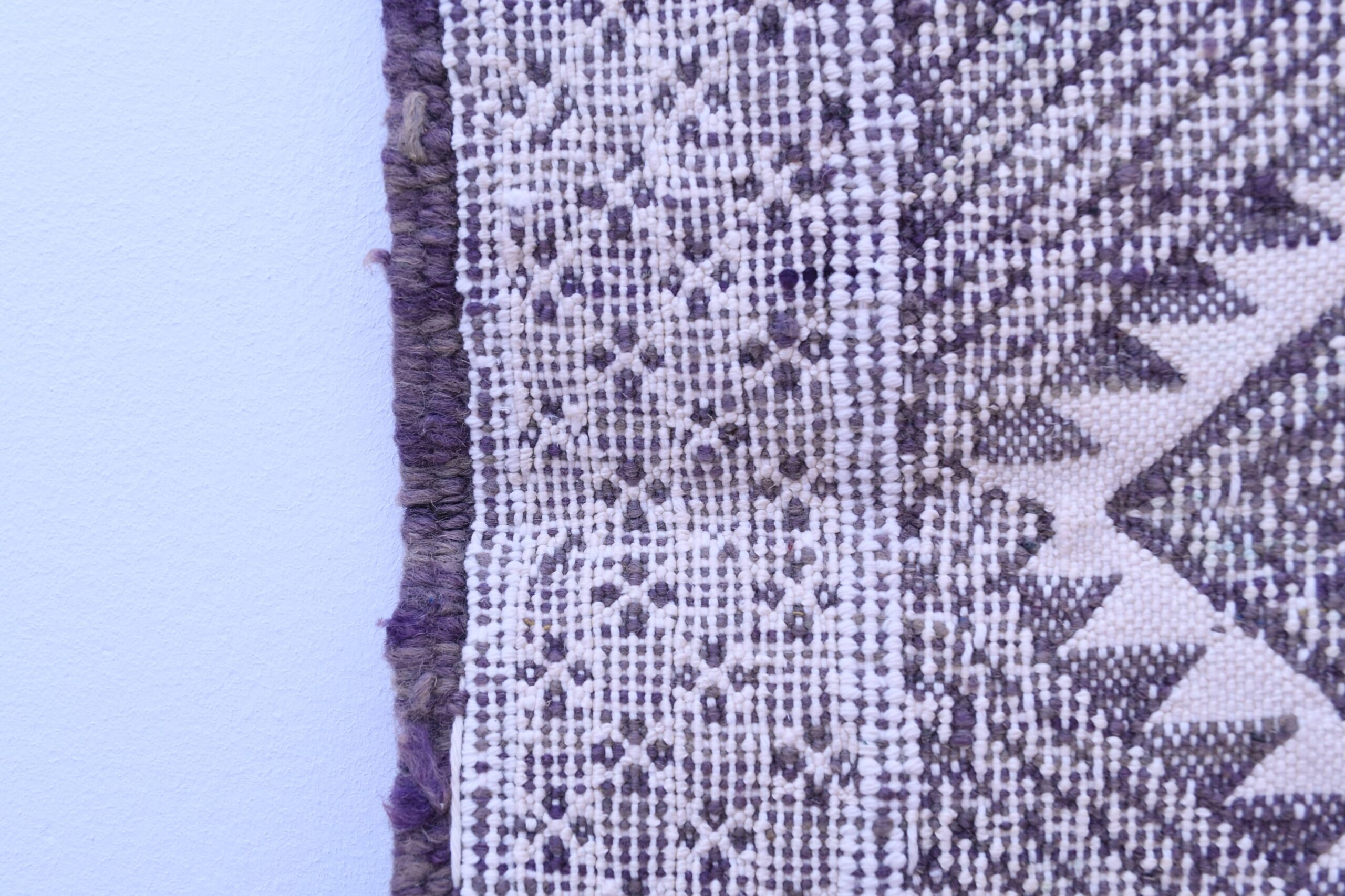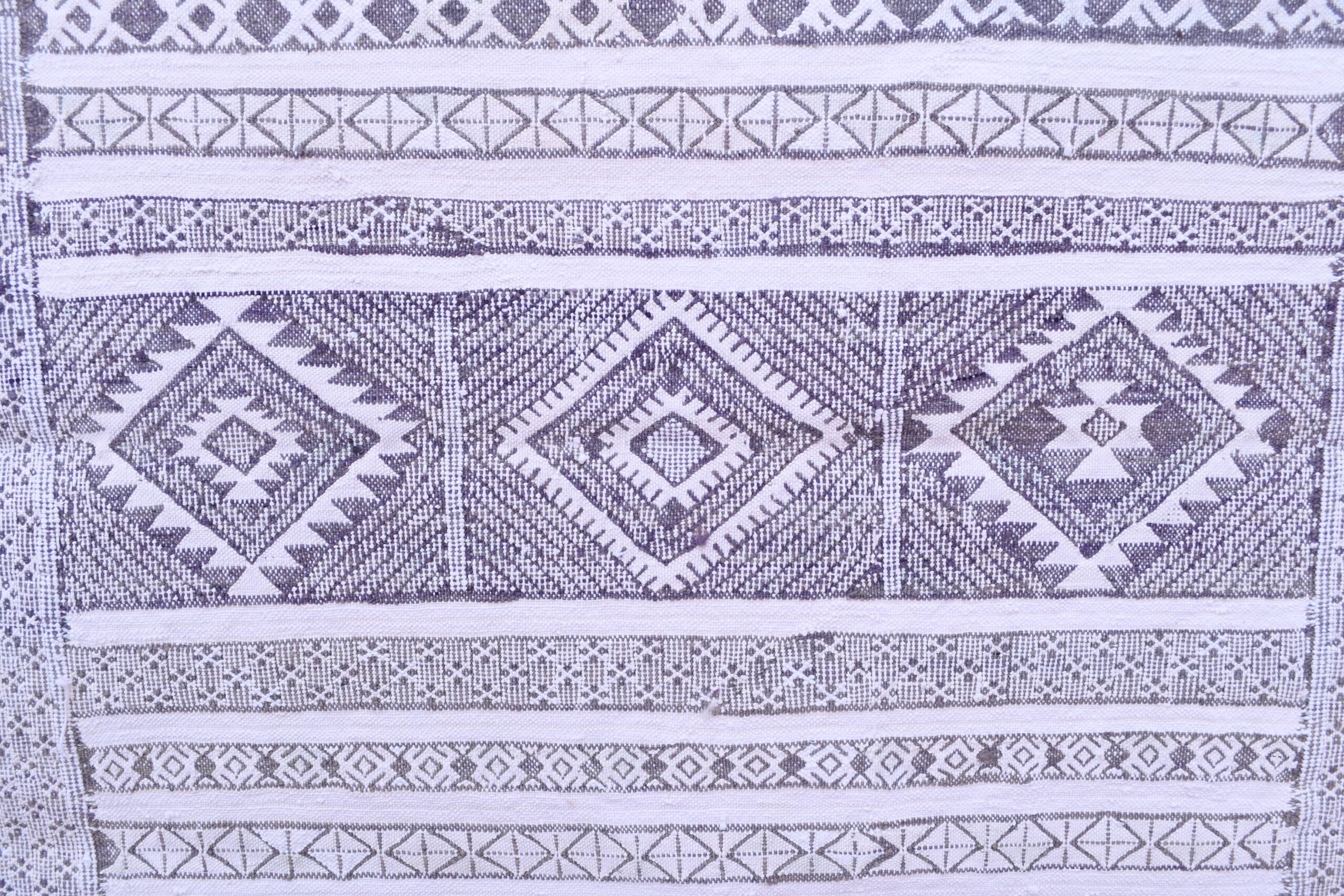 Esta impresionante alfombra kilim Tiflet, de 96 × 150 cm, exhibe la intrincada artesanía marroquí. Presenta una cautivadora variedad de patrones geométricos, como rombos y rayas, meticulosamente tejidos para crear un diseño armonioso. Estos motivos son tradicionales de la región de Tiflet y representan un rico patrimonio cultural.