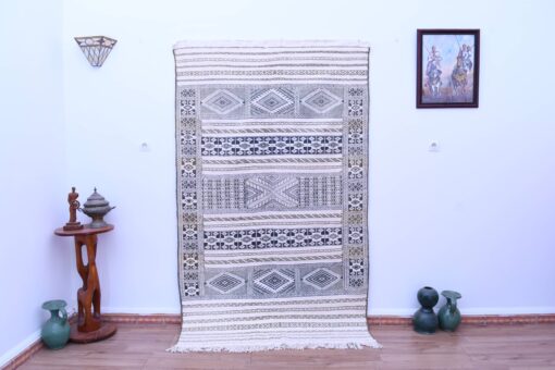 The craftsmanship of this Tiflet Kilim rug is evident in its detailed weaving and durable construction. Each pattern is skillfully crafted, reflecting the rich heritage and expertise of Moroccan artisans. The quality of the weave ensures longevity and resilience, making it a valuable addition to any home.
