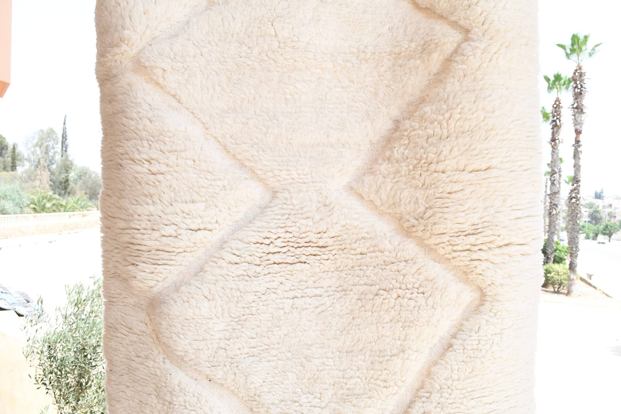 This ivory/cream Moroccan wool rug features a classic raised diamond pattern that reads subtle and sophisticated—perfect if you want a Moroccan rug look without loud color. The plush wool pile feels warm and soft underfoot, and the neutral palette pairs easily with minimalist, Scandinavian, modern farmhouse, mid-century modern, and coastal boho interiors. Use it as a bedroom rug for a soft landing, an entryway area rug to brighten a narrow space, or a cozy accent in your living room.