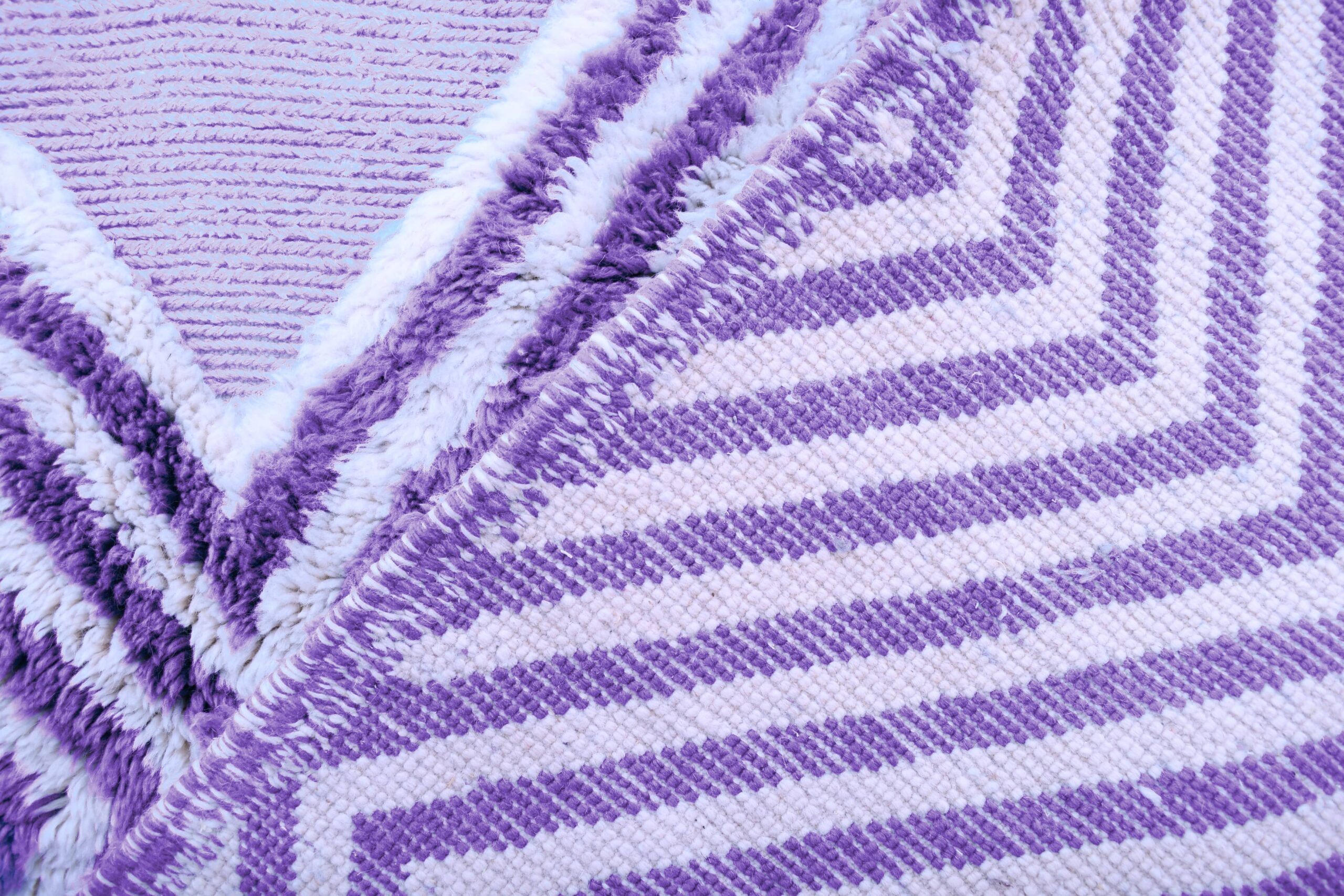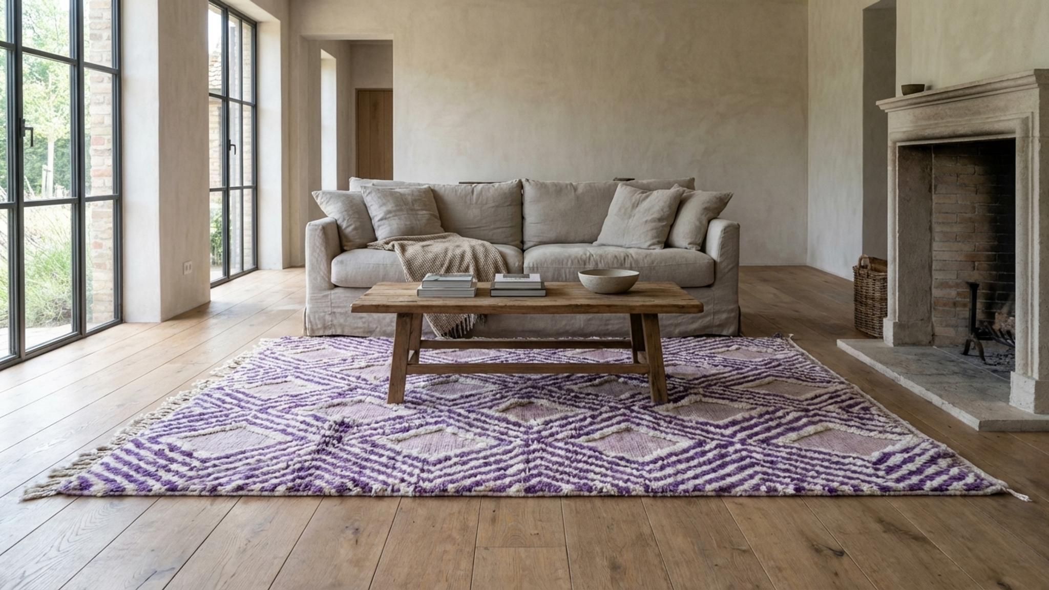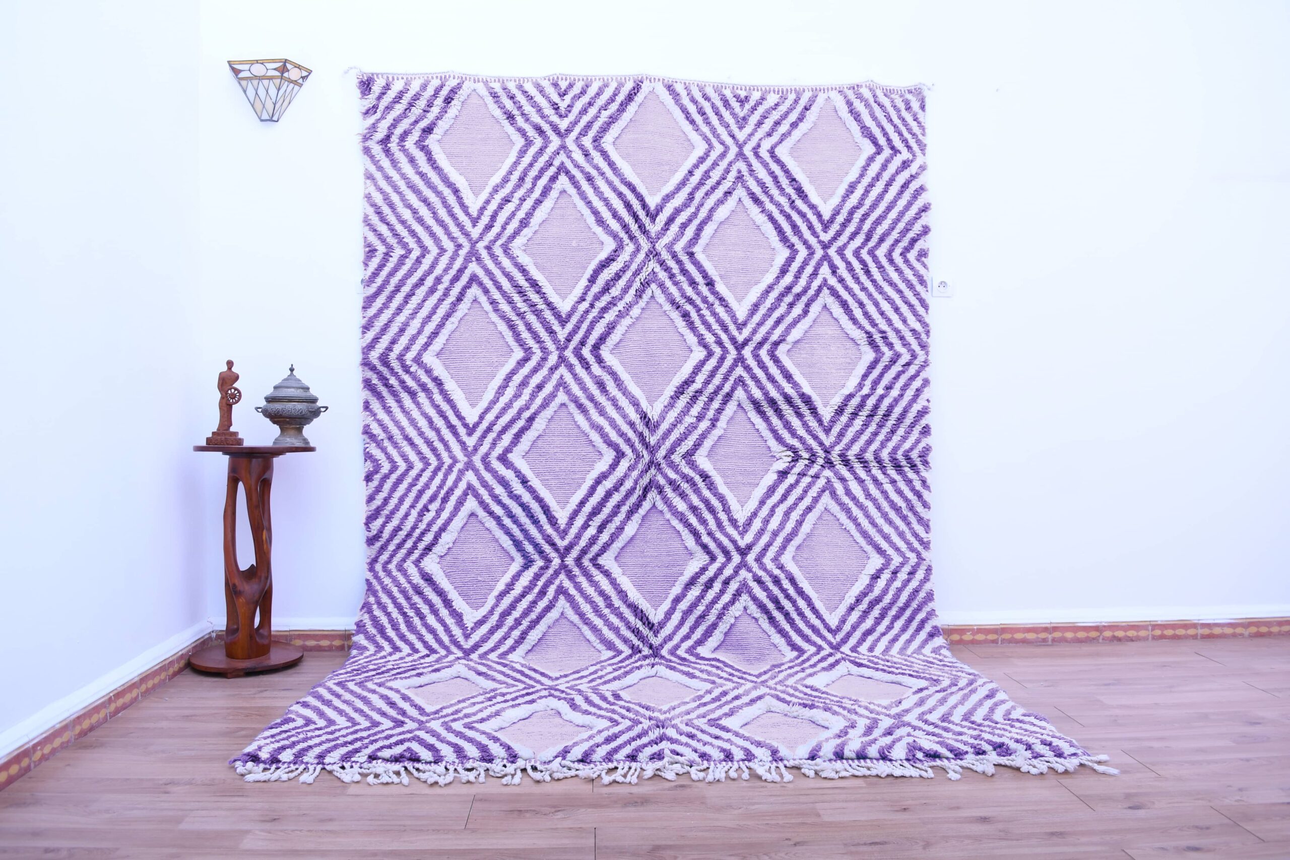 Väripaletti on neutraali kermanvärinen/norsunluuvärinen ja siinä on laventelin violetit viivat, jotka luovat puhtaan ja modernin "boho-minimalistisen" tunnelman. Toistuva timanttikuvio lisää rakennetta, joka sopii kauniisti skandinaaviseen, moderniin maalaistalotyyliin, 1900-luvun puolivälin moderniin ja rannikkotyyliseen boheemiin sisustukseen. Jos olet etsinyt käsintehtyä villamattoa, joka tuntuu sekä viihtyisältä että hienostuneelta, tämä marokkolainen matto antaa sinulle tekstuuria ja lämpöä näyttäen silti huolellisesti valitulta ja ylelliseltä.