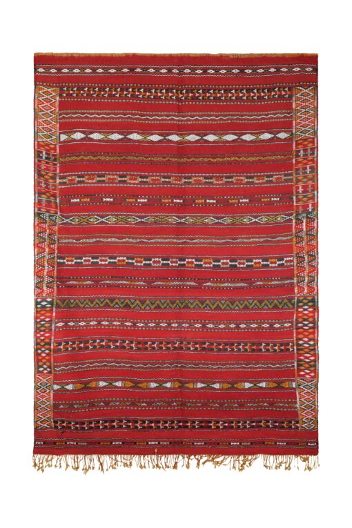 La palette de couleurs vibrantes du tapis est dominée par un rouge profond et luxueux, rehaussé de touches de noir, de blanc et de tons terreux. Ces couleurs sont savamment entrelacées pour créer une expérience visuelle dynamique et captivante. L'audace rouge sert de toile de fond saisissante, tandis que les teintes contrastées mettent en valeur les motifs complexes, faisant de ce tapis une pièce remarquable dans n'importe quel décor.
