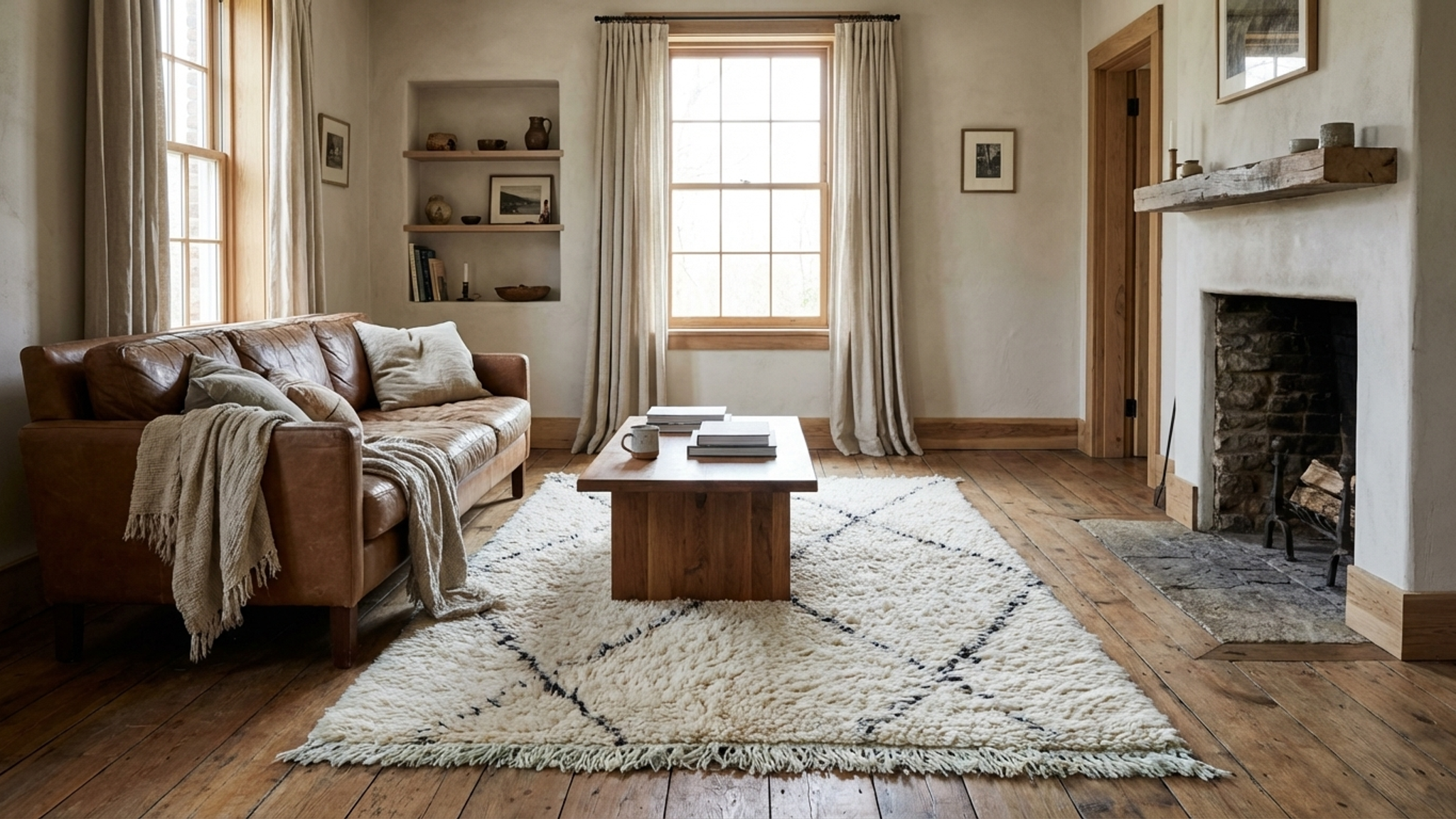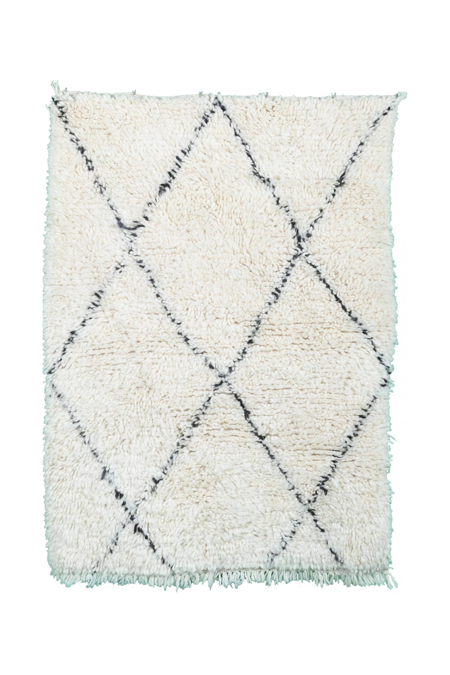 The color palette is soft ivory/cream with thin black lines—perfect for a neutral rug moment without feeling plain. The pattern is a classic diamond grid that works in boho, minimalist, and modern spaces and pairs beautifully with Scandinavian, modern farmhouse, mid-century modern, or coastal boho interiors. Use this Moroccan wool rug as a small living room rug layer, a bedroom area rug beside the bed, or a plush accent rug in an office. The thick wool texture adds warmth, comfort, and sound-softening in hardwood-floor rooms.