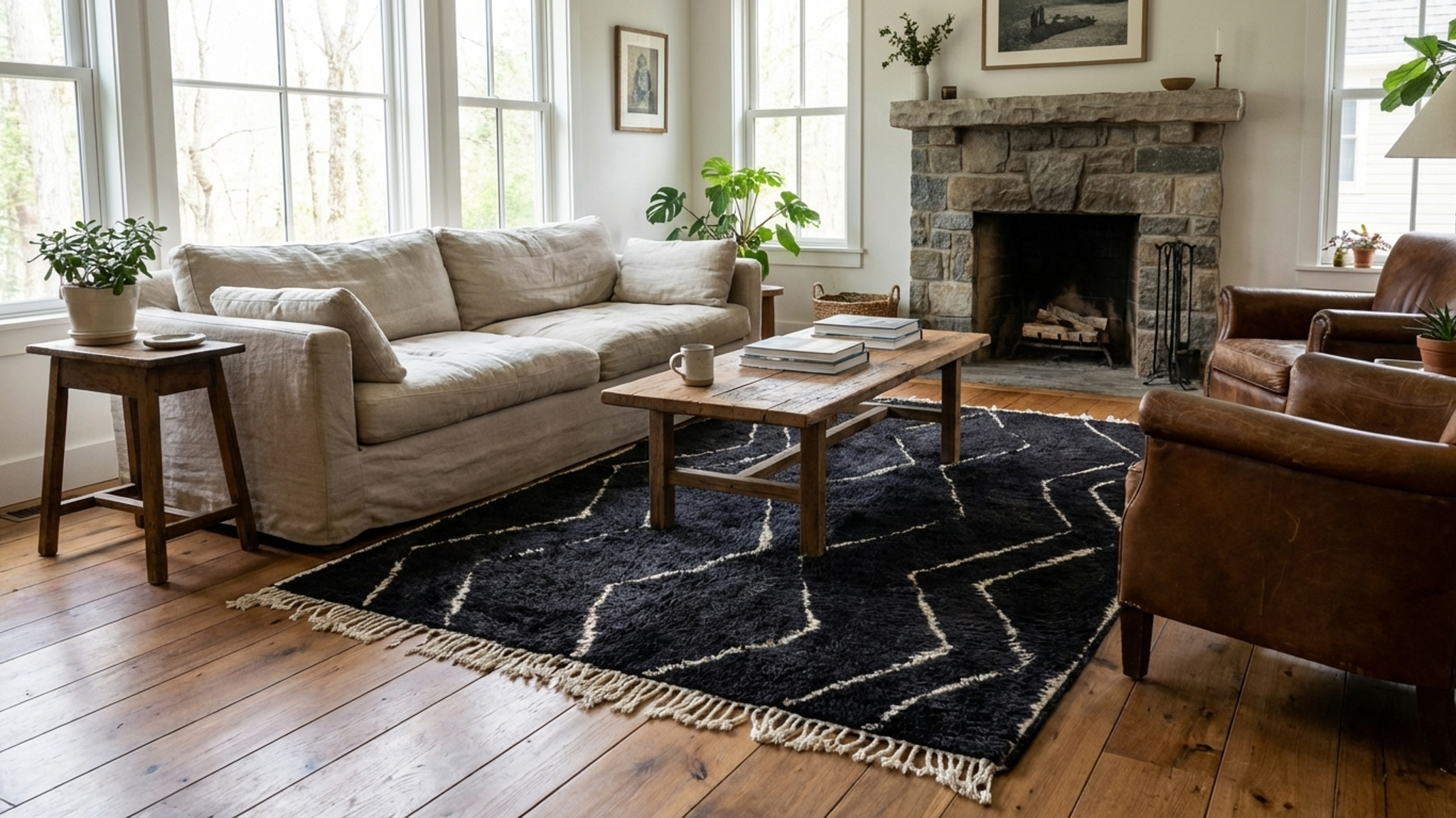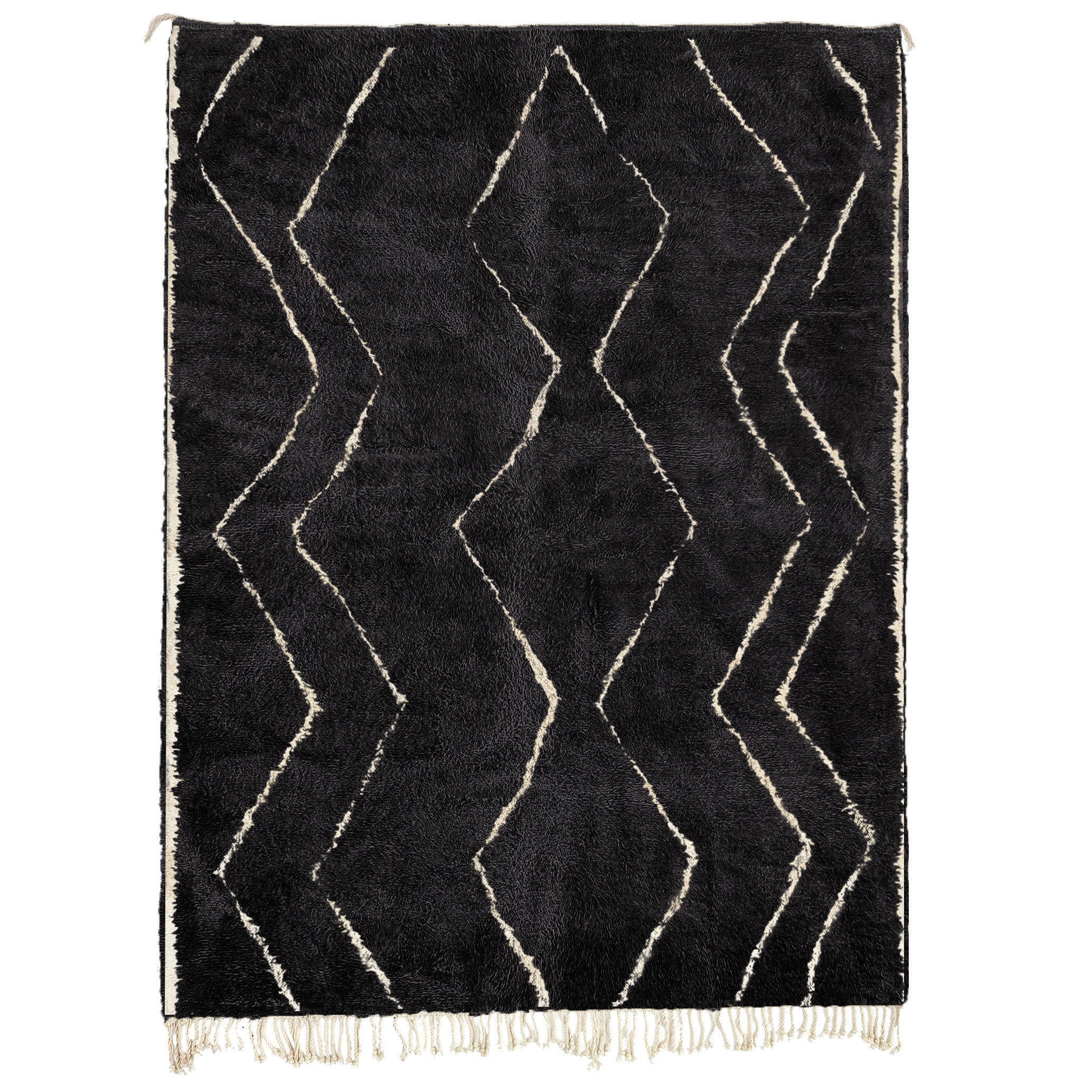 This authentic handmade Moroccan rug brings bold, clean style to your home with a deep black wool field and ivory geometric lines. This Moroccan rug is a timeless statement piece that instantly warms up a living room or bedroom while still feeling modern and minimalist. Handwoven by 3rd generation Berber artisans and fair trade certified, it’s the kind of wool rug you buy once and keep for years—soft, plush, and made to be lived on.