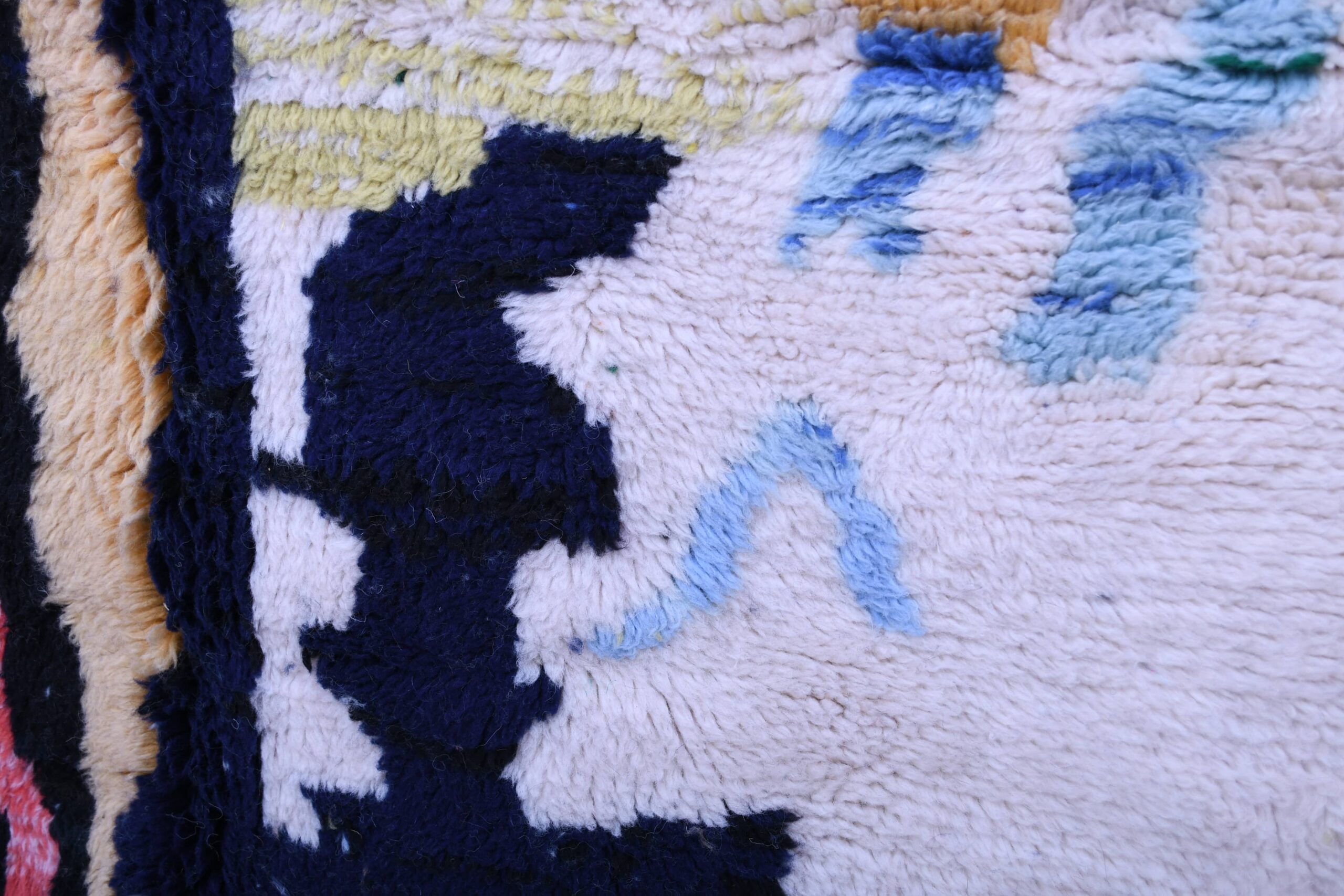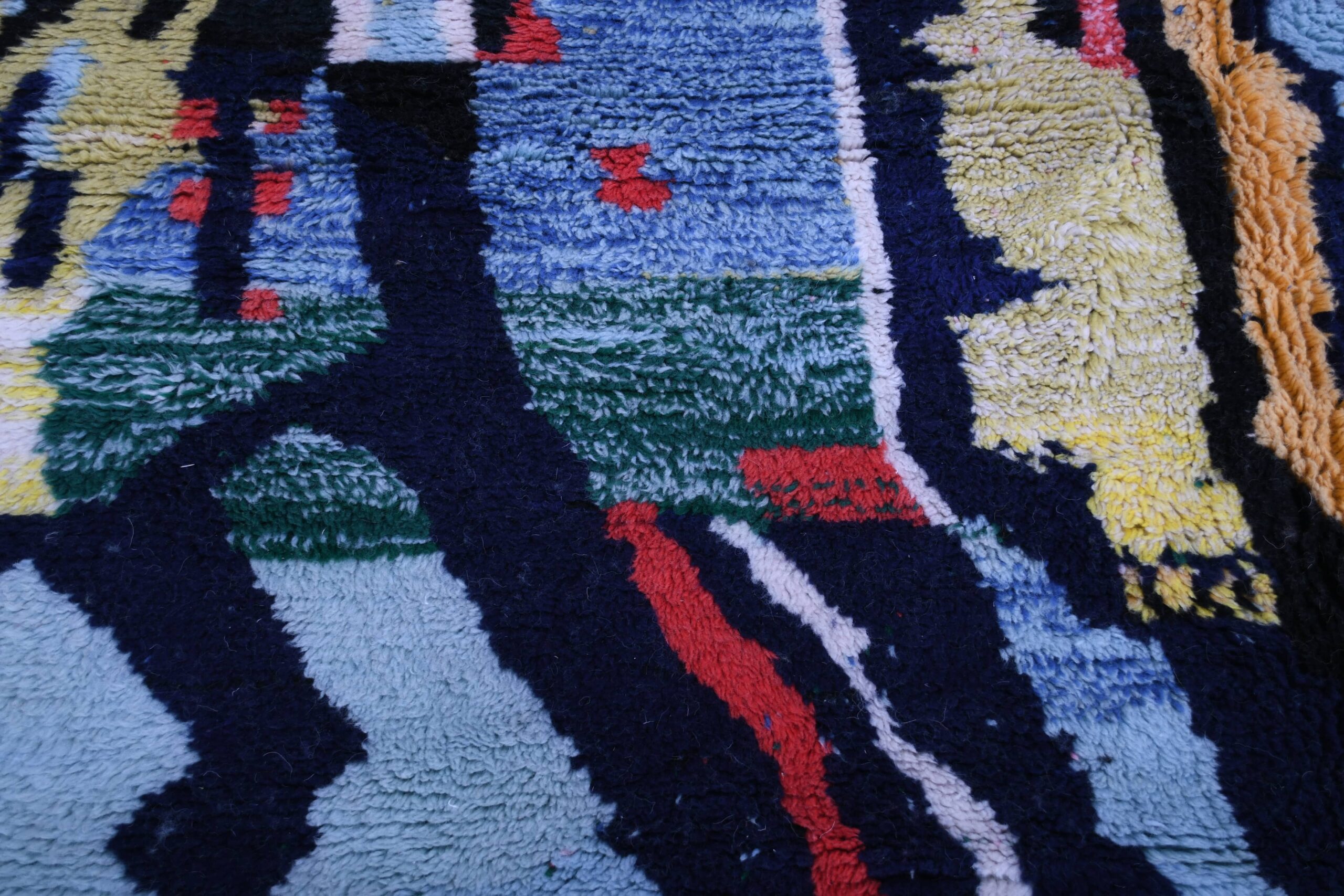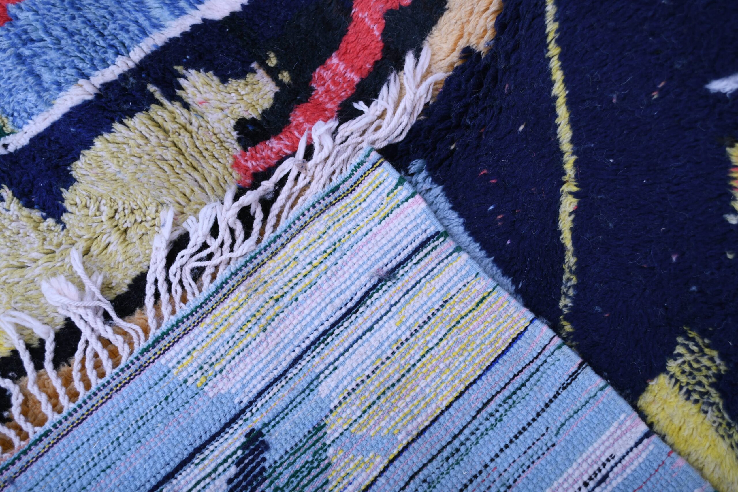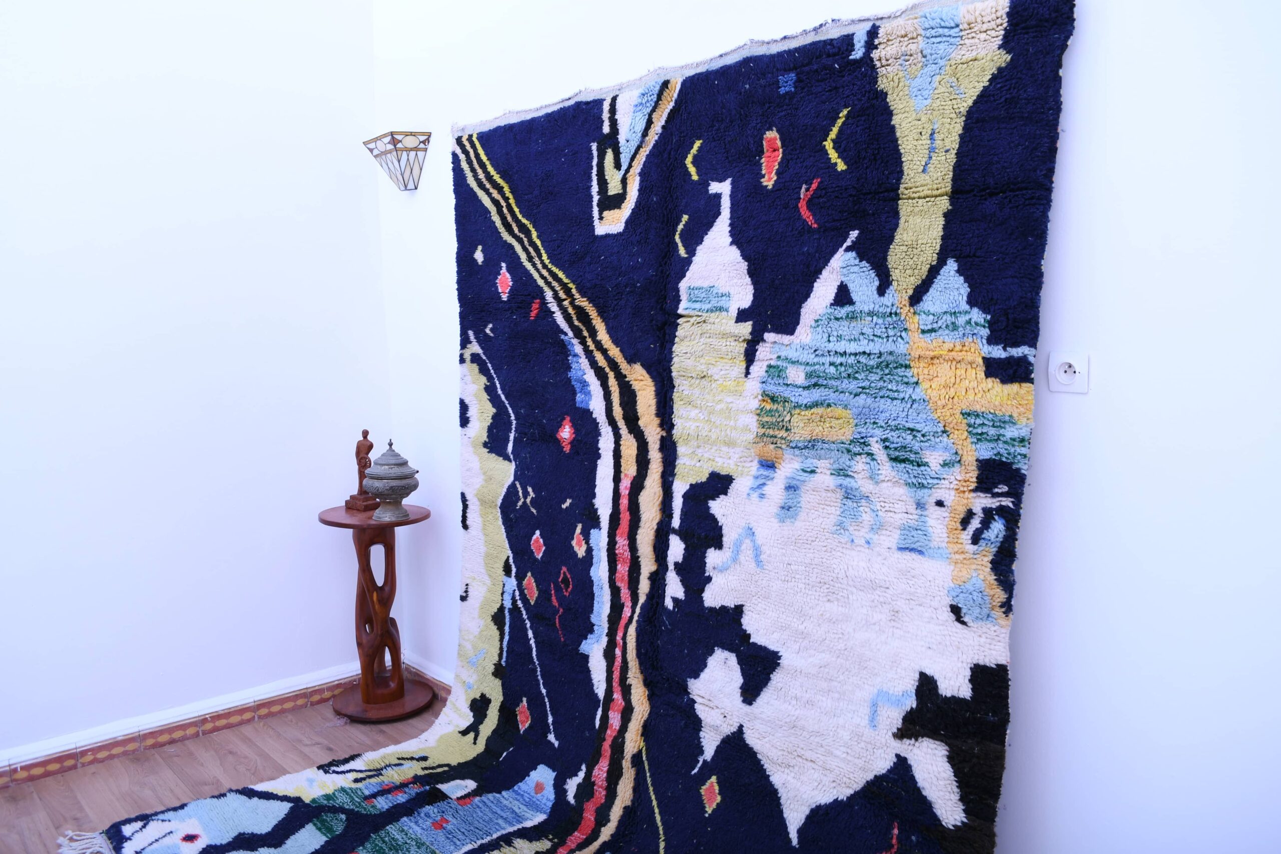 Ce véritable tapis marocain fait main est une pièce maîtresse audacieuse et moderne pour un intérieur américain. Idéal comme grand tapis de 213 x 305 cm dans un salon ou une chambre spacieuse. Tissé en laine 100% par des artisans berbères de troisième génération, ce tapis marocain mêle un bleu marine profond à des tons ivoire doux, bleu ciel et des touches chaudes pour un style bohème chic et contemporain. Certifié commerce équitable, c'est une pièce unique.