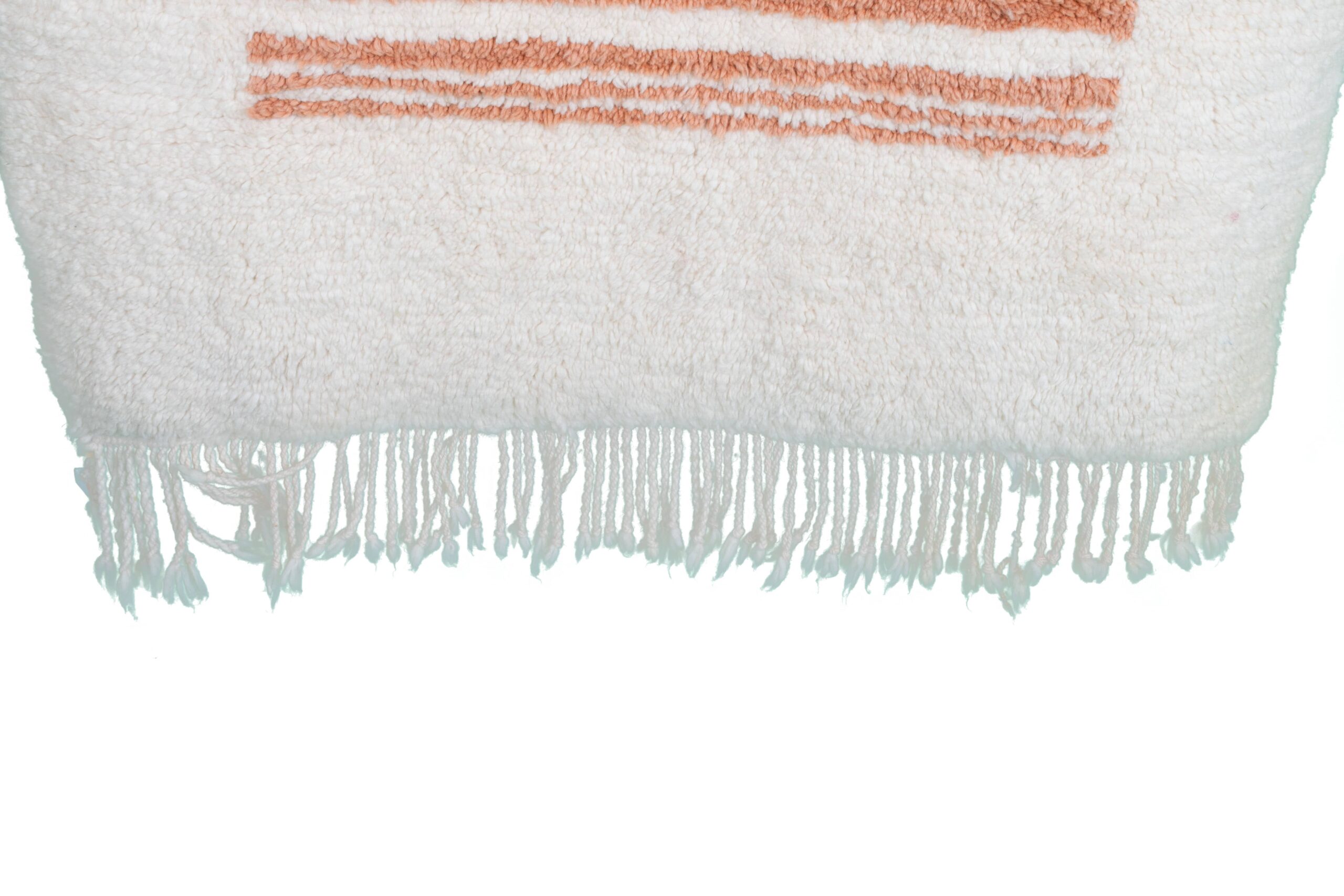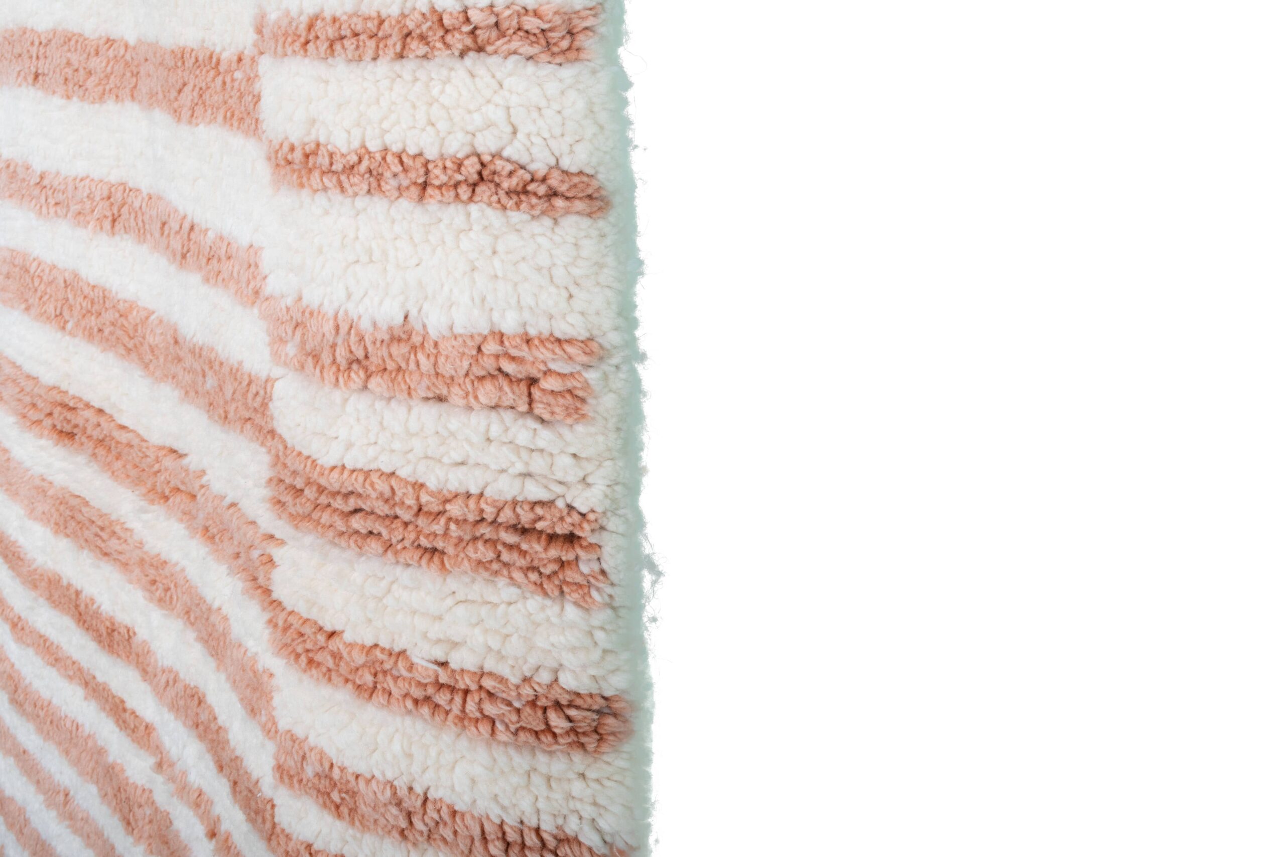 Ivory, cream, and warm blush/terracotta stripes make this a versatile neutral rug that works with boho, minimalist, and modern interiors. The clean striped pattern feels Scandinavian-friendly while still giving you the character of a true Moroccan wool rug. Use it as a living room rug to soften wood floors, or as a bedroom area rug for a cozy landing when you wake up. The thick, soft wool pile has that comfortable “sink-in” feel you expect from a high-end handmade rug.