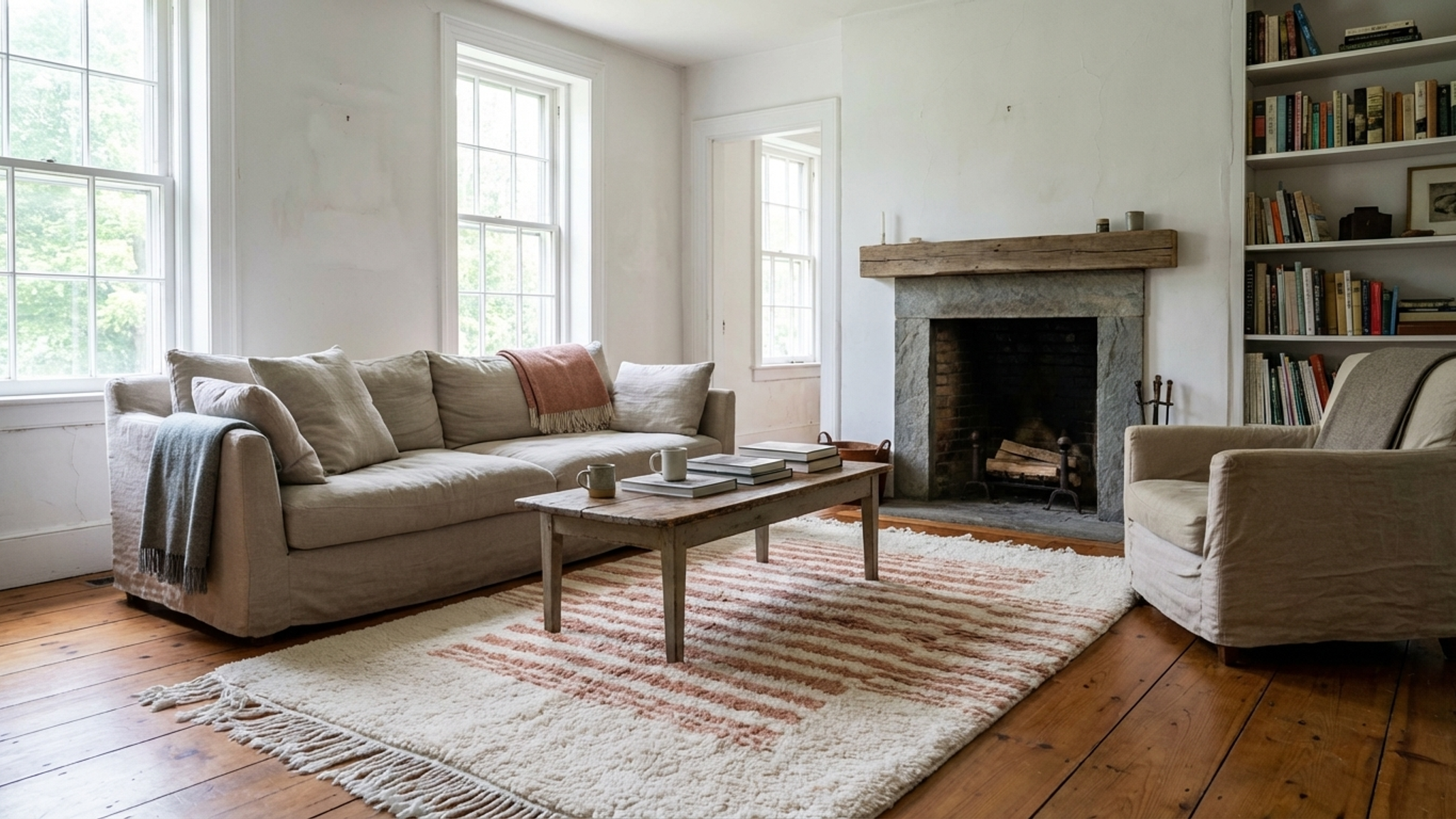This authentic handmade Moroccan rug is a plush wool area rug designed to warm up a living room, bedroom, or reading nook without overpowering your decor. This Moroccan rug measures 4×5 ft and features an ivory/cream base with soft blush terracotta stripes for an easy neutral look. Handwoven by 3rd generation Berber artisans and fair trade certified, it’s a premium wool rug that feels cozy underfoot and looks elevated in modern American homes.