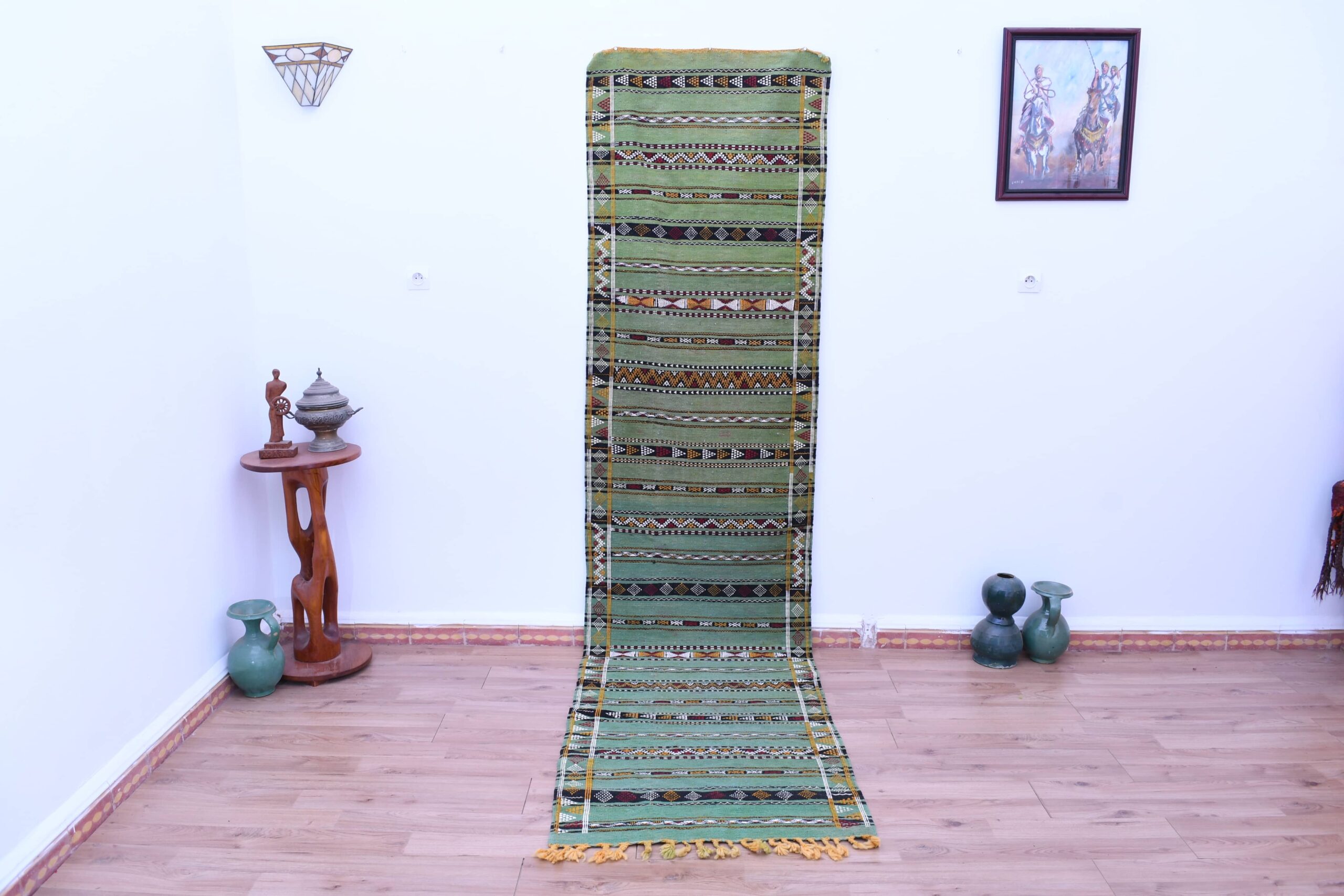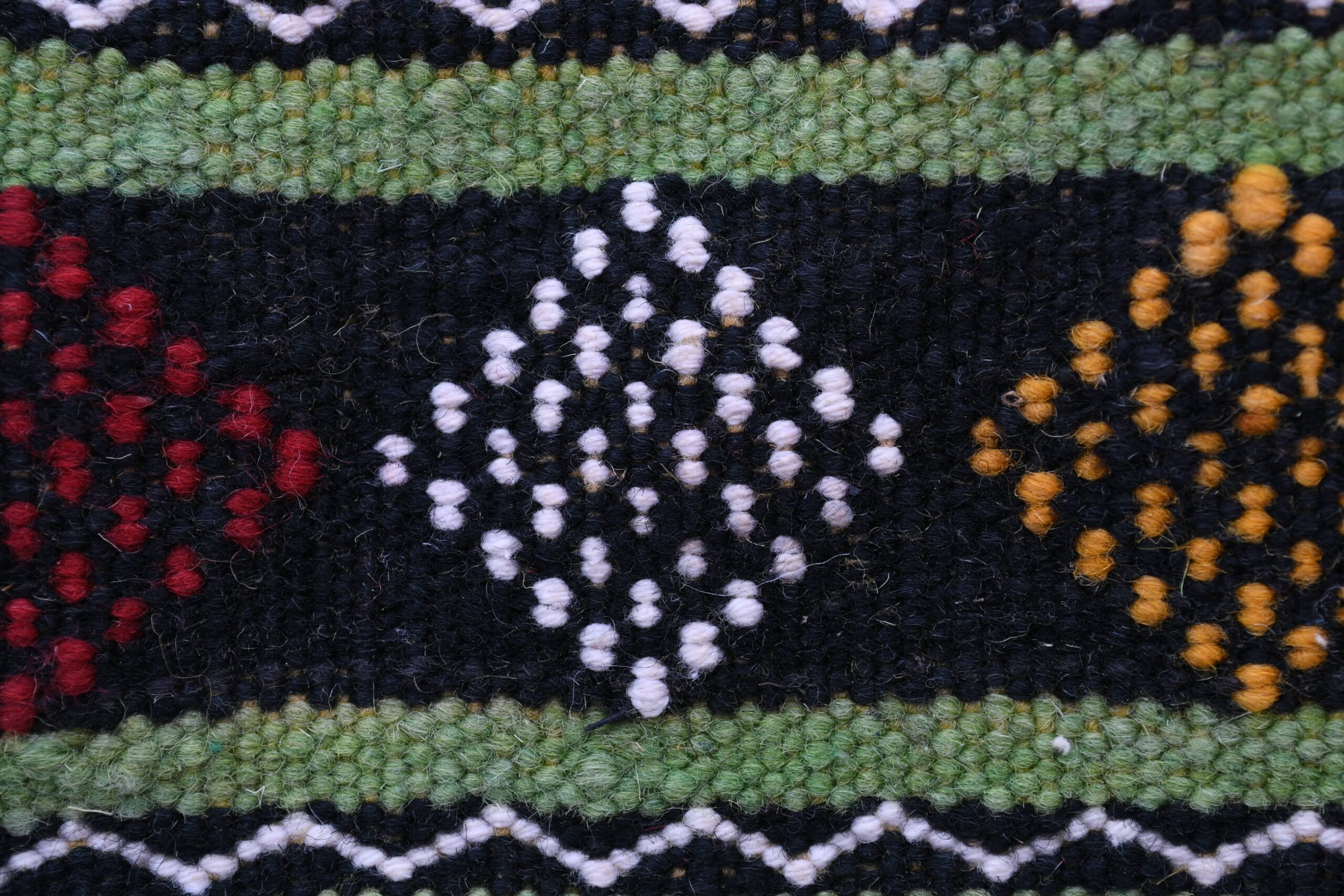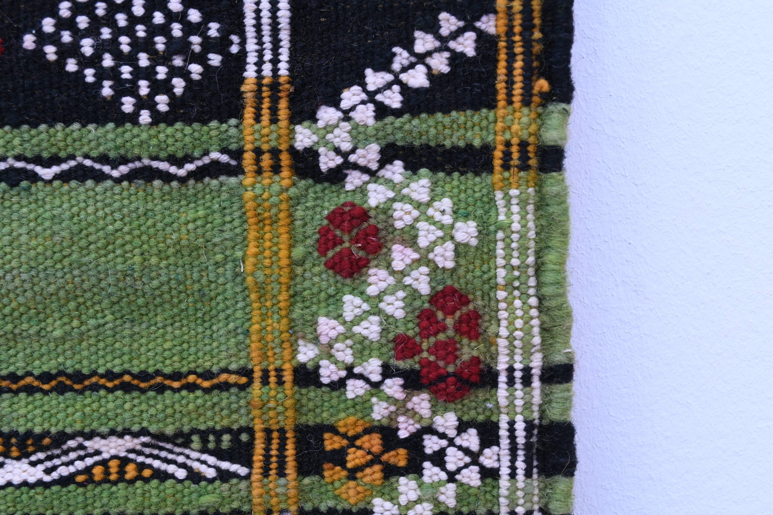 このラグの鮮やかなカラーパレットには、緑、深みのある黒、深みのある赤、そして温かみのある黄色が含まれています。これらの色彩は丁寧に織り合わされ、視覚的に印象的なコントラストを生み出し、どんなお部屋の美しさも高めます。