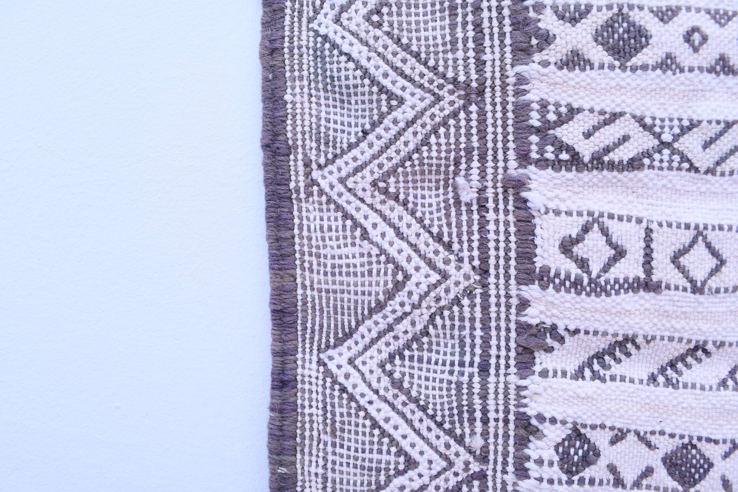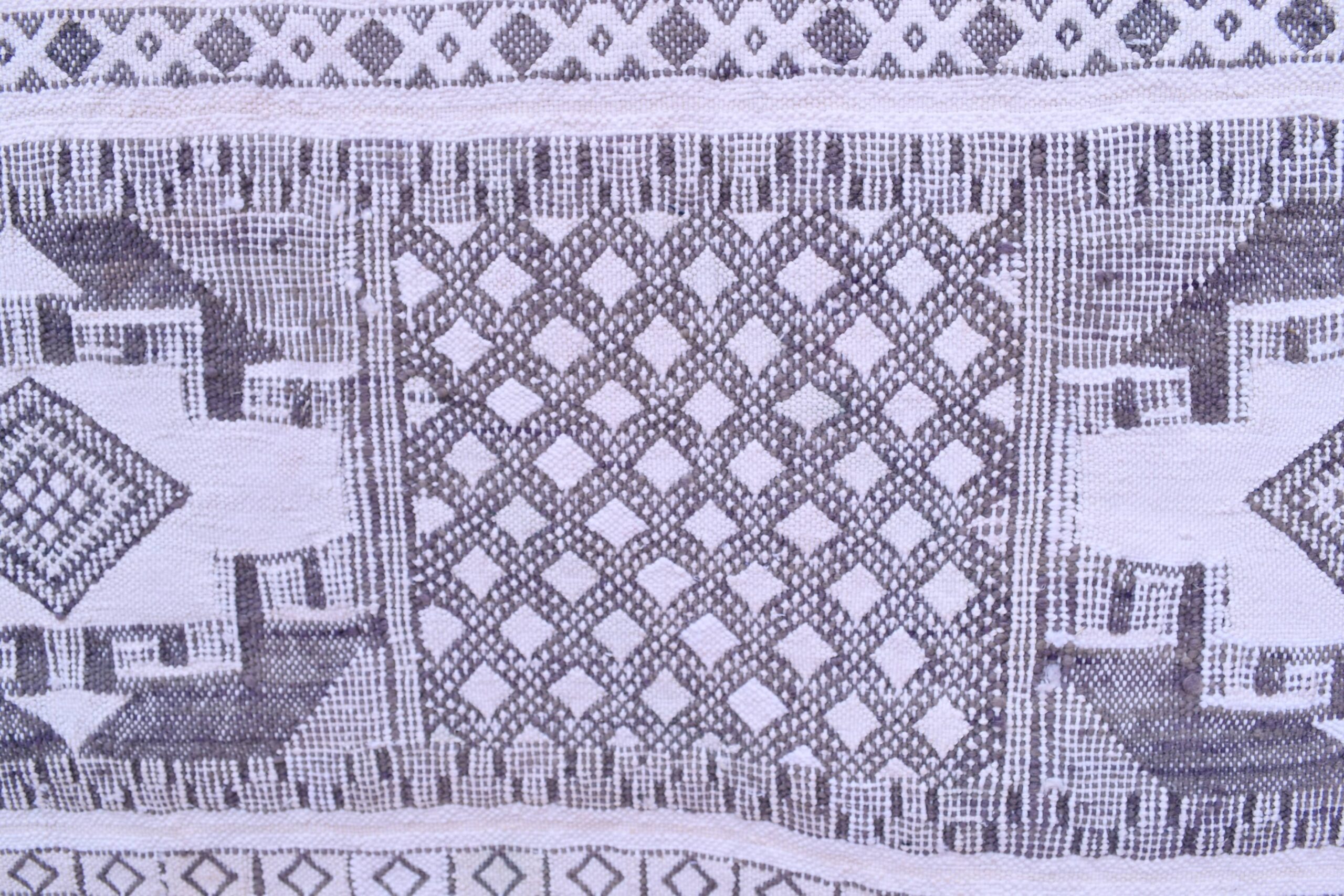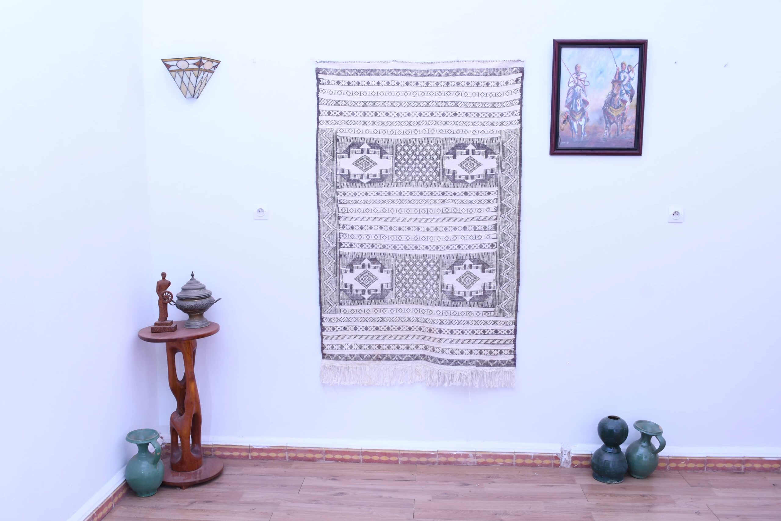 高品質のウールから手織りされたこのティフレット・キリム・ラグは、卓越した職人技が光ります。緻密な織り技術により、耐久性と柔らかな風合いが実現され、快適さと長寿命を実現しています。その職人技による品質は、豊かな文化遺産を反映しています。 モロッコ絨毯-作る。