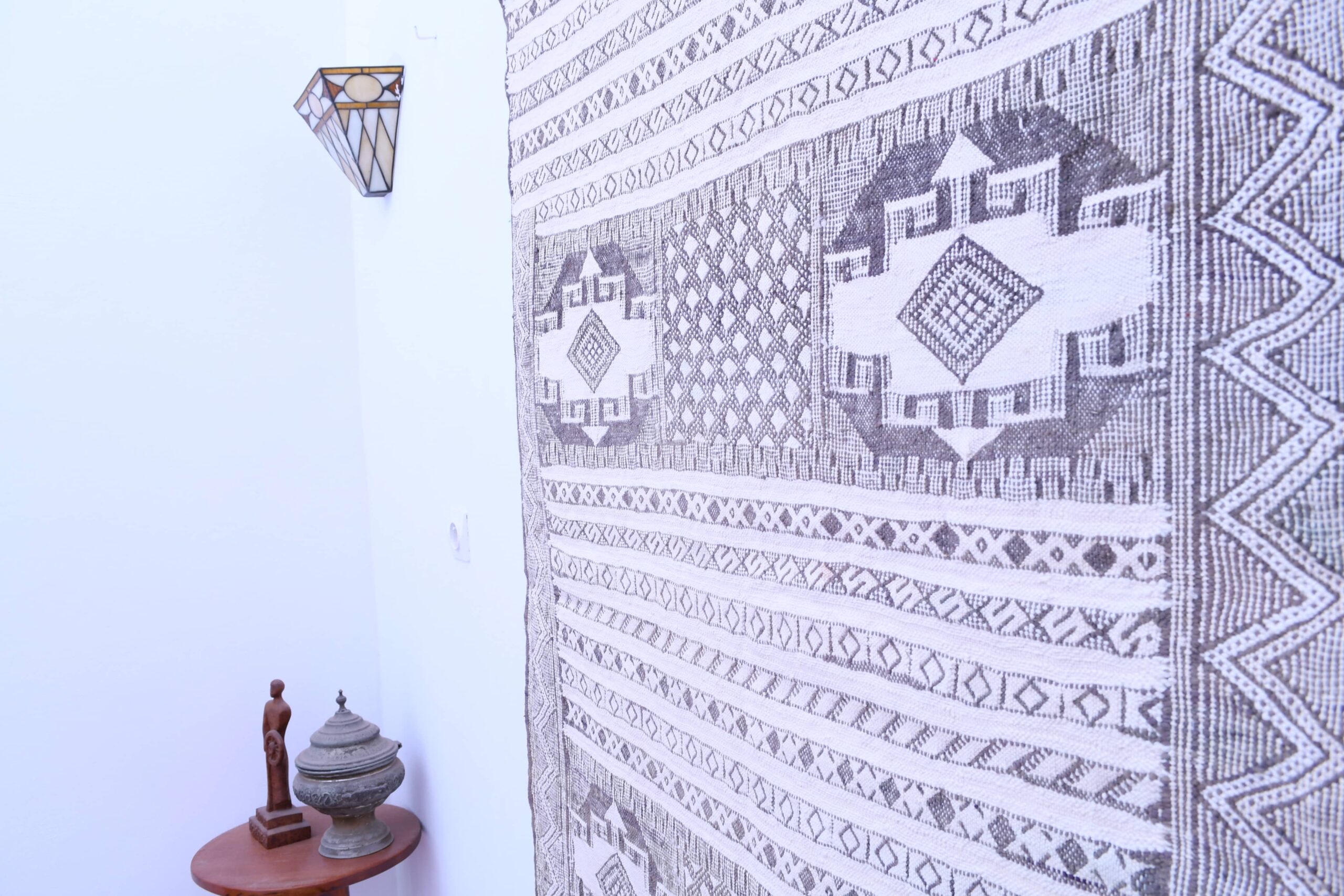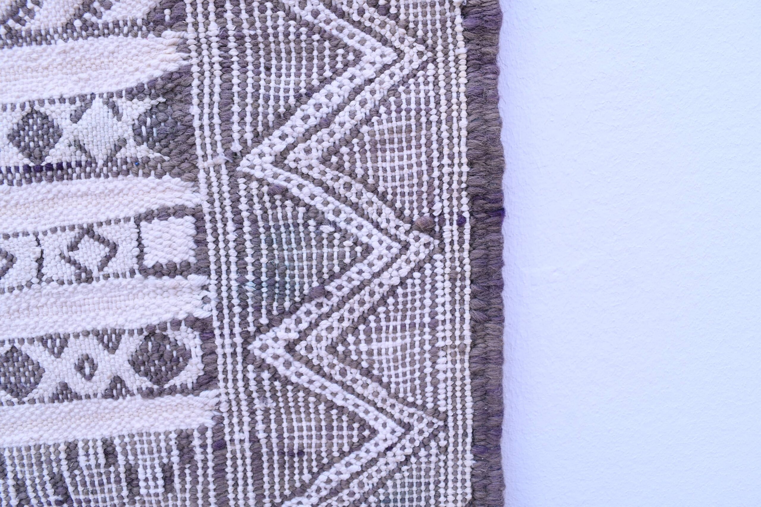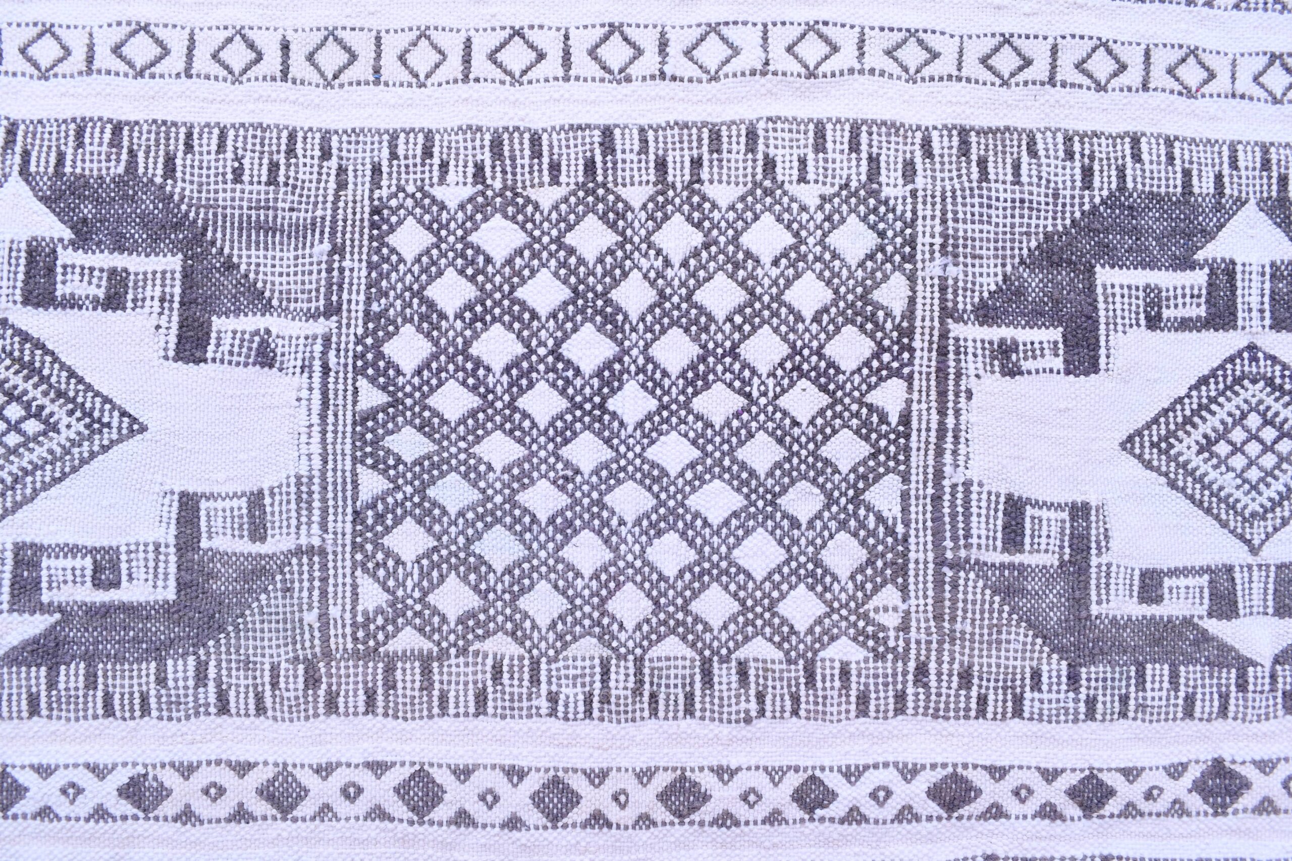 高品質のウールから手織りされたこのティフレット・キリム・ラグは、卓越した職人技が光ります。緻密な織り技術により、耐久性と柔らかな風合いが実現され、快適さと長寿命を実現しています。その職人技による品質は、豊かな文化遺産を反映しています。 モロッコ絨毯-作る。